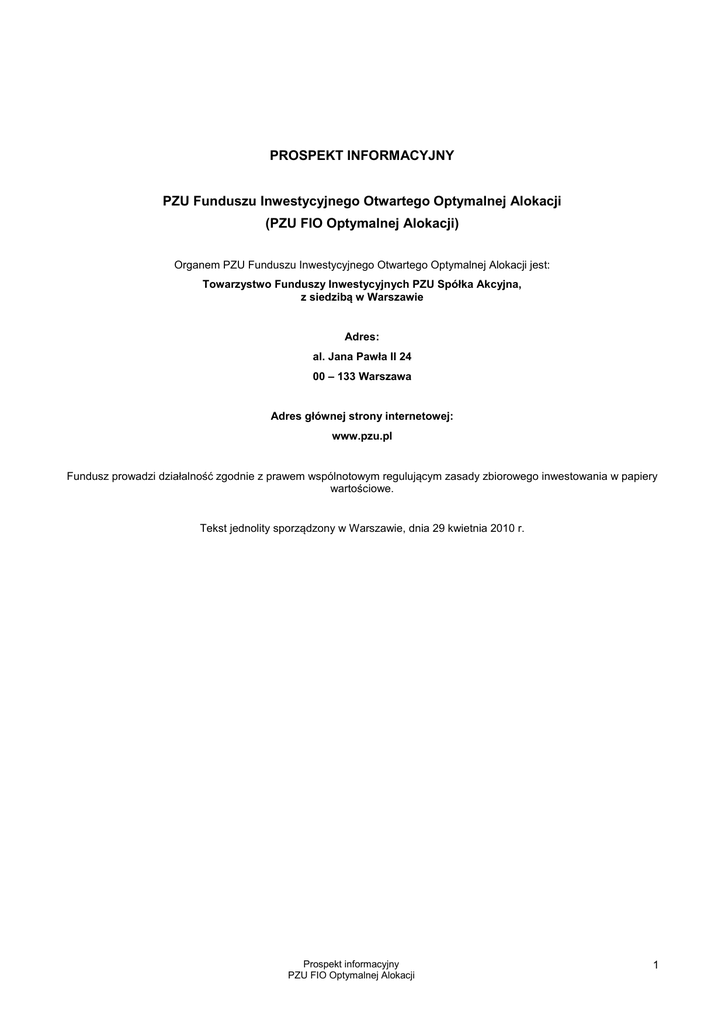 PROSPEKT INFORMACYJNY PZU Funduszu Inwestycyjnego Otwartego Optymalnej Alokacji (PZU FIO Optymalnej Alokacji) Organem PZU Funduszu Inwestycyjnego Otwartego Optymalnej Alokacji jest: Towarzystwo Funduszy Inwestycyjnych PZU Spółka Akcyjna, z siedzibą w Warszawie Adres: al. Jana Pawła II 24 00 – 133 Warszawa Adres głównej strony internetowej: www.pzu.pl Fundusz prowadzi działalność zgodnie z prawem wspólnotowym regulującym zasady zbiorowego inwestowania w papiery wartościowe. Tekst jednolity sporządzony w Warszawie, dnia 29 kwietnia 2010 r. Prospekt informacyjny PZU FIO Optymalnej Alokacji 1 ROZDZIAŁ I. OSOBY ODPOWIEDZIALNE ZA INFORMACJE ZAWARTE W PROSPEKCIE 1. Firma, siedziba i adres Towarzystwa Podmiotem sporządzającym Prospekt jest Towarzystwo Funduszy Inwestycyjnych PZU Spółka Akcyjna z siedzibą w Warszawie, działające pod adresem: al. Jana Pawła II 24, 00-133 Warszawa. Imiona i nazwiska osób fizycznych działających w imieniu Towarzystwa 2. W imieniu Towarzystwa działają: 1) Piotr Góralewski – Prezes Zarządu Towarzystwa, 2) Piotr Broda – Wiceprezes Zarządu Towarzystwa. 3. Oświadczenia o odpowiedzialności osób wymienionych w pkt 2 Niniejszym oświadczam, że informacje zawarte w Prospekcie są prawdziwe i rzetelne oraz nie pomijają żadnych faktów ani okoliczności, których ujawnienie w Prospekcie jest wymagane przepisami Ustawy o funduszach inwestycyjnych i rozporządzenia Ministra Finansów z dnia 20 stycznia 2009 r. w sprawie prospektu informacyjnego funduszu inwestycyjnego otwartego oraz specjalistycznego funduszu inwestycyjnego otwartego, a także skrótu tego prospektu (Dz.U. Nr 17, poz. 88), a także, że wedle mojej najlepszej wiedzy, nie istnieją, poza ujawnionymi w Prospekcie, okoliczności, które mogłyby wywrzeć znaczący wpływ na sytuację prawną, majątkową i finansową Funduszu. ............................................................ .................................................................. Piotr Góralewski – Prezes Zarządu Piotr Broda – Wiceprezes Zarządu ROZDZIAŁ II. DANE O TOWARZYSTWIE 1. Firma, kraj siedziby, siedziba, adres oraz inne dane Towarzystwa Firma: Towarzystwo Funduszy Inwestycyjnych PZU Spółka Akcyjna Kraj siedziby: Rzeczpospolita Polska Siedziba: Warszawa Adres: al. Jana Pawła II 24, 00-133 Warszawa Telefon: (22) 582 45 43 Faks: (22) 582 21 51 Adres strony internetowej: www.pzu.pl Adres poczty elektronicznej: [email protected] 2. Data zezwolenia na wykonywanie działalności przez Towarzystwa Towarzystwo Funduszy Inwestycyjnych PZU Spółka Akcyjna z siedzibą w Warszawie zostało utworzone i działa na podstawie decyzji Komisji Papierów Wartościowych i Giełd z dnia 30 kwietnia 1999 r., w sprawie udzielenia Powszechnemu Zakładowi Ubezpieczeń na Życie S.A. z siedzibą w Warszawie zezwolenia na utworzenie Towarzystwa Funduszy Inwestycyjnych PZU Spółka Akcyjna. 3. Oznaczenie sądu rejestrowego i numer, pod którym Towarzystwo jest zarejestrowane Sąd Rejonowy dla m. st. Warszawy, Sąd Gospodarczy, XII Wydział Gospodarczy – Krajowego Rejestru Sądowego nr KRS 0000019102. 4. Wysokość kapitału własnego Towarzystwa, w tym wysokość składników kapitału własnego na ostatni dzień bilansowy Wysokość kapitału własnego Towarzystwa na dzień 31 grudnia 2009 r. wyniosła 36 427 515,10 zł. Na kapitał własny składają się: kapitał podstawowy (zakładowy) kapitał zapasowy kapitał z aktualizacji wyceny wynik finansowy (zysk) netto za rok 2009 13 000 000,00 zł 14 131 489,22 zł 383 123,69 zł 8 912 902,19 zł Prospekt informacyjny PZU FIO Optymalnej Alokacji 2 5. Informacja o tym, że kapitał zakładowy Towarzystwa został opłacony Kapitał zakładowy Towarzystwa został w całości opłacony gotówką przez Powszechny Zakład Ubezpieczeń na Życie S.A. 6. Firma i siedziba podmiotu dominującego wobec Towarzystwa, ze wskazaniem cech tej dominacji oraz firma i siedziba akcjonariuszy Towarzystwa, posiadających co najmniej 5% ogólnej liczby głosów na walnym zgromadzeniu Podmiotem dominującym wobec Towarzystwa jest Powszechny Zakład Ubezpieczeń na Życie S.A. z siedzibą w Warszawie, posiadający 100% ogólnej liczby głosów na walnym zgromadzeniu Towarzystwa. Podmiotem dominującym wobec Towarzystwa oraz w stosunku do Powszechnego Zakładu Ubezpieczeń na Życie S.A. jest Powszechny Zakład Ubezpieczeń Spółka Akcyjna z siedzibą w Warszawie, posiadający 100% ogólnej liczby głosów na walnym zgromadzeniu Powszechnego Zakładu Ubezpieczeń na Życie S.A. Jedynym akcjonariuszem Towarzystwa, posiadającym 100% ogólnej liczby głosów na walnym zgromadzeniu, jest Powszechny Zakład Ubezpieczeń na Życie Spółka Akcyjna z siedzibą w Warszawie. 7. Imiona i nazwiska: 7.1. członków Zarządu Towarzystwa, ze wskazaniem pełnionych funkcji w Zarządzie Zarząd Towarzystwa składa się z następujących osób: 1) Piotr Góralewski – Prezes Zarządu, 2) Piotr Broda – Wiceprezes Zarządu. 7.2. członków Rady Nadzorczej Towarzystwa, ze wskazaniem przewodniczącego Rada Nadzorcza składa się z następujących osób: 1) Witold Jaworski – Przewodniczący Rady, 2) Dariusz Krzewina, 3) Piotr Jastrzębski, 4) Przemysław Dąbrowski. 7.3. osób fizycznych zarządzających funduszem Osobami fizycznymi zarządzającymi Funduszem są: Robert Rafał, Marcin Szuba oraz Jacek Osowski. 8. Informacje o pełnionych przez osoby, o których mowa pkt. 7 funkcjach poza Towarzystwem, jeżeli okoliczność ta może mieć znaczenie dla sytuacji Uczestników Funduszu 8.1. Zarząd Towarzystwa 1) Piotr Góralewski – Prezes Zarządu Piotr Góralewski pełni równocześnie funkcję Prezesa Zarządu PZU Asset Management S.A., domu maklerskiego, który zarządza portfelami inwestycyjnymi funduszy inwestycyjnych zarządzanych przez Towarzystwo oraz portfelami innych podmiotów. Poza tym Piotr Góralewski nie pełni innych funkcji, które mogłyby mieć znaczenie dla sytuacji Uczestników 
