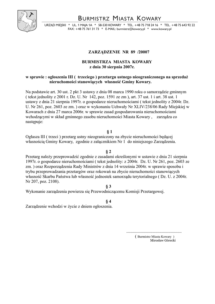 ZARZĄDZENIE NR 89 /20007 BURMISTRZA MIASTA KOWARY z