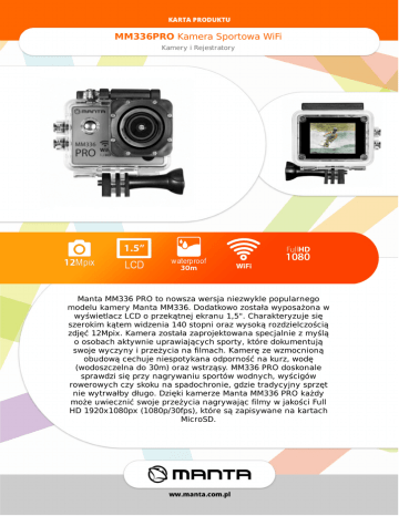 MM336PROKameraSportowaWiFi KameryiRejestratory MantaMM336PROtonowszawersjaniezwyklepopularnego modelukameryMantaMM336.Dodatkowozostaławyposażonaw wyświetlaczLCDoprzekątnejekranu1,5".Charakteryzujesię szerokimkątemwidzenia140stopniorazwysokąrozdzielczością zdjęć12Mpix.Kamerazostałazaprojektowanaspecjalniezmyślą oosobachaktywnieuprawiającychsporty,któredokumentują swojewyczynyiprzeżycianafilmach.Kameręzewzmocnioną obudowącechujeniespotykanaodpornośćnakurz,wodę (wodoszczelnado30m)orazwstrząsy.MM336PROdoskonale sprawdzisięprzynagrywaniusportówwodnych,wyścigów rowerowychczyskokunaspadochronie,gdzietradycyjnysprzęt niewytrwałbydługo.DziękikamerzeMantaMM336PROkażdy możeuwiecznićswojeprzeżycianagrywającfilmywjakościFull HD1920x1080px(1080p/30fps),któresązapisywanenakartach MicroSD. MM336PROKameraSportowaWiFi KameryiRejestratory Specyfikacja Łatwośćmontażu,niewielkiewymiary (60x41x30mm)orazwagazaledwie80gsprawiają, żemożnazabraćtourządzenienawakacyjny wyjazd,wyprawęrowerowączywypadnurkowy, gdyżbezproblemuzmieścisięwkażdym bagażu.Obsługakameryjestniezwykleprostai intuicyjna.Możnająprogramowaćwdwojaki sposób–bezpośredniopoprzezkolorowy wyświetlaczLCDlubzapośrednictwem smartfonu/tabletu,przypomocydedykowanej, darmowejaplikacji,którąmożemyściągnąćz GooglePlaylubAppStore. ŁącznośćzkamerąodbywasiępoprzezWi-Fi, dziękiczemumożnapodglądaćobraznażywo, sterowaćfunkcjaminagrywania,odtwarzaniai robieniazdjęć.Bezpośredniepołączenieze smartfonemlubtabletempomagarównieżw ustawieniuodpowiedniegokadruzamontowanejna kaskulubkierownicyroweru,quadaimotocykla. PrzybrakuurządzeniawyposażonegowWiFi zdalnąobsługęumożliwiadołączonydozestawu pilot(wersja2015,wersja2016niemapilota). Specjalnaoptykaokąciewidzenia140stopniw połączeniuzaparatem12Mpixdajeświetne szerokokątnezdjęciaifilmy,któremożnaprzesłać przezWiFidosmartfonaitamjezarchiwizowaćlub zpomocąkablaHDMIoglądaćnatelewizorzelub monitorze. HDMI MicroHDMItypD Zasilanie akumulator900mAhLi-on Wymiary(SxWxG) 60x41x30mm Waga 80g Systemoperacyjny WindowsXP/Vista/Win7/Macos Wi-Fi TAK Gniazdokartpamięci MicroSD(Max32GB) GniazdoUSB TAK Typkamery Kamerasportowa Trybyrejestracji filmyizdjęcia Wyświetlacz TFTLCD1,5''kolorowy Rozdzielczościwideo 1920x1080(1080p/30fps),1280x720 (720p/60fps),848x480(VGA/60fps), 640x480(QVGA/60fps) Rozdzielczościzdjęć 12Mpx Formatynagrywaniawideo H.264 Formatynagrywaniazdjęć JPG Kątwidzenia 140° Wodoszczelność 30mwspecjalnymfuterale Dodatkowewyposażenie wodoodpornaobudowa(do30m),2 uchwyty,kabelUSB Dodatkowefunkcje http://www.manta.com.pl/pl/mm336pro EAN:5907377865766