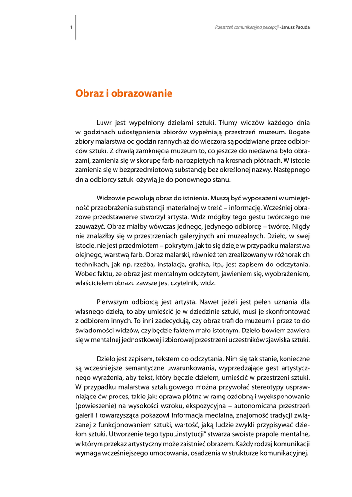 1 Przestrzeń komunikacyjna percepcji • Janusz Pacuda Obraz i obrazowanie Luwr jest wypełniony dziełami sztuki. Tłumy widzów każdego dnia w godzinach udostępnienia zbiorów wypełniają przestrzeń muzeum. Bogate zbiory malarstwa od godzin rannych aż do wieczora są podziwiane przez odbiorców sztuki. Z chwilą zamknięcia muzeum to, co jeszcze do niedawna było obrazami, zamienia się w skorupę farb na rozpiętych na krosnach płótnach. W istocie zamienia się w bezprzedmiotową substancję bez określonej nazwy. Następnego dnia odbiorcy sztuki ożywią je do ponownego stanu. Widzowie powołują obraz do istnienia. Muszą być wyposażeni w umiejętność przeobrażenia substancji materialnej w treść – informację. Wcześniej obrazowe przedstawienie stworzył artysta. Widz mógłby tego gestu twórczego nie zauważyć. Obraz miałby wówczas jednego, jedynego odbiorcę – twórcę. Nigdy nie znalazłby się w przestrzeniach galeryjnych ani muzealnych. Dzieło, w swej istocie, nie jest przedmiotem – pokrytym, jak to się dzieje w przypadku malarstwa olejnego, warstwą farb. Obraz malarski, również ten zrealizowany w różnorakich technikach, jak np. rzeźba, instalacja, grafika, itp., jest zapisem do odczytania. Wobec faktu, że obraz jest mentalnym odczytem, jawieniem się, wyobrażeniem, właścicielem obrazu zawsze jest czytelnik, widz. Pierwszym odbiorcą jest artysta. Nawet jeżeli jest pełen uznania dla własnego dzieła, to aby umieścić je w dziedzinie sztuki, musi je skonfrontować z odbiorem innych. To inni zadecydują, czy obraz trafi do muzeum i przez to do świadomości widzów, czy będzie faktem mało istotnym. Dzieło bowiem zawiera się w mentalnej jednostkowej i zbiorowej przestrzeni uczestników zjawiska sztuki. Dzieło jest zapisem, tekstem do odczytania. Nim się tak stanie, konieczne są wcześniejsze semantyczne uwarunkowania, wyprzedzające gest artystycznego wyrażenia, aby tekst, który będzie dziełem, umieścić w przestrzeni sztuki. W przypadku malarstwa sztalugowego można przywołać stereotypy usprawniające ów proces, takie jak: oprawa płótna w ramę ozdobną i wyeksponowanie (powieszenie) na wysokości wzroku, ekspozycyjna – autonomiczna przestrzeń galerii i towarzysząca pokazowi informacja medialna, znajomość tradycji związanej z funkcjonowaniem sztuki, wartość, jaką ludzie zwykli przypisywać dziełom sztuki. Utworzenie tego typu „instytucji” stwarza swoiste prapole mentalne, w którym przekaz artystyczny może zaistnieć obrazem. Każdy rodzaj komunikacji wymaga wcześniejszego umocowania, osadzenia w strukturze komunikacyjnej. 2 Przestrzeń komunikacyjna percepcji • Janusz Pacuda Nawet niezbyt wyrafinowany artystycznie zapis malarski zrealizowany na płótnie, farbami olejnymi, oprawiony w ramy, będzie miał większe szanse akceptacji i kwalifikacji przez widza do kategorii dzieł zawierających się w przestrzeni sztuki niż instalacje, akcje plastyczne, działania intermedialne. Instytucje kulturalne, przekazy medialne, teksty krytyczne, świadomość dotycząca sztuki w jej aspekcie historycznym stają się tym kontekstem, który jest nie tyle tłem, na którym dzieło jest widoczne, co elementem struktury dzieła, kontekstem, przez który dzieło sztuki ustanawia się, z którego się wydobywa. Etym. - łac. perceptio‚ ujmowanie’, od percipere ‚ wziąć w posiadanie; otrzymać; zauważyć; odczuć’ [...]. W. Kopaliński, Słownik wyrazów obcych i zwrotów obcojęzycznych, „Wiedza Powszechna”, Warszawa 1994. 1 Akt percepcji1stanowi nas w Świecie, sprawia, że w nim uczestniczymy. Te same procesy percepcyjne utwierdzają nas w zjawiskach sztuki – w świecie człowieka. Jednak w percepcji sztuki widz może stać się uczestnikiem gdy partycypuje w odbiorze komunikatu artystycznego – z osoby widzącej stając się współtwórcą. Istotą recepcji komunikatów, w tym istotą sztuki, jest wkraczanie dyskursem w obszar mapy wszelkich mentalnych odniesień tworzenia sensu. U podstaw naszego bytowania w Świecie leży więź z nim na poziomie informacyjnym. Zdolności wiązania, spinania, dopełniania, wyodrębniania, dzielenia, abstrahowania – są właściwościami organizującymi akt wszelkiej percepcji. Stanowią podstawy językowego dostosowania, przylegania do Świata. Obecność słowa w percepcji uzmysławia, że służy nie tylko do komunikacji z ludźmi, ale że słowem bytujemy w Świecie. Język oralny wieńczący akt percepcji słowem jest jednym z języków niezbędnych w obrazowaniu Rzeczywistości. Logika, matematyka, geometria, język mówiony to niektóre spośród struktur językowych wzajemnie przenikające się w tworzeniu obrazu rzeczywistości. Żyjemy nie tyle poprzez używanie języków, ale żyjemy w wielu językach równocześnie, ponieważ nasze myślenie nimi się realizuje. Myślimy i postrzegamy językiem. Myślenie jest zatem aktem uczestnictwa w Świecie. Od szybkości procesów zaangażowanych w postrzeganie rzeczywistości zależy nasze być albo nie być. Nie są to jedyne mechanizmy służące umocowaniu w Świecie. Część z tych zjawisk jest poza świadomą percepcją, jak np. receptory kontroli temperatury, metabolizmu i wszelkich czynności fizjologicznych. W wyniku procesu postrzegania Świata powstaje w umyśle jego obraz. Obrazowanie jest aktem pozyskania obrazu. Chociaż doświadczeniem osoby otwierającej oczy jest natychmiastowe widzenie rzeczywistości, to w organizmie uruchomiony został ciąg procesów związanych z widzeniem. W oku nie ma obrazu wizualnego rzutowanego na ekran siatkówki. Światło, które padło do oka, oddziałuje na receptory siatkówki, pobudzając je zmiennym natężeniem światła pojawiającym się wskutek mimowolnego ruchu gałek ocznych, jak i ruchu otoczenia. Światło kodowane w formie elektrochemicznych impulsów, przetwarzane w mózgu, jawi się obrazem i sensem w mentalnej projekcji. Obraz nie jest realnością