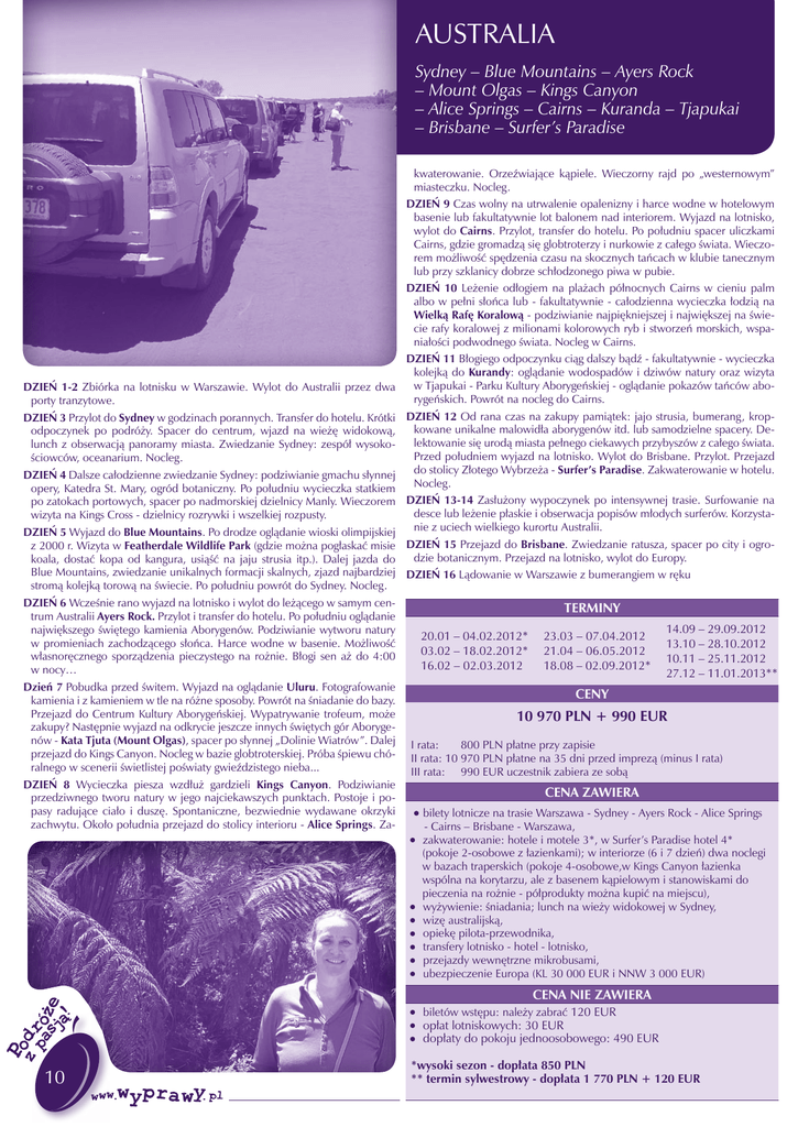 AUSTRALIA Sydney – Blue Mountains – Ayers Rock – Mount Olgas – Kings Canyon – Alice Springs – Cairns – Kuranda – Tjapukai – Brisbane – Surfer’s Paradise kwaterowanie. Orzeźwiające kąpiele. Wieczorny rajd po „westernowym” miasteczku. Nocleg. Dzień 9 Czas wolny na utrwalenie opalenizny i harce wodne w hotelowym basenie lub fakultatywnie lot balonem nad interiorem. Wyjazd na lotnisko, wylot do Cairns. Przylot, transfer do hotelu. Po południu spacer uliczkami Cairns, gdzie gromadzą się globtroterzy i nurkowie z całego świata. Wieczorem możliwość spędzenia czasu na skocznych tańcach w klubie tanecznym lub przy szklanicy dobrze schłodzonego piwa w pubie. Dzień 10 Leżenie odłogiem na plażach północnych Cairns w cieniu palm albo w pełni słońca lub - fakultatywnie - całodzienna wycieczka łodzią na Wielką Rafę Koralową - podziwianie najpiękniejszej i największej na świecie rafy koralowej z milionami kolorowych ryb i stworzeń morskich, wspaniałości podwodnego świata. Nocleg w Cairns. Dzień 11 Błogiego odpoczynku ciąg dalszy bądź - fakultatywnie - wycieczka kolejką do Kurandy: oglądanie wodospadów i dziwów natury oraz wizyta w Tjapukai - Parku Kultury Aborygeńskiej - oglądanie pokazów tańców aboDzień 1-2 Zbiórka na lotnisku w Warszawie. Wylot do Australii przez dwa rygeńskich. Powrót na nocleg do Cairns. porty tranzytowe. Dzień 3 Przylot do Sydney w godzinach porannych. Transfer do hotelu. Krótki Dzień 12 Od rana czas na zakupy pamiątek: jajo strusia, bumerang, kropkowane unikalne malowidła aborygenów itd. lub samodzielne spacery. Deodpoczynek po podróży. Spacer do centrum, wjazd na wieżę widokową, lektowanie się urodą miasta pełnego ciekawych przybyszów z całego świata. lunch z obserwacją panoramy miasta. Zwiedzanie Sydney: zespół wysokoPrzed południem wyjazd na lotnisko. Wylot do Brisbane. Przylot. Przejazd ściowców, oceanarium. Nocleg. do stolicy Złotego Wybrzeża - Surfer’s Paradise. Zakwaterowanie w hotelu. Dzień 4 Dalsze całodzienne zwiedzanie Sydney: podziwianie gmachu słynnej Nocleg. opery, Katedra St. Mary, ogród botaniczny. Po południu wycieczka statkiem po zatokach portowych, spacer po nadmorskiej dzielnicy Manly. Wieczorem Dzień 13-14 Zasłużony wypoczynek po intensywnej trasie. Surfowanie na desce lub leżenie płaskie i obserwacja popisów młodych surferów. Korzystawizyta na Kings Cross - dzielnicy rozrywki i wszelkiej rozpusty. nie z uciech wielkiego kurortu Australii. Dzień 5 Wyjazd do Blue Mountains. Po drodze oglądanie wioski olimpijskiej z 2000 r. Wizyta w Featherdale Wildlife Park (gdzie można pogłaskać misie Dzień 15 Przejazd do Brisbane. Zwiedzanie ratusza, spacer po city i ogrodzie botanicznym. Przejazd na lotnisko, wylot do Europy. koala, dostać kopa od kangura, usiąść na jaju strusia itp.). Dalej jazda do Blue Mountains, zwiedzanie unikalnych formacji skalnych, zjazd najbardziej Dzień 16 Lądowanie w Warszawie z bumerangiem w ręku stromą kolejką torową na świecie. Po południu powrót do Sydney. Nocleg. Dzień 6 Wcześnie rano wyjazd na lotnisko i wylot do leżącego w samym centrum Australii Ayers Rock. Przylot i transfer do hotelu. Po południu oglądanie największego świętego kamienia Aborygenów. Podziwianie wytworu natury w promieniach zachodzącego słońca. Harce wodne w basenie. Możliwość własnoręcznego sporządzenia pieczystego na rożnie. Błogi sen aż do 4:00 w nocy… Dzień 7 Pobudka przed świtem. Wyjazd na oglądanie Uluru. Fotografowanie kamienia i z kamieniem w tle na różne sposoby. Powrót na śniadanie do bazy. Przejazd do Centrum Kultury Aborygeńskiej. Wypatrywanie trofeum, może zakupy? Następnie wyjazd na odkrycie jeszcze innych świętych gór Aborygenów - Kata Tjuta (Mount Olgas), spacer po słynnej „Dolinie Wiatrów”. Dalej przejazd do Kings Canyon. Nocleg w bazie globtroterskiej. Próba śpiewu chóralnego w scenerii świetlistej poświaty gwieździstego nieba... Dzień 8 Wycieczka piesza wzdłuż gardzieli Kings Canyon. Podziwianie przedziwnego tworu natury w jego najciekawszych punktach. Postoje i popasy radujące ciało i duszę. Spontaniczne, bezwiednie wydawane okrzyki zachwytu. Około południa przejazd do stolicy interioru - Alice Springs. Za- TERMINY 20.01 – 04.02.2012* 03.02 – 18.02.2012* 16.02 – 02.03.2012 23.03 – 07.04.2012 21.04 – 06.05.2012 18.08 – 02.09.2012* 14.09 – 29.09.2012 13.10 – 28.10.2012 10.11 – 25.11.2012 27.12 – 11.01.2013** CENY 10 970 PLN + 990 EUR I rata: 800 PLN płatne przy zapisie II rata: 10 970 PLN płatne na 35 dni przed imprezą (minus I rata) III rata: 990 EUR uczestnik zabiera ze sobą CENA ZAWIERA · bilety lotnicze na trasie Warszawa - Sydney - Ayers Rock - Alice Springs - Cairns – Brisbane - Warszawa, · zakwaterowanie: hotele i motele 3*, w Surfer’s Paradise hotel 4* (pokoje 2-osobowe z łazienkami); w interiorze (6 i 7 dzień) dwa noclegi w bazach traperskich (pokoje 4-osobowe,w Kings Canyon łazienka wspólna na korytarzu, ale z basenem kąpielowym i stanowiskami do pieczenia na rożnie - półprodukty można kupić na miejscu), · wyżywienie: śniadania; lunch na wieży widokowej w Sydney, · wizę australijską, · opiekę pilota-przewodnika, · transfery lotnisko - hotel - lotnisko, · przejazdy wewnętrzne mikrobusami, · ubezpieczenie Europa (KL 30 000 EUR i NNW 3 000 EUR) CENA NIE ZAWIERA · biletów wstępu: należy zabrać 120 EUR · opłat lotniskowych: 30 EUR · dopłaty do pokoju jednoosobowego: 490 EUR 10 *wysoki sezon - dopłata 850 PLN ** termin sylwestrowy - dopłata 1 770 PLN + 120 EUR