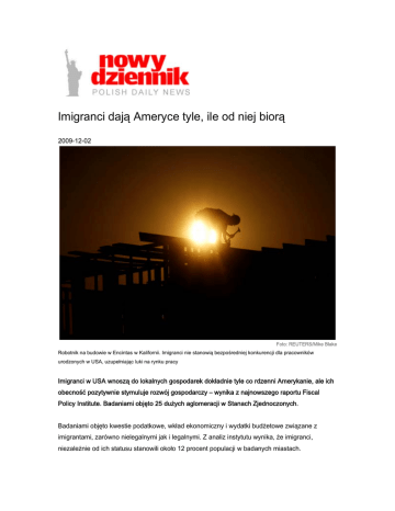 Imigranci dają Ameryce tyle, ile od niej biorą 2009-12-02 Foto: REUTERS/Mike Blake Robotnik na budowie w Encintas w Kalifornii. Imigranci nie stanowią bezpośredniej konkurencji dla pracowników urodzonych w USA, uzupełniając luki na rynku pracy Imigranci w USA wnoszą do lokalnych gospodarek dokładnie tyle co rdzenni Amerykanie, ale ich obecność pozytywnie stymuluje rozwój gospodarczy – wynika z najnowszego raportu Fiscal Policy Institute. Badaniami objęto 25 dużych aglomeracji w Stanach Zjednoczonych. Badaniami objęto kwestie podatkowe, wkład ekonomiczny i wydatki budżetowe związane z imigrantami, zarówno nielegalnymi jak i legalnymi. Z analiz instytutu wynika, że imigranci, niezależnie od ich statusu stanowili około 12 procent populacji w badanych miastach. Równocześnie generowali 12 procent produktu gospodarczego w swoim regionie. Ten stosunek 1:1 jest charakterystyczny dla wszystkich badanych aglomeracji – twierdzą autorzy badań. Raport wykazał również, że rozwój gospodarczy jest bezpośrednio związany ze wzrostem liczby imigrantów. Jednocześnie imigranci nie stanowią bezpośredniej konkurencji dla pracowników urodzonych w USA, uzupełniając luki na rynku pracy. "Pod tym względem imigranci stymulują lokalną gospodarkę" – twierdzi komentując raport Marilyn Zayas Davis, adwokatka imigracyjna z Cincinati. Według Fiscal Policy Institute, ponadpartyjnej organizacji działającej w Nowym Jorku (według mediów z lekkim odchyleniem liberalnym) w aglomeracjach objętych badaniem imigranci stanowili około 14 procent całego rynku pracy. Odnosili przy tym sukcesy, znajdując wyżej opłacane prace dla profesjonalistów, inżynierów, lekarzy i prawników. W grupie wykwalifikowanych pracowników stanowili 13 procent populacji, zwykle zarabiając więcej niż ich urodzeni w USA koledzy. "Imigrantów można spotkać we wszystkich punktach spektrum dochodów. Są oni bardziej powiązany z rozwojem gospodarczym, niż sobie z tego zdajemy na co dzień sprawę" – uważa Joy Margheim z Oregon Center for Public Policy. David Kallick, dyrektor organizacji Immigration Research Initiative uważa, że wyniki badań powinny stanowić argument za przeprowadzeniem w Kongresie kompleksowej reformy imigracyjnej. Biały Dom obiecał rozpoczęcie debaty nad nową legislacją jeszcze przed końcem roku. Nowy Dziennik 2009-12-02 2