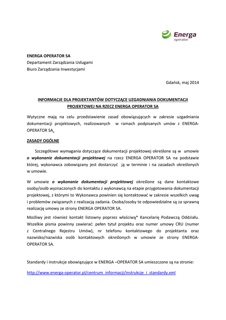 ENERGA OPERATOR SA Departament Zarządzania Usługami Biuro Zarządzania Inwestycjami Gdańsk, maj 2014 INFORMACJE DLA PROJEKTANTÓW DOTYCZĄCE UZGADNIANIA DOKUMENTACJI PROJEKTOWEJ NA RZECZ ENERGA OPERATOR SA Wytyczne mają na celu przedstawienie zasad obowiązujących w zakresie uzgadniania dokumentacji projektowych, realizowanych w ramach podpisanych umów z ENERGAOPERATOR SA. ZASADY OGÓLNE Szczegółowe wymagania dotyczące dokumentacji projektowej określone są w umowie o wykonanie dokumentacji projektowej na rzecz ENERGA OPERATOR SA na podstawie której, wykonawca zobowiązany jest dostarczyć ją w terminie i na zasadach określonych w umowie. W umowie o wykonanie dokumentacji projektowej określone są dane kontaktowe osoby/osób wyznaczonych do kontaktu z wykonawcą na etapie przygotowania dokumentacji projektowej, z którymi to Wykonawca powinien się kontaktować w zakresie wszelkich uwag i problemów związanych z realizacją zadania. Osoba/osoby te odpowiedzialne są za sprawną realizację umowy ze strony ENERGA OPERATOR SA. Możliwy jest również kontakt listowny poprzez właściwą* Kancelarię Podawczą Oddziału. Wszelkie pisma powinny zawierać: pełen tytuł projektu oraz numer umowy CRU (numer z Centralnego Rejestru Umów), nr telefonu kontaktowego do projektanta oraz nazwisko/nazwiska osób kontaktowych określonych w umowie ze strony ENERGAOPERATOR SA. Standardy i instrukcje obowiązujące w ENERGA –OPERATOR SA umieszczone są na stronie: http://www.energa-operator.pl/centrum_informacji/instrukcje_i_standardy.xml GŁÓWNE ETAPY UZGADNIANIA PRZEZ WYKONAWCĘ DOKUMENTACJI PROJEKTOWEJ W ENERGA OPERATOR SA: Uzgodnienie koncepcji projektowej Wykonawca po otrzymaniu zlecenia na opracowanie dokumentacji projektowej, oraz przygotowaniu koncepcji realizacji projektu uzgadnia ją, umawiając się telefonicznie poprzez osobę kontaktową wskazaną w umowie z osobami dokonującymi takich uzgodnień lub składając/wysyłając dokumentację wraz z załącznikami oraz pismem przewodnim zawierającym m.in. pełen tytuł projektu wraz z nr OBI/OBM, numer umowy łącznie z numerem CRU, nr telefonu kontaktowego do wykonawcy oraz nazwisko/nazwiska osób kontaktowych określonych w umowie ze strony ENERGA-OPERATOR SA, do właściwej* Kancelarii Podawczej Oddziału, w zależności o zakresu koniecznych uzgodnień. Pismo przewodnie powinno być nadane przez podmiot z którym została zawarta umowa o realizację prac projektowych. Uzgodnienie przekazanej koncepcji projektu jest realizowane nie dłużej niż 10 dni roboczych. W uzasadnionych wypadkach możliwie jest wydłużenie tego terminu po uprzednim poinformowaniu wykonawcy wraz z informacją o nowym terminie uzgodnienia/zgłoszenia uwag. Pozyskanie tytułów prawnych do nieruchomości na etapie projektowania Pozyskiwanie tytułów prawnych na potrzeby opracowywanego projektu budowlanego następuje na podstawie obowiązujących w ENERGA OPERATOR SA wytycznych opracowane na podstawie „Procedury nabywania praw do nieruchomości dla istniejących i projektowanych urządzeń elektroenergetycznych”. które udostępniane są wykonawcy podpisaniu dodatkowego poświadczenia o zachowaniu poufności. Uzgodnienia dotyczące pozyskiwania tytułów prawnych do nieruchomości wykonawca dokonuje bądź poprzez kontakt telefoniczny lub osobisty z osobą wyznaczoną w umowie lub składając pismo przewodnie zawierające m.in. pełen tytuł projektu wraz z nr OBI/OMB, numer umowy łącznie z numerem CRU, nr telefonu kontaktowego do projektanta oraz nazwisko/nazwiska osób kontaktowych określonych w umowie ze strony ENERGAOPERATOR SA, wraz z załącznikami do właściwej* kancelarii podawczej Oddziału. Pismo przewodnie powinno być nadane przez podmiot z którym została zawarta umowa o realizację prac projektowych. Uzgodnienie dokumentacji projektowej Po przygotowaniu dokumentacji projektowej wykonawca zobowiązany jest do uzgodnienia dokumentacji projektowej. W tym zakresie wymagane jest przedłożenie dokumentacji osobiście lub drogą pocztową poprzez właściwą* Kancelarię Podawczą Oddziału. Wszelkie pisma w tym zakresie powinny zawierać m.in. pełen tytuł projektu wraz z nr OBI/OBM, numer umowy łącznie z numerem CRU, nr telefonu kontaktowego do wykonawcy oraz nazwisko/nazwiska osób kontaktowych określonych w umowie ze strony ENERGA-OPERATOR SA. Pismo przewodnie powinno być nadane przez podmiot z którym została zawarta umowa o realizację prac projektowych. W zależności od typu dokumentacji oraz poziomu napięcia projektowanej sieci (WN/SN/nN) dokumentacja jest uzgadniana przez następujący okres czasu (dni robocze): Dokumentacja dotycząca części: Abonenckiej Energa-Operator Linie WN, stacje transformatorowe WN/SN Linie SN, linie nN, stacje transformatorowe SN/nN Stacje WN/SN, linie WN (GPZ sieciowy) Linie SN Linie nN Stacje transformatorowe SN/nN 30 15 30 15 10 10 Pozostałe dokumentacje projektowe 30 Łączny czas na uzgodnienie dokumentacji obejmuje czas od chwili złożenia projektu w Kancelarii do czasu wysłania odpowiedzi do wykonawcy. Powyższe terminy nie dotyczą spraw, co do których podjęto decyzję o skierowaniu sprawy do rozpatrzenia przez zespół roboczy ds. weryfikacji dokumentacji projektowej. Dotyczy to sytuacji kiedy na etapie uzgadniania dokumentacji projektowej Kierownik Wydziału / Działu Dokumentacji Energetycznej dokonuje weryfikacji otrzymanych uzgodnień i w przypadku nierozstrzygnięcia uwag/wątpliwości do uzgadnianej dokumentacji podejmuje decyzję skierowaniu do rozpatrzenia przez zespół roboczy ds. weryfikacji dokumentacji projektowej. Decyzja taka jest podejmowana incydentalnie. W takim wypadku termin uzgodnienia może wydłużyć się o dodatkowe 7 dni roboczych. W przypadku stwierdzenia niezgodności w uzgadnianej dokumentacji projektowej dopuszczalne jest usunięcie usterek przez wykonawcę w terminie określonym przez osobę uzgadniającą ze strony ENERGA OPERATOR SA. W przyp