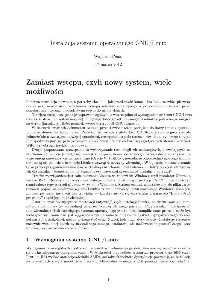 Instalacja systemu operacyjnego GNU/Linux Wojciech Penar 17 marca 2012 Zamiast wstępu, czyli nowy system, wiele możliwości Poniższa instrukcja powstała z potrzeby chwili — jak przedstawić komuś, kto Linuksa widzi pierwszy raz na oczy możliwości uruchomienia nowego systemu operacyjnego, a jednocześnie — ustrzec przed popularnymi błędami, prowadzącymi często do utraty danych. Niniejsza część poświęcona jest sprawom ogólnym, a w szczególności wymaganiom systemu GNU/Linux (bo tak ściśle się ten system nazywa). Obejmuje dobór sprzętu, wymagania odnośnie potrzebnego miejsca na dysku (instalacja), ilości pamięci, wybór dystrybucji GNU/Linux. . . W dalszych częściach dokumentu zostaną przedstawione różne podejścia do korzystania z systemu Linux na domowym komputerze. Pierwsze, to rozruch z płyty Live CD. Rozwiązanie najprostsze, ale jednocześnie narzucające najwięcej ograniczeń, szczególnie na polu sterowników dla nietypowego sprzętu (nie spodziewajmy się pełnego wsparcia akceleracji 3D czy co bardziej egzotycznych sterowników kart WiFi) czy obsługi języków narodowych. Drugie proponowane rozwiązanie to wykorzystanie technologii wirtualizacyjnych, pozwalających na uruchomienie Linuksa (i nie tylko) wewnątrz innego systemu operacyjnego. Wraz z dostępnością darmowego oprogramowania wirtualizacyjnego (Oracle VirtualBox), posiadacze odpowiednio mocnego komputera mogą się pokusić o instalację Linuksa wewnątrz maszyny wirtualnej. W tej części opisany zostanie tylko proces przygotowania maszyny wirtualnej i uruchomienie instalatora — dalszy opis jest identyczny jak dla instalacji bezpośrednio na komputerze (nazywanej przeze mnie “instalacją natywną”. Trzecim rozwiązaniem jest zainstalowanie Linuksa w środowisku Windows, czyli instalator Ubuntu o nazwie Wubi. Rozwiązanie to wymaga wolnego miejsca na istniejącej partycji FAT32 lub NTFS (czyli standardowe typy partycji używane w systemie Windows). System zostanie zainstalowany “do pliku”, a po restarcie pojawi się możliwość wyboru Linuksa ze standardowego menu startowego Windows. Usunięcie Linuksa po takiej instalacji jest trywialne — Linuksa usuwa się korzystając z narzędzia “Dodaj/Usuń programy” (bądź jego odpowiednika). Ostatnia część opisuje proces “instalacji natywnej”, czyli instalacji Linuksa na dysku twardym komputera (lub. . . maszyny wirtualnej) na przeznaczonej dla niego partycji. Przy instalacji “na sprzęcie” (nie wirtualnej) obok istniejącego systemu operacyjnego jest to dość skomplikowany proces i może być niebezpieczny. Konieczne jest wygospodarowanie wolnego miejsca na dysku (nieprzydzielonego do żadnej partycji), aczkolwiek można wykorzystać drugi (trzeci, kolejny...) dysk twardy. Instalując system w maszynie wirtualnej będziemy używali tego samego instalatora, ale możliwości “popsucia” czegoś przy tej okazji są bardzo mocno ograniczone. 1 Wymagania systemu GNU/Linux Wymagania poszczególnych dystrybucji a nawet ich odmian mogą dość znacznie się różnić w zależności od instalowanego oprogramowania. W większości przypadków wystarcza procesor klasy i686 (czyli Pentium III i wyższe oraz odpowiedniki AMD), aczkolwiek niektóre dystrybucje pozwalają na instalację na procesorach klasę a nawet dwie niższych. Minimalna wymagana ilość pamięci będzie się wahać od 1 około 256MB (praca w konsoli tekstowej) do 512MB/1GB w przypadku środowiska graficznego. W przeciwieństwie do systemu Windows, nawet 32-bitowa wersja Linuksa jest w stanie obsłużyć ponad 4GB pamięci. Zależnie od wyboru oprogramowania, potrzebne będzie od około 2,5GB (podstawowa instalacja) do nawet 50GB (zaawansowane oprogramowanie naukowe, systemy składu tekstów naukowych, oprogramowanie developerskie) miejsca na dysku. Typowa instalacja powinna się zamknąć w 10GB. Poważnych problemów mogą nastręczać dostępne na niektórych płytach głównych kontrolery RAID. W większości wypadków są to rozwiązania programowe, wymagające sterowników. Nie są one bezpośrednio wspierane przez Linuksa, zatem instalacja Linuksa na istniejącej macierzy może nie być możliwa. Obsługiwane (lepiej lub gorzej) są praktycznie wszystkie układy graficzne. Czasem gorzej oznacza brak akceleracji 3D lub niemożność przełączenia się na akcelerowaną/nieakcelerowaną kartę graficzną w przypadku niektórych komputerów przenośnych. Czołowi producenci (Ati, nVidia) dostarczają sterowniki, istnieją także sterowniki rozwijane społecznościowo (zwykle nie pozwalają na wykorzystanie pełnych możliwości kart z akceleracją 3D). Teoretycznie nie stanowią problemu karty sieciowe dla sieci przewodowych. Bywają problemy z obsługą kart bezprzewodowych — uruchomienie niektórych kart może nastręczać trudności bądź być całkowicie niemożliwe, aczkolwiek wiele dystrybucji posiada wbudowane narzędzia automatyzujące, a przynajmniej ułatwiające proces instalacji sterowników. Aby ustrzec się przykrych niespodzianek, warto uruchomić wersję Live dystrybucji przed jej instalacją. Wprawdzie zwykle grafika nie będzie akcelerowana, ale problemy z kartami sieciowymi czy kontrolerami dysków twardych są do zdiagnozowania już na tym etapie. Dla osób bez wcześniejszych doświadczeń przedstawiam zdroworozsądkowe minimum dla pracy w trybie graficznym: Procesor: Pentium IV lub wyższy Pamięć: minimum 1GB Dysk twardy: minimum 10GB Karta graficzna: dowolna, w przypadku prostych kart mogą być niedostępne efekty specjalne na pulpicie. Taki system pozwoli na wygodną pracę w przypadku płyt Live CD oraz instalacji natywnej lub za pomocą Wubi. Przy instalacji w maszynie wirtualnej trzeba uwzględnić wymagania hosta i/lub innych maszyn wirtualnych. Zakładając wirtualizację w warunkach domowych (np. VirtualBox) niezbędne minimum to przynajmniej 1GB pamięci operacyjnej więcej niż wynosi minimum dla używanego sy