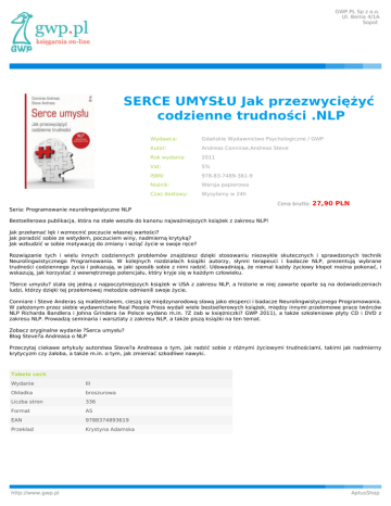 GWP.PL Sp z o.o. Ul. Bema 4/1A Sopot SERCE UMYSŁU Jak przezwyciężyć codzienne trudności .NLP Wydawca: Gdańskie Wydawnictwo Psychologiczne / GWP Autor: Andreas Connirae,Andreas Steve Rok wydania: 2011 Vat: 5% ISBN: 978-83-7489-361-9 Nośnik: Wersja papierowa Czas dostawy: Wysyłamy w 24h Cena brutto: 27,90 PLN Seria: Programowanie neurolingwistyczne NLP Bestsellerowa publikacja, która na stałe weszła do kanonu najważniejszych książek z zakresu NLP! Jak przełamać lęk i wzmocnić poczucie własnej wartości? Jak poradzić sobie ze wstydem, poczuciem winy, nadmierną krytyką? Jak wzbudzić w sobie motywację do zmiany i wziąć życie w swoje ręce? Rozwiązanie tych i wielu innych codziennych problemów znajdziesz dzięki stosowaniu niezwykle skutecznych i sprawdzonych technik Neurolingwistycznego Programowania. W kolejnych rozdziałach książki autorzy, słynni terapeuci i badacze NLP, prezentują wybrane trudności codziennego życia i pokazują, w jaki sposób sobie z nimi radzić. Udowadniają, że niemal każdy życiowy kłopot można pokonać, i wskazują, jak korzystać z wewnętrznego potencjału, który kryje się w każdym człowieku. ?Serce umysłu? stała się jedną z najpoczytniejszych książek w USA z zakresu NLP, a historie w niej zawarte oparte są na doświadczeniach ludzi, którzy dzięki tej przełomowej metodzie odmienili swoje życie. Conniare i Steve Anderas są małżeństwem, cieszą się międzynarodową sławą jako eksperci i badacze Neurolingwistycznego Programowania. W założonym przez siebie wydawnictwie Real People Press wydali wiele bestsellerowych książek, między innymi przełomowe prace twórców NLP Richarda Bandlera i Johna Grindera (w Polsce wydano m.in. ?Z żab w księżniczki? GWP 2011), a także szkoleniowe płyty CD i DVD z zakresu NLP. Prowadzą seminaria i warsztaty z zakresu NLP, a także piszą książki na ten temat. Zobacz oryginalne wydanie ?Serca umysłu? Blog Steve?a Andreasa o NLP Przeczytaj ciekawe artykuły autorstwa Steve?a Andreasa o tym, jak radzić sobie z różnymi życiowymi trudnościami, takimi jak nadmierny krytycyzm czy żałoba, a także m.in. o tym, jak zmieniać szkodliwe nawyki. Tabela cech Wydanie III Okładka broszurowa Liczba stron 336 Format A5 EAN 9788374893619 Przekład Krystyna Adamska http://www.gwp.pl AptusShop