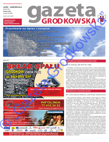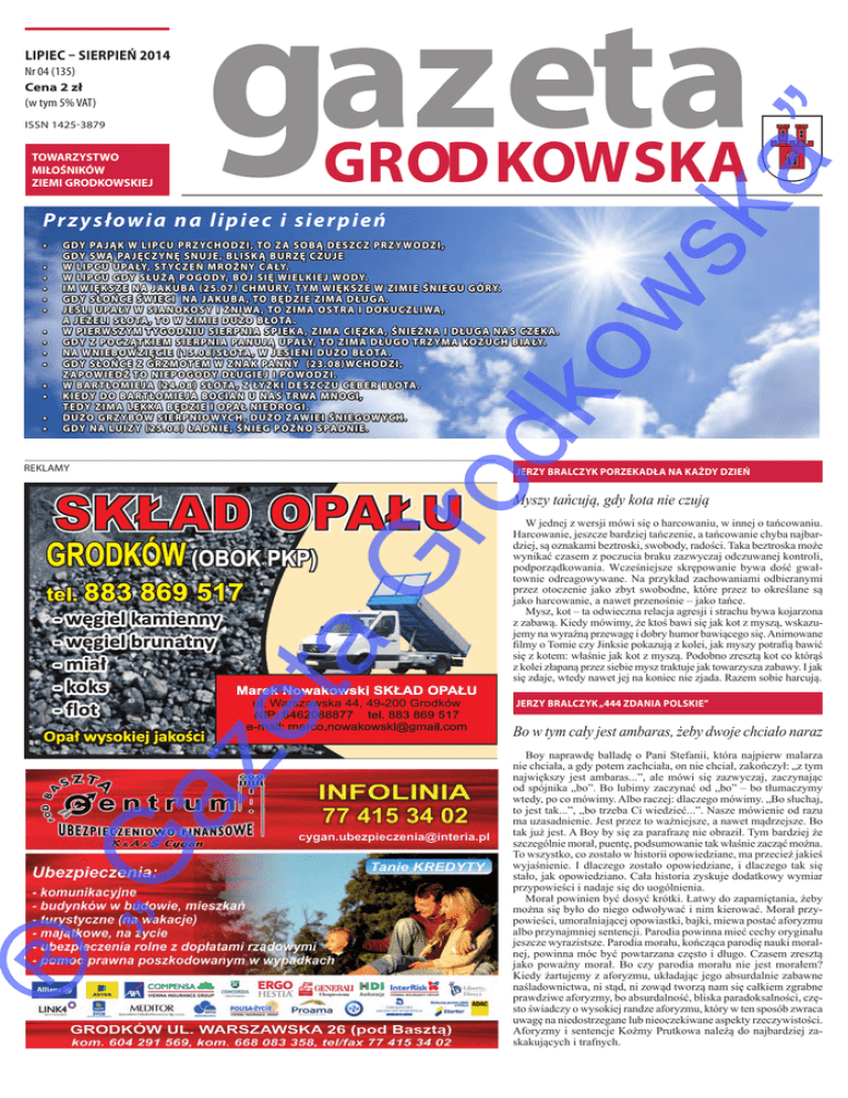 lipiec – sierpień 2014 Nr 04 (135) Cena 2 zł (w tym 5% VAT) TOWARZYSTWO MIŁOŚNIKÓW ZIEMI GRODKOWSKIEJ Pr z ysłowia na lipie c i sierpień • • • • • • • • • • • • • G dy paj ą k w l i p c u p r zyc h odz i , to za s ob ą d e s zc z p r zywodz i , gdy s wą paj ę c zyn ę s n u j e, b l i s k ą b u r z ę c z u j e W l i p c u u pały, s tyc z e ń m r o ź ny c ały. W l i p c u gdy s łu ż ą p ogody, bój s i ę w i e l k i e j wody. Im w i ę k s z e na J ak u ba ( 25.07 ) c h m u ry, tym w i ę k s z e w z i m i e śn i e g u gó ry. G dy s ło ń c e św i e c i na J ak u ba , to b ę dz i e z i ma dłu ga . J e ś l i u pały w s i anoko s y i ż n i wa , to z i ma o s t r a i dok u c z l i wa , a j e ż e l i s łota , to w z i m i e d u żo błota . W p i e r w s zym tygodn i u s i e r p n i a s p i e ka , z i ma c i ę ż ka , śn i e ż na i dłu ga na s c z e ka . G dy z p o c z ątk i e m s i e r p n i a pan u j ą u pały, to z i ma dłu go t r zyma ko ż u c h b i ały. N a W n i e bowz i ę c i e ( 15.08 ) s łota , w j e s i e n i d u żo błota . G dy s ło ń c e z g r zmot e m w znak Panny ( 23.08 ) w c h odz i , za p ow i e d ź to n i e p ogody dłu g i e j i p owodz i . W B a r tłom i e ja ( 24.08 ) s łota , z ły ż k i d e s zc z u c e b e r błota . K i e dy do B a r tłom i e ja bo c i an u na s t r wa mnog i , t e dy z i ma l e kka b ę dz i e i o pał n i e d r og i . D u żo g r zybów s i e r p n i owyc h , d u żo zaw i e i śn i e gowyc h . G dy na Lu i zy ( 25.08 ) ładn i e, śn i e g p ó ź no s padn i e. reklamy Gr od ko w • Jerzy Bralczyk Porzekadła na każdy dzień SKŁAD OPAŁU GRODKÓW (OBOK PKP) et a tel. 883 869 517 -�węgiel�kamienny -�węgiel�brunatny -�miał -�koks Marek Nowakowski SKŁAD OPAŁU ul. Warszawska 44, 49-200 Grodków -�flot NIP: 6462088877 tel. 883 869 517 e-mail: [email protected] „G az Opał wysokiej�jakości ® sk a ” issn 1425-3879 Myszy tańcują, gdy kota nie czują W jednej z wersji mówi się o harcowaniu, w innej o tańcowaniu. Harcowanie, jeszcze bardziej tańczenie, a tańcowanie chyba najbardziej, są oznakami beztroski, swobody, radości. Taka beztroska może wynikać czasem z poczucia braku zazwyczaj odczuwanej kontroli, podporządkowania. Wcześniejsze skrępowanie bywa dość gwałtownie odreagowywane. Na przykład zachowaniami odbieranymi przez otoczenie jako zbyt swobodne, które przez to określane są jako harcowanie, a nawet przenośnie – jako tańce. Mysz, kot – ta odwieczna relacja agresji i strachu bywa kojarzona z zabawą. Kiedy mówimy, że ktoś bawi się jak kot z myszą, wskazujemy na wyraźną przewagę i dobry humor bawiącego się. Animowane filmy o Tomie czy Jinksie pokazują z kolei, jak myszy potrafią bawić się z kotem: właśnie jak kot z myszą. Podobno zresztą kot co którąś z kolei złapaną przez siebie mysz traktuje jak towarzysza zabawy. I jak się zdaje, wtedy nawet jej na koniec nie zjada. Razem sobie harcują. Jerzy Bralczyk „444 zdania polskie” Bo w tym cały jest ambaras, żeby dwoje chciało naraz Boy naprawdę balladę o Pani Stefanii, która najpierw malarza nie chciała, a gdy potem zachciała, on nie chciał, zakończył: „z tym największy jest ambaras...”, ale mówi się zazwyczaj, zaczynając od spójnika „bo”. Bo lubimy zaczynać od „bo” – bo tłumaczymy wtedy, po co mówimy. Albo raczej: dlaczego mówimy. „Bo słuchaj, to jest tak...”, „bo trzeba Ci wiedzieć...”. Nasze mówienie od razu ma uzasadnienie. Jest przez to ważniejsze, a nawet mądrzejsze. Bo tak już jest. A Boy by się za parafrazę nie obraził. Tym bardziej że szczególnie morał, puentę, podsumowanie tak właśnie zacząć można. To wszystko, co zostało w historii opowiedziane, ma przecież jakieś wyjaśnienie. I dlaczego zostało opowiedziane, i dlaczego tak się stało, jak opowiedziano. Cała historia zyskuje dodatkowy wymiar przypowieści i nadaje się do uogólnienia. Morał powinien być dosyć krótki. Łatwy do zapamiętania, żeby można się było do niego odwoływać i nim kierować. Morał przypowieści, umoralniającej opowiastki, bajki, miewa postać aforyzmu albo przynajmniej sentencji. Parodia powinna mieć cechy oryginału jeszcze wyrazistsze. Parodia morału, kończąca parodię nauki moralnej, powinna móc być powtarzana często i długo. Czasem zresztą jako poważny morał. Bo czy parodia morału nie jest morałem? Kiedy żartujemy z aforyzmu, układając jego absurdalnie zabawne naśladownictwa, ni stąd, ni zowąd tworzą nam się całkiem zgrabne prawdziwe aforyzmy, bo absurdalność, bliska paradoksalności, często świadczy o wysokiej randze aforyzmu, który w ten sposób zwraca uwagę na niedostrzegane lub nieoczekiwane aspekty rzeczywistości. Aforyzmy i sentencje Kożmy Prutkowa należą do najbardziej zaskakujących i trafnych. 2 wieści z gminy i powiatu rozmawia Ryszarda Krokowa Pytania do burmistrza ® W d a l s z y m c i ą g u otrzymujemy skargi i komentarze dotyczące organizacji samego targu w okolicach głównego placu (na tyłach DH „ZEFIR”). ul. Warszawska oraz chodnik na wysokości DH „ZEFIR” to miejsca tak zablokowane, że przejazd ulicą i przejście chodnikiem to istny slalom. Samochody stoją nieraz w dwóch rzędach, wejście do „ZEFIRA” zaś to przepychanka. Czy nie można zmobilizować targujących, by nie zajmowali chodnika i samego wejścia? Kwestia pobierania opłat na podjeździe i schodach do tego domu handlowego oraz na chodniku najwyraźniej sankcjonuje możliwość handlu w tych miejscach. Raczej wątpliwa to ozdoba miasta, a wyznaczonym do handlu miejscem powinny być dwa place targowe, na których miejsca raczej nie brakuje. a Otrzymujemy od mieszkańców takie wnioski. Informuję, że na bieżąco naprawiamy i konserwujemy zniszczone ławki w parkach i na terenie miasta. Planujemy również systematyczne doposażanie miasta w nowe ł