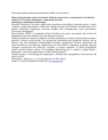 Sterowany radiem model samochodu firmy Nikko serii Evolution Pełny proporcjonalny system sterowania. Zabawka wyposażona w amortyzatory i mechanizm różnicowy. W zestawie akumulator z ładowarką sieciową. Informacje i instrukcja użytkowania: Instrukcja obrazkowa wewnątrz opakowania przedstawia prawidłową instalację anteny i baterii w pilocie. Umieść akumulator w ładowarce i podłącz do sieci 230V.Średni czas ładowania 4 do 5 godzin. Ładowanie sygnalizuje czerwona lampka LED. Przeładowanie może spowodować zniszczenie akumulatora. Dwa pokrętła „TRIM” na nadajniku służą do korekcji toru jazdy „po prostej” jak również do dokładnego ustawienia punktu zerowego dźwigni tył-przód. Wybierz bezpieczne miejsce do zabawy, nie kieruj pojazdem po ulicach. Unikaj jazdy po piasku i kałużach, uważaj na przeszkody. Nie pozostawiaj samochodu pod działaniem deszczu lub na dłuższy czas pod działaniem bezpośrednich promieni słonecznych. Dziwne zachowanie lub utrata kontroli jest powodowane zakłóceniami od CB trafoWN i budynków pomiędzy którymi następuje rozproszenie lub zakłócenie sygnałów z twojego nadajnika. W takich przypadkach musisz zmienić miejsce zabawy. W przypadku dłuższej przerwy w zabawie wyjmij baterie i akumulator . Zachowaj opakowanie do celów informacyjnych. Produkt zgodny z obowiązującymi regulacjami i dyrektywami europejskimi. Przeznaczony dla dzieci od lat 8. Dystrybutor : Pasja Sp. z o.o. 35-205 Rzeszów ul. Przy Torze1 tel/fax (17) 8630-413,8630-425,8630-625 www.pasja-rc.pl