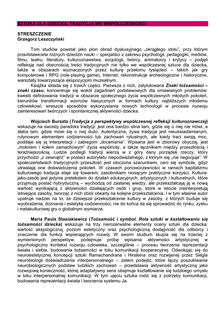 SZTUKA DLA DZIECKA. TRADYCJA WE WSPÓŁCZESNOŚCI STRESZCZENIE Grzegorz Leszczyński Tom studiów powstał jako plon obrad dyskusyjnego „okrągłego stołu”, przy którym przedstawiciele różnych dziedzin nauki – specjaliści z zakresu psychologii, pedagogiki, mediów, filmu, teatru, literatury, kulturoznawstwa, socjologii, twórcy, animatorzy i krytycy – podjęli refleksję nad obecnością treści tradycyjnych nie tylko we współczesnej sztuce dla dziecka, także w obszarach wyznaczonych przez kulturę przełomu tysiącleci – takich jak gry komputerowe i RPG (role-playing game), Internet, rekonstrukcje archeologiczne i historyczne, warsztaty towarzyszące ekspozycjom muzealnym. Książka składa się z trzech części. Pierwsza z nich, zatytułowana Znaki tożsamości – znaki czasu, koncentruje się wokół zagadnień podstawowych dla omawianych problemów: kwestii definiowania tradycji w obszarze społecznego życia współczesnych młodych pokoleń, kierunków transformacji wzorców klasycznych w formach kultury najbliższych młodemu człowiekowi, wreszcie sposobów wykorzystania nowych technologii w procesie rozwoju zainteresowań twórczych i spontanicznej aktywności dziecka. Wojciech Burszta (Tradycja z perspektywy współczesnej refleksji kulturoznawczej) wskazuje na swoisty paradoks tradycji: jest ona bardzo silna tam, gdzie się o niej nie mówi, a słaba tam, gdzie mówi się o niej dużo. Autentyczna, żywa tradycja jest nieuświadamianym, rutynowym elementem codzienności lub zachowań rytualnych, ale kiedy traci swoją moc, poddaje się ją interpretacji i zabiegom „doceniania”. Wpisana jest w zbiorowy obyczaj, jest „motorem i kołem zamachowym” życia wspólnoty, a także łącznikiem między przeszłością i teraźniejszością. Ludzie podlegli tradycji wierzą w z góry dany porządek rzeczy, który przychodzi „z zewnątrz” w postaci autorytetu niepodważalnego, z którym się „nie negocjuje”. W społeczeństwach tradycyjnych przeszłość jest otoczona szacunkiem, ceni się symbole, gdyż utrwalają one doświadczenia pokoleń. W czasach ponowoczesności w ramach kapitalizmu kulturowego tradycja staje się towarem, zasobnikiem niosącym praktyczne korzyści. Kulturajako-zasób jest jedynie pretekstem do działań edukacyjnych, artystycznych i kulturalnych, które przyjmują postać hybrydyczną – wychodzą od zastanej wiedzy, ale przekształcają ją w nową wartość wynikającą z aktywności działających osób i grup, które w istocie zreinterpretują istniejące zasoby, tworząc z nich zbiór otwarty na kolejne przekształcenia. I w tym właśnie autor upatruje nadziei na to, że dzisiejsze przekształcenie kultury w zasoby, z których buduje się wyobrażenia, doznania i estetykę codzienności, nie do końca da się sprowadzić do rynku, zysku i metakulturowej gry o globalnym wymiarze. Maria Paula Stasiakiewicz (Tożsamość i symbol. Rola sztuki w kształtowaniu się tożsamości dziecka) wskazuje na trzy nierozerwalne elementy oceny sztuki dla dziecka: wartość aksjologiczną, poziom estetyczny oraz psychologiczną dostępność dla odbiorcy i znaczenie dla funkcji wspierających rozwój. W swoim studium skupia się na trzeciej z wymienionych perspektyw, podejmuje próbę wpisania aktywności artystycznej w psychologiczny kontekst rozwoju człowieka, szczególnie – procesu tworzenia reprezentacji świata i siebie, budowania tożsamości w toku komunikacji kooperacyjnej. Odwołując się do neuroestetycznej koncepcji sztuki Ramachandrana i Hirsteina oraz rozwijanej przez Siegla neurobiologii doświadczenia interpersonalnego – zatem podejść, które łączy poszukiwanie neurobiologicznych podstaw ludzkich zachowań – przedstawia aktywność artystyczną jako rozwojową konieczność, której adaptatywny sens obejmuje kształtowanie się ludzkiego umysłu w toku interpersonalnej komunikacji. W tym ujęciu sztuka rodzi się z potrzeby komunikacji, budowania reprezentacji świata i tworzenia systemu Ja. Marta Karasińska (Realne? Wirtualne? Dziecko w postmetropolis) dowodzi, że wirtualne miasta z RPG (role-playing game) są reakcją na zdekonstruowanie wielkich gatunków epickich, tworem kulturowym stanowiącym pochodną likwidowanego miejsca. Stają się odpowiedzią na dokonane przez ponowoczesność unieważnienie tautologicznego topoi miejsca i paradoksalnie przywracają swoim użytkownikom utracony model miasta tradycyjnego. Świadomie poddane estetycznej dyrektywie abject, związanej zarówno z folklorem dziecięcym, jak konwencją baśni magicznej, służą niezaspokajanej przez postmetropolis potrzebie wyodrębnienia. Zrodzone z idei, reprezentacji bez reprezentowanego, rozgrywane na cyfrowej mapie niewidzialnych miast, wprowadzone do kulturowego uniwersum postmetropolis jak koń trojański rozsadzają je od środka, przypominając o cywilizacyjnym rudymencie – historii, tradycji i wielkiej narracji. Punktem wyjścia dociekań Antoniego Porczaka (Zwiastowanie typu Adobe) jest stwierdzenie, że w kulturze współczesnej coraz więcej zależy od nas samych, indywidualnych podmiotów działających za pomocą nowych technologii na rzecz międzyludzkiej wymiany wyobrażeń. Nie jesteśmy już zdani jedynie na obrazy cudze (galerie, telewizja itp.), ale tworzymy własne, a one w globalnej sieci informacyjnej mogą stać się przedmiotem wymiany z innymi. Pokolenie ludzi dorosłych ciągle jeszcze widzi w nowych technologiach zaledwie zmianę środków ekspresji, które stara się dopasować do starych idei kultury papieru, natomiast dzieci i młodzież opanowują środki medialne z marszu, jako naturalne i być może w ogóle nie muszą przechodzić przez edukację papieru, farb i kredek, jeśli ich opiekunowie i nauczyciele potrafią pogodzić się z myślą, że żyjemy już w innym świecie niż: analog, papier, hand made i inne techniki poprzednich wieków. Ciągle jeszcze producenci filmów dla dzieci są przeko
