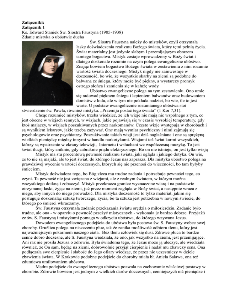 Załączniki: Załącznik 1 Ks. Edward Staniek Św. Siostra Faustyna (1905-1938) Zdanie mistyka o ubóstwie ducha Św. Siostra Faustyna należy do mistyków, czyli otrzymała łaskę doświadczenia realizmu Bożego świata, który tętni pełnią życia. Świat materialny jest jedynie słabym i przemijającym obrazem tamtego bogactwa. Mistyk zostaje wprowadzony w Boży świat i dlatego doskonale rozumie na czym polega ewangeliczne ubóstwo. Znając bowiem bogactwo Bożego świata w zestawieniu z nim rozumie wartość świata doczesnego. Mistyk nigdy nie zainwestuje w doczesność, bo wie, że wszystkie skarby na ziemi są podobne do bałwana ze śniegu, który może być piękny, a wystarczy promyk ostrego słońca i zamienia się w kałużę wody. Ubóstwo ewangeliczne polega na tym zestawieniu. Ono umie się radować pięknem śniegu i lepieniem bałwanów oraz budowaniem domków z lodu, ale w tym nie pokłada nadziei, bo wie, ile to jest warte. U podstaw ewangelicznie rozumianego ubóstwa stoi stwierdzenie św. Pawła, również mistyka: „Przemija postać tego świata” (1 Kor 7,31). Chcąc rozumieć mistyków, trzeba wiedzieć, że ich wizje nie mają nic wspólnego z tym, co jest obecne w wizjach sennych, w wizjach, jakie pojawiają się w czasie wysokiej temperatury, gdy ktoś majaczy, w wizjach poszukiwanych przez narkomanów. Często wizje występują w chorobach i są wynikiem lekarstw, jakie trzeba zażywać. One mają wymiar psychiczny i nimi zajmują się psychologowie oraz psychiatrzy. Poszukiwanie takich wizji jest dziś nagłaśniane i one są sprężyną wielkich pieniędzy między innymi w handlu narkotykami. Wizjami też świat karmi wszystkich, którzy są wpatrzenie w ekrany telewizji, Internetu i wsłuchani we współczesną muzykę. To jest świat iluzji, który zniknie, gdy zabraknie prądu elektrycznego. Bo on nie istnieje, on jest tylko wizją Mistyk ma stu procentową pewność realizmu świata, jaki ogląda i jakiego dotyka. On wie, że to nie są majaki, ale to jest świat, do którego Jezus nas zaprasza. Dla mistyka ubóstwo polega na prawdziwej wycenie wartości doczesnych, których się nie przenosi do wieczności, bo tam byłyby śmieciem. Mistyk doświadcza tego, bo Bóg zleca mu trudne zadania i potrzebuje pewności tego, co czyni. Ta pewność nie jest związana z wizjami, ale z realnym światem, w którym można wszystkiego dotkną i zobaczyć. Mistyk przekracza granice wyznaczone wiarą i na podstawie otrzymanej łaski, żyjąc na ziemi, już przez moment zagląda w Boży świat, a następnie wraca z niego, aby innych do niego prowadzić. Dla mistyka doczesność to tylko materiał, jakim się posługuje doskonaląc sztukę twórczego, życia, bo ta sztuka jest potrzebna w nowym świecie, do którego po śmierci wkraczamy. Św. Faustyna otrzymała zadanie przekazania światu orędzia o miłosierdziu. Zadanie było trudne, ale ona - w oparciu o pewność przeżyć mistycznych - wykonała je bardzo dobrze. Przyjaźń ze św. S. Faustyną i mistykami pomaga w odkryciu ubóstwa, do którego wzywana Jezus. Dowodem ewangelicznego podejścia do ubóstwa była postawa św. S. Faustyny wobec swej choroby. Gruźlica polega na niszczeniu płuc, tak że zanika możliwość odbioru tlenu, który jest najważniejszym pokarmem naszego ciała. Bez tlenu człowiek się dusi. Zdrowe płuca to bardzo cenne dobro doczesne, ale S. Faustyna wiedziała, że ono, jak wszystko na ziemi, jest przemijające. Ani raz nie prosiła Jezusa o zdrowie. Była świadoma tego, że Jezus może ją uleczyć, ale wiedziała również, że On sam, będąc na ziemi, dobrowolnie przyjął cierpienie i nadał mu zbawczy sens. Ona podłączała swe cierpienie i słabość do Jego ofiary wiedząc, że przez nie uczestniczy w dziele zbawienia świata. W Krakowie podobne podejście do choroby miała bł. Aniela Salawa, ona też zdumiewa umiłowaniem ubóstwa. Mądre podejście do ewangelicznego ubóstwa pozwala na zachowanie właściwej postawy w chorobie. Zdrowie bowiem jest jednym z wielkich darów doczesnych, cenniejszych niż pieniądze i inne bogactwa. Ubóstwo Jezusa na krzyżu odsłania rąbek tajemnicy zawartej w Jego słowach: „Błogosławieni ubodzy w duchu, albowiem do nich należy królestwo niebieskie”. Załącznik 2 MOJE WSPOMNIENIA O Ś.P. SIOSTRZE FAUSTYNIE Na oryginale podpisano: Białystok 27.01.1948. /-/ Ks. Michał Sopoćko spowiednik siostry Faustyny Błogosławiony ksiądz Michał Sopoćko Są prawdy wiary świętej, które się niby zna i często się o nich wspomina, ale się ich dobrze nie rozumie, ani też nimi nie żyje. Tak było ze mną co do prawdy Miłosierdzia Bożego. Tyle razy myślałem o tej prawdzie w medytacjach, szczególnie na rekolekcjach, tyle razy mówiłem o niej w kazaniach i powtarzałem w modlitwach liturgicznych, ale nie wnikałem w jej treść i w jej znaczenie dla życia duchowego; szczególnie nie rozumiałem, a na razie nie mogłem się zgodzić, że Miłosierdzie Boże jest najwyższym przymiotem Stwórcy, Odkupiciela i Uświęciciela. Dopiero trzeba było prostej, świątobliwej duszy, ściśle zjednoczonej z Bogiem, która - jak wierzę - z natchnienia Bożego powiedziała mi o tym i pobudziła do studiów, badań i rozmyślań na ten temat. Tą duszą była śp. siostra Faustyna (Helena Kowalska) ze Zgromadzenia Sióstr Matki Bożej Miłosierdzia, która powoli osiągnęła to, że dzisiaj uważam sprawę kultu Miłosierdzia Bożego, a szczególności ustanowienie Święta Miłosierdzia Bożego w pierwszą niedzielę po Wielkanocy za jeden z głównych celów swojego życia. Siostrę Faustynę poznałem w lecie (lipcu czy sierpniu 1933 roku), jako penitentkę w Zgromadzeniu Sióstr Matki Bożej Miłosierdzia w Wilnie (ul. Senatorska 25), w którym wówczas byłem zwyczajnym spowiednikiem. Zwróciła ona moją uwagę na siebie niezwykłą subtelnością sumienia i ścisłym zjednoczeniem z Bogiem; przeważnie nie było materii do rozgrz