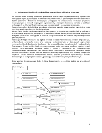 1. Opis strategii działalności Getin Holding po wydzieleniu oddziału w Warszawie Po podziale Getin Holding pozostanie podmiotem dominującym zdywersyfikowanej, dynamicznie rozwijającej się Grupy działającej w sektorze usług finansowych, a głównym przedmiotem działalności Spółki pozostanie działalnośd inwestycyjna polegająca na wyszukiwaniu i realizacji projektów inwestycyjnych na rynkach krajowych i zagranicznych, a następnie tworzeniu wartości w spółkach wchodzących w skład portfela inwestycyjnego poprzez nadzór i koordynację ich rozwoju. Nadrzędnym celem Getin Holding pozostanie osiągnięcie wysokiej stopy zwrotu z inwestycji, a co za tym idzie wymiernych korzyści dla akcjonariuszy. Wzrost Getin Holding zamierza osiągnąd zarówno poprzez systematyczny rozwój spółek wchodzących w skład Grupy po podziale, jak i poprzez przemyślane, celowe akwizycje bądź tworzenie od podstaw kolejnych podmiotów, działających w sektorze usług finansowych dla klientów indywidualnych oraz przedsiębiorców. Realizacja strategii dokonywad się będzie również poprzez maksymalizację wzrostu organicznego, wykorzystanie potencjału rynku oraz przewag konkurencyjnych w docelowych segmentach rynkowych, głównie bankowości detalicznej i dla przedsiębiorców, ubezpieczeniach i pośrednictwie finansowym. Grupa będzie dążyła do maksymalnego wykorzystywania zasobów, między innymi poprzez optymalizowanie wyników spółek z Grupy i zapewnianie im doświadczonego i zmotywowanego kierownictwa, jak również źródeł finansowych. Jednocześnie szczególna uwaga zostanie zwrócona na ryzyko poprzez ulepszoną kontrolę organizacyjną oraz systemy zarządzania ryzykiem. Grupa zamierza kontynuowad rozwój poprzez powielanie sprawdzonego modelu biznesowego na skalę międzynarodową, pozostając skoncentrowaną na rynku finansowym. Skład portfela inwestycyjnego Getin Holding bezpośrednio po podziale będzie się przedstawiał następująco: Getin Holding S.A. 66,54% 100% TU Europa S.A. 100% TU na Życie Europa S.A. Getin International S.A. 100% Getin International S.a.r.l. 99,99% 92,58% 99,06% PlusBank S.A. Sombelbank S.A. Idea Leasing sp. z o.o. 100% 0,003% Spółka Finansowa Gwarant Plus sp. z .o.o. 7,417% 100% Carcade sp. z o.o. 75,58% AB Kubanbank S.A. 99,99% D2 Technologie sp. z o.o. 62,95% Idea Bank S.A. 100% Provista S.A. 100% 51,27% 100% MW Trade S.A. Powszechny Dom Kredytowy S.A. 100% Panorama Finansów S.A. PDK Biznes sp. z o.o. 1 Powyższe udziały procentowe Getin Holding w spółkach, które pozostaną w Grupie Getin Holding po podziale wykazano wg stanu na 30.06.2011 z wyjątkiem udziału w Idea Banku, który wykazano przy założeniu dojścia do skutku podwyższenia kapitału oraz sprzedaży akcji Powszechnego Domu Kredytowego do Idea Banku. 2. Kierunki rozwoju działalności Polska Działalnośd bankowa w ramach Grupy Idea Bank Rozwój działalności bankowej zorientowanej na przedsiębiorców w ramach Grupy Idea Banku w oparciu o sied dystrybucji własną (oddziały odkupione od Get Banku), sied dystrybucyjną pośredników finansowych (PDK, Tax Care) oraz współpracę z niezależnymi sieciami dystrybucji. Główna misja biznesowa zakłada zbudowanie polskiej instytucji bankowej kierującej swoją ofertę produktową do grupy klientów z segmentu małych i średnich firm, z konsekwentnym, wraz z rozwojem Banku, wchodzeniem w sektor dużych przedsiębiorstw. Charakter Banku będzie czerpał wzorce z modelu bankowości opartej na bardzo bliskich relacjach z klientami, gdzie nacisk kładziony jest na adresowanie rozwiązao finansowych do indywidualnych przypadków, partnerskie relacje z klientem oraz uważnie wyselekcjonowany katalog produktów. W swojej strategii Idea Bank zakłada, że „bank ma rosnąd wraz ze wzrostem biznesu jego klientów”. Taka strategia będzie miała istotny wpływ na zarządzanie ryzykiem kredytowym, a do rosnącego biznesu obsługiwanych przedsiębiorstw będą konsekwentnie dopasowywane produkty. Działalnośd ubezpieczeniowa w ramach Grupy TU Europa Długoterminowym celem strategicznym Grupy TU Europa jest utrzymanie wysokiego zwrotu z zainwestowanego kapitału, przy czym wskazanie powyższego celu nie jest równoznaczne z gwarancją, że Grupa TU Europa zdoła ten cel zrealizowad. Grupa TU Europa zamierza realizowad ten cel poprzez umacnianie pozycji lidera w obszarze bancassurance oraz dynamiczny wzrost zarówno ubezpieczeo majątkowych jak i życiowych, jak również poprzez następujące elementy strategii: - stałe wprowadzanie nowych i innowacyjnych produktów; - pogłębienie współpracy z dotychczasowymi partnerami, w tym w szczególności w ramach Grupy Kapitałowej Getin Holding oraz Grupy Kapitałowej Getin Noble Bank i pozyskiwanie nowych; - rozwój kanałów dystrybucji. Zagranica budowanie/rozwój działalności bankowej i leasingowej z wykorzystaniem marki Idea; utrzymanie/zdobycie wiodącej pozycji w finansowaniu pojazdów; poszerzanie sieci placówek w celu: zdobycia nowych klientów, dywersyfikacji źródeł i obniżenia kosztu finansowania oraz wprowadzenia nowych produktów i kanałów dystrybucji; rozwój bankowości internetowej; sukcesywne wchodzenie w działalnośd ubezpieczeniową, maklerską i funduszy inwestycyjnych; 2 3. Analiza ekonomiczno-finansowa Podstawowe dane historyczne spółek, które pozostaną w portfelu Getin Holding po podziale: w tys. zł siedziba Grupa Carcade Grupa Plus Bank Sombelbank Grupa TU Europa Idea Bank Grupa PDK MW Trade PF Leasing * w etatach Rosja Ukraina Białoruś Polska Polska Polska Polska Polska zysk netto zysk netto rok 2010 1Q 2011 21 309 19 792 11 739 150 442 5 170 13 025 7 035 5 486 2 766 3 443 4 229 43 888 2 426 2 216 2 331 -1 100 suma aktywów zatrudnienie* Placówki CAR** na 31.03.2011 488 576 419 722 252 355 6 796 327 502 207 90 612 305 747 18 545 591 783 432 225 211 461 25 37 55 40 28 9 0 53 n/d 26 31% 21,2% 52,7% n/d 36,8% n/d n/d n/d ** współczynni