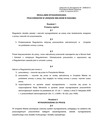 Załącznik do Zarządzenia Nr 2498/2012 Prezydenta Miasta Radomia z dnia 14 czerwca 2012 r. REGULAMIN WYNAGRADZANIA PRACOWNIKÓW W URZĘDZIE MIEJSKIM W RADOMIU Rozdział 1 Przepisy ogólne §1 Regulamin określa zasady i warunki wynagradzania za pracę oraz świadczenia związane z pracą i warunki ich przyznawania. §2 1. Postanowienia Regulaminu dotyczą pracowników zatrudnionych w Urzędzie na podstawie umowy o pracę. §3 Przed dopuszczeniem do pracy, nowo zatrudniony pracownik zaznajamia się w Biurze Kadr i Szkoleń z niniejszym Regulaminem. Oświadczenie pracownika o zapoznaniu się z Regulaminem zawarte jest w umowie o pracę. §4 Ilekroć w Regulaminie jest mowa o: 1) pracodawcy – rozumie się przez to Prezydenta Miasta, 2) pracowniku – rozumie się przez to osobę zatrudnioną w Urzędzie Miasta na podstawie umowy o pracę, bez względu na rodzaj umowy o pracę i wymiar czasu pracy, 3) rozporządzeniu w sprawie zasad wynagradzania – rozumie się przez to rozporządzenie Rady Ministrów w sprawie zasad wynagradzania pracowników samorządowych wydane na podstawie art. 37 ust. 1 ustawy z dnia 21 listopada 2008 r. o pracownikach samorządowych (Dz. U. z 2008 r. Nr 223, poz.1458). Rozdział 2 WYNAGRODZENIE ZA PRACĘ §5 W Urzędzie Miasta obowiązuje czasowy system wynagradzania, polegający na ustaleniu dla poszczególnych pracowników kategorii zaszeregowania, zasadniczego oraz dodatku funkcyjnego i dodatku specjalnego. stawek wynagradzania Wynagrodzenie zasadnicze 1. Podstawą ustalania zaszeregowania pracownika są tabele stanowiące załączniki od Nr 3 do Nr 7 niniejszego Regulaminu, minimalne wynagrodzenie zasadnicze ustalone jest w rozporządzeniu w sprawie zasad wynagradzania. 2.Tabela stawek miesięcznych kwot wynagrodzenia zasadniczego w poszczególnych kategoriach zaszeregowania z uwzględnieniem stawek minimalnych i maksymalnych stanowi załącznik Nr 1 do niniejszego Regulaminu. §6 1. Decyzję o zastosowaniu dla danego pracownika stawki osobistego zaszeregowania podejmuje pracodawca w zakresie wynagrodzenia zasadniczego i dodatku funkcyjnego. 2. W uzasadnionych przypadkach pracodawca może skrócić pracownikowi okres pracy zawodowej wymagany na danym stanowisku, z wyłączeniem stanowisk, dla których wymagany okres pracy zawodowej określają odrębne przepisy oraz art. 5 ust. 2 i art. 6 ust. 4 ustawy z dnia 21 listopada 2008 r. o pracownikach samorządowych (Dz.U. z 2008 r. Nr 223, poz.1458). §7 Dodatek funkcyjny 1. Pracownikom zatrudnionym na stanowiskach związanych z kierowaniem zespołem oraz radcy prawnemu i kierownikowi urzędu stanu cywilnego przysługuje dodatek funkcyjny. 2. Dodatek funkcyjny przysługuje również pracownikom zatrudnionym na stanowiskach niezwiązanych z kierowaniem zespołem, dla których w tabeli nr VIII, stanowiącej załącznik Nr 8 do niniejszego Regulaminu, przewiduje się dodatek funkcyjny. 3. Tabela stawek dodatku funkcyjnego stanowi załącznik Nr 2 do niniejszego Regulaminu. §8 Dodatek specjalny 1. Z tytułu okresowego zwiększenia obowiązków służbowych lub powierzenia dodatkowych zadań o wysokim stopniu złożoności lub odpowiedzialności pracodawca może przyznać pracownikowi dodatek specjalny związany z wykonywaniem tych obowiązków i zadań. 2. Dodatek specjalny jest ustalany w zależności od posiadanych środków na wynagrodzenia i przyznawany w kwocie nie przekraczającej 40%, łącznie wynagrodzenia zasadniczego i dodatku funkcyjnego pracownika lub w kwocie nie przekraczającej 50% wynagrodzenia zasadniczego w wypadku, gdy pracownik nie ma przyznanego dodatku funkcyjnego. §9 Wynagrodzenie prowizyjne 1. Za osobiste wykonywanie czynności z zakresu egzekucji administracyjnej należności pieniężnych prowizyjne. pracodawca może przyznać pracownikowi dodatkowe wynagrodzenie 2. Wynagrodzenie prowizyjne przysługuje pracownikom Urzędu Miasta wykonującym egzekucję administracyjną należności pieniężnych zatrudnionym na stanowiskach poborców i starszych poborców w następującej wysokości: 1) 5,20% bezpośrednio ściągniętych kwot należności i odsetek od zobowiązanego na podstawie tytułów wykonawczych, a ponadto: 2) 2,3% ściągniętych bezpośrednio kwot należności i odsetek od zobowiązanego w przypadku załatwienia średnio w miesiącu minimum czterech spraw dziennie, przy czym przez załatwioną sprawę rozumie się: - pobranie całkowite, - pobranie częściowe zamykające tytuł wykonawczy, - pobranie częściowe należności i odsetek plus zajęcie ruchomości, - pobranie częściowe należności i odsetek plus protokół o stanie majątkowym na tytuł, w którym poborca po raz pierwszy zastosował środek egzekucyjny, - pobranie częściowe plus protokół o stanie majątkowym lub pobranie częściowe plus zajęcie ruchomości na tytuł, w którym poborca po raz pierwszy zastosował środek egzekucyjny w odniesieniu do zobowiązanego, wobec którego prowadzona jest egzekucja należności o wcześniejszym terminie wymagalności, - zajęcie ruchomości, - zwózkę ruchomości, - sprzedaż ruchomości niezależnie od sposobu sprzedaży. Wymienione czynności dotyczą jednego zobowiązanego niezależnie od liczby tytułów na niego wystawionych, 3) 1,00% ściągniętych kwot należności i odsetek od zobowiązanego za każdą przeprowadzoną zwózkę ruchomości, niezależnie od liczby tytułów wykonawczych dotyczących jednego zobowiązanego. 4) 0,50% ściągniętych kwot należności i odsetek od zobowiązanego za każdą sprzedaż ruchomości od liczby tytułów wykonawczych na jednego zobowiązanego. 3. Pozostałym pracownikom Biura wykonującym osobiście egzekucję administracyjną należności pieniężnych przysługuje prowizja w wysokości 3,08% kwoty ściągniętych należności podstawowych wraz z odsetkami bezpośrednio od zobowiązanego. 4. Przez kwoty bezpośrednio ściągnięte od zobowiązanego rozumie się kwoty: 1) pobrane bezpośrednio u zobowiązanego w gotówc