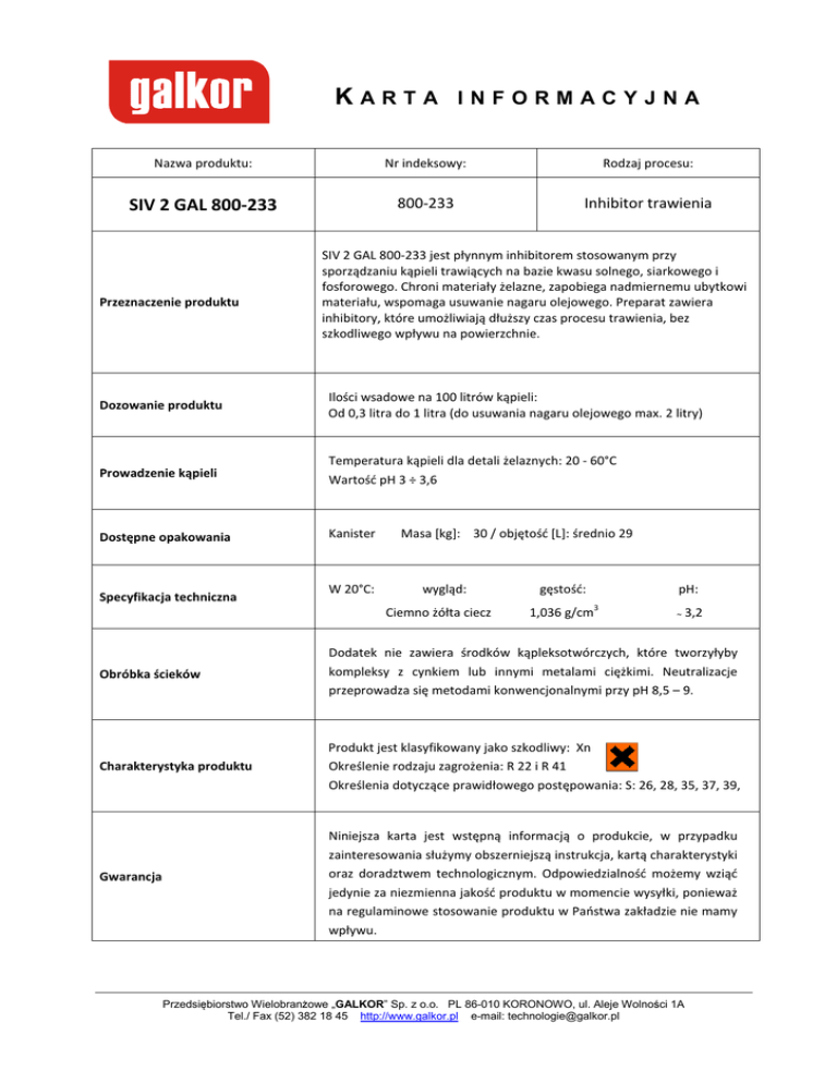 KARTA INFORMACYJNA Nazwa produktu: Nr indeksowy: Rodzaj procesu: SIV 2 GAL 800-233 800-233 Inhibitor trawienia Przeznaczenie produktu SIV 2 GAL 800-233 jest płynnym inhibitorem stosowanym przy sporządzaniu kąpieli trawiących na bazie kwasu solnego, siarkowego i fosforowego. Chroni materiały żelazne, zapobiega nadmiernemu ubytkowi materiału, wspomaga usuwanie nagaru olejowego. Preparat zawiera inhibitory, które umożliwiają dłuższy czas procesu trawienia, bez szkodliwego wpływu na powierzchnie. Dozowanie produktu Ilości wsadowe na 100 litrów kąpieli: Od 0,3 litra do 1 litra (do usuwania nagaru olejowego max. 2 litry) Prowadzenie kąpieli Temperatura kąpieli dla detali żelaznych: 20 - 60°C Wartość pH 3 ÷ 3,6 Dostępne opakowania Kanister Specyfikacja techniczna W 20°C: Masa [kg]: 30 / objętość [L]: średnio 29 wygląd: Ciemno żółta ciecz gęstość: 1,036 g/cm pH: 3 ~ 3,2 Obróbka ścieków Dodatek nie zawiera środków kąpleksotwórczych, które tworzyłyby kompleksy z cynkiem lub innymi metalami ciężkimi. Neutralizacje przeprowadza się metodami konwencjonalnymi przy pH 8,5 – 9. Charakterystyka produktu Produkt jest klasyfikowany jako szkodliwy: Xn Określenie rodzaju zagrożenia: R 22 i R 41 Określenia dotyczące prawidłowego postępowania: S: 26, 28, 35, 37, 39, Gwarancja Niniejsza karta jest wstępną informacją o produkcie, w przypadku zainteresowania służymy obszerniejszą instrukcja, kartą charakterystyki oraz doradztwem technologicznym. Odpowiedzialność możemy wziąć jedynie za niezmienna jakość produktu w momencie wysyłki, ponieważ na regulaminowe stosowanie produktu w Państwa zakładzie nie mamy wpływu. Przedsiębiorstwo Wielobranżowe „GALKOR” Sp. z o.o. PL 86-010 KORONOWO, ul. Aleje Wolności 1A Tel./ Fax (52) 382 18 45 http://www.galkor.pl e-mail: [email protected]