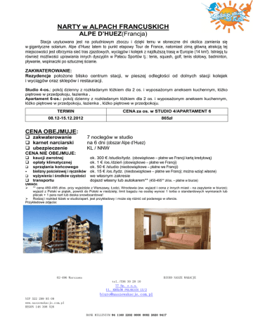 NARTY w ALPACH FRANCUSKICH ALPE D’HUEZ(Francja) Stacja usytuowana jest na południowym zboczu i dzięki temu w słoneczne dni okolica zamienia się w gigantyczne solarium. Alpe d’Huez latem to punkt etapowy Tour de France, natomiast zimą główną atrakcją tej miejscowości jest olbrzymia sieć tras zjazdowych, wyciągów i kolejek z najdłuższą trasą w Europie (14 km!). Istnieją tu również możliwości uprawiania innych dyscyplin w Pałacu Sportów tj.: tenis, squash, golf, tenis stołowy, badminton, pływanie, wspinaczki po sztucznej ścianie. ZAKWATEROWANIE: Rezydencje położone blisko centrum stacji, w pieszej odległości od dolnych stacji kolejek i wyciągów oraz sklepów i restauracji. Studio 4-os.: pokój dzienny z rozkładanym łóżkiem dla 2 os. i wyposażonym aneksem kuchennym, łóżko piętrowe w przedpokoju, łazienka . Apartament 6-os.: pokój dzienny z rozkładanym łóżkiem dla 2 os. i wyposażonym aneksem kuchennym, łóżko piętrowe w przedpokoju, łazienka , łóżko piętrowe w przedpokoju. TERMIN CENA za os. w STUDIO 4/APARTAMENT 6 08.12-15.12.2012 865zł CENA OBEJMUJE: zakwaterowanie karnet narciarski ubezpieczenie 7 noclegów w studio na 6 dni (obszar Alpe d’Huez) KL / NNW CENA NIE OBEJMUJE: kaucji zwrotnej opłaty klimatycznej sprzątania końcowego bielizny pościelowej i ręczników wyżywienia i środków czystości transportu ok. 300 € /studio/tydz. (obowiązkowe – płatne we Francji kartą kredytową) ok. 1 € /os./dzień (obowiązkowe – płatne we Francji) ok. 50 € /studio (nieobowiązkowe – płatne we Francji) ok. 15 € /os./tydz. (nieobowiązkowe – płatne we Francji; można wziąć własne) we własnym zakresie dojazd własny lub autokarem** (450-495** zł/os. – płatne w biurze) UWAGI: ** cena 450-495 zł/os. przy wyjeździe z Warszawy, Łodzi, Wrocławia (ew. wyjazd i cena z innych miast - na zapytanie w biurze); wyjazd z Polski w piątek, powrót do Polski w niedzielę; limit bagażu na osobę wynosi 1 torba o standardowych wymiarach lub plecak + 1 para nart lub deska snowboardowa! Rodzaj i rozkład łóżek w studio/apart. jest przykładowy i może się różnić od podanego w ofercie. Przykładowe zdjęcia: 02-496 Warszawa BIURO NASZE WAKACJE tel./536 30 20 10 77 Sp. z o.o. Ul. KRÓLÓW POLSKICH 13/2 [email protected] NIP 522 299 95 09 www.naszewakacje.com.pl REGON 146 308 526 BANK MILLENIUM 94 1160 2202 0000 0002 2620 9417