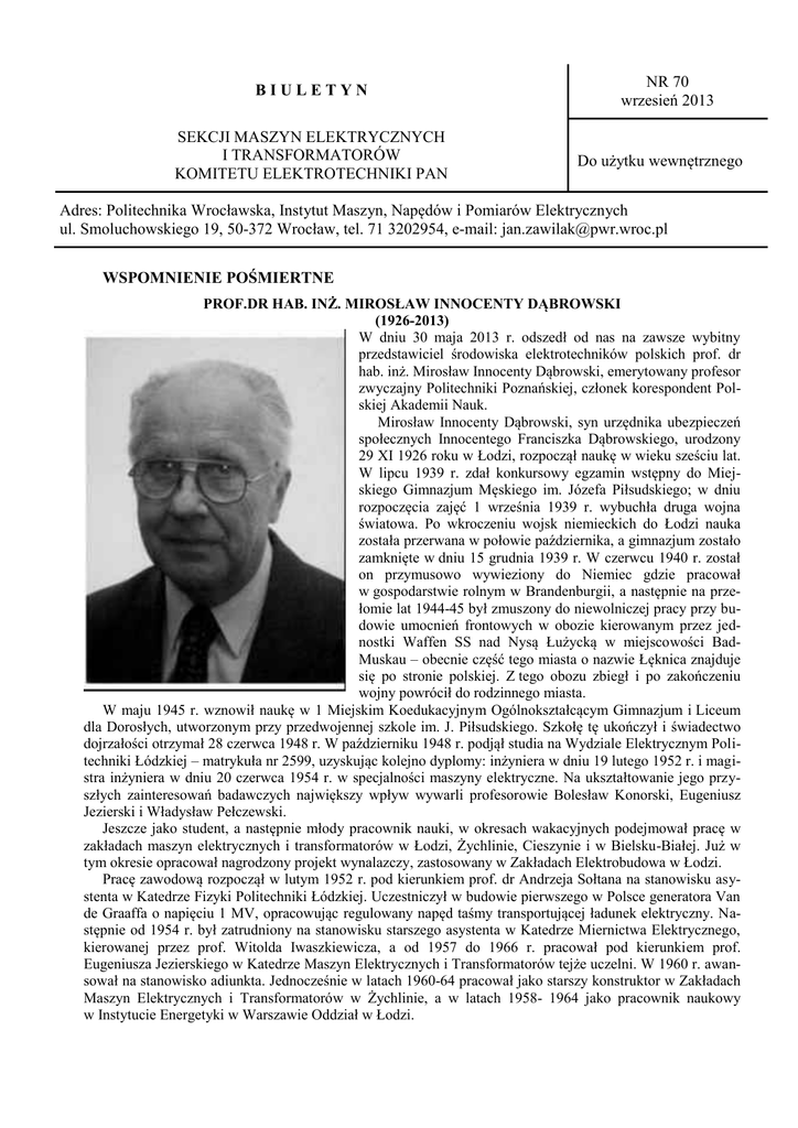 BIULETYN SEKCJI MASZYN ELEKTRYCZNYCH I TRANSFORMATORÓW KOMITETU ELEKTROTECHNIKI PAN NR 70 wrzesień 2013 Do użytku wewnętrznego Adres: Politechnika Wrocławska, Instytut Maszyn, Napędów i Pomiarów Elektrycznych ul. Smoluchowskiego 19, 50-372 Wrocław, tel. 71 3202954, e-mail: [email protected] WSPOMNIENIE POŚMIERTNE PROF.DR HAB. INŻ. MIROSŁAW INNOCENTY DĄBROWSKI (1926-2013) W dniu 30 maja 2013 r. odszedł od nas na zawsze wybitny przedstawiciel środowiska elektrotechników polskich prof. dr hab. inż. Mirosław Innocenty Dąbrowski, emerytowany profesor zwyczajny Politechniki Poznańskiej, członek korespondent Polskiej Akademii Nauk. Mirosław Innocenty Dąbrowski, syn urzędnika ubezpieczeń społecznych Innocentego Franciszka Dąbrowskiego, urodzony 29 XI 1926 roku w Łodzi, rozpoczął naukę w wieku sześciu lat. W lipcu 1939 r. zdał konkursowy egzamin wstępny do Miejskiego Gimnazjum Męskiego im. Józefa Piłsudskiego; w dniu rozpoczęcia zajęć 1 września 1939 r. wybuchła druga wojna światowa. Po wkroczeniu wojsk niemieckich do Łodzi nauka została przerwana w połowie października, a gimnazjum zostało zamknięte w dniu 15 grudnia 1939 r. W czerwcu 1940 r. został on przymusowo wywieziony do Niemiec gdzie pracował w gospodarstwie rolnym w Brandenburgii, a następnie na przełomie lat 1944-45 był zmuszony do niewolniczej pracy przy budowie umocnień frontowych w obozie kierowanym przez jednostki Waffen SS nad Nysą Łużycką w miejscowości BadMuskau – obecnie część tego miasta o nazwie Łęknica znajduje się po stronie polskiej. Z tego obozu zbiegł i po zakończeniu wojny powrócił do rodzinnego miasta. W maju 1945 r. wznowił naukę w 1 Miejskim Koedukacyjnym Ogólnokształcącym Gimnazjum i Liceum dla Dorosłych, utworzonym przy przedwojennej szkole im. J. Piłsudskiego. Szkołę tę ukończył i świadectwo dojrzałości otrzymał 28 czerwca 1948 r. W październiku 1948 r. podjął studia na Wydziale Elektrycznym Politechniki Łódzkiej – matrykuła nr 2599, uzyskując kolejno dyplomy: inżyniera w dniu 19 lutego 1952 r. i magistra inżyniera w dniu 20 czerwca 1954 r. w specjalności maszyny elektryczne. Na ukształtowanie jego przyszłych zainteresowań badawczych największy wpływ wywarli profesorowie Bolesław Konorski, Eugeniusz Jezierski i Władysław Pełczewski. Jeszcze jako student, a następnie młody pracownik nauki, w okresach wakacyjnych podejmował pracę w zakładach maszyn elektrycznych i transformatorów w Łodzi, Żychlinie, Cieszynie i w Bielsku-Białej. Już w tym okresie opracował nagrodzony projekt wynalazczy, zastosowany w Zakładach Elektrobudowa w Łodzi. Pracę zawodową rozpoczął w lutym 1952 r. pod kierunkiem prof. dr Andrzeja Sołtana na stanowisku asystenta w Katedrze Fizyki Politechniki Łódzkiej. Uczestniczył w budowie pierwszego w Polsce generatora Van de Graaffa o napięciu 1 MV, opracowując regulowany napęd taśmy transportującej ładunek elektryczny. Następnie od 1954 r. był zatrudniony na stanowisku starszego asystenta w Katedrze Miernictwa Elektrycznego, kierowanej przez prof. Witolda Iwaszkiewicza, a od 1957 do 1966 r. pracował pod kierunkiem prof. Eugeniusza Jezierskiego w Katedrze Maszyn Elektrycznych i Transformatorów tejże uczelni. W 1960 r. awansował na stanowisko adiunkta. Jednocześnie w latach 1960-64 pracował jako starszy konstruktor w Zakładach Maszyn Elektrycznych i Transformatorów w Żychlinie, a w latach 1958- 1964 jako pracownik naukowy w Instytucie Energetyki w Warszawie Oddział w Łodzi. W dniu 20 grudnia 1960 r. Rada Wydziału Elektrycznego Politechniki Łódzkiej nadała mu stopień doktora nauk technicznych na podstawie rozprawy pt.: „Wpływ napięć magnetycznych w żelazie na kształt pola magnetycznego maszyny asynchronicznej”, wykonanej pod kierunkiem prof. E. Jezierskiego. Recenzentami pracy byli prof. dr hab. inż. Władysław Kołek z Akademii Górniczo-Hutniczej w Krakowie oraz prof. dr hab. inż. Andrzej Kordecki z Politechniki Wrocławskiej. Na tym samym Wydziale, uzyskał w dniu 20 września 1966 r. stopień naukowy doktora habilitowanego nauk technicznych na podstawie dysertacji habilitacyjnej pt. ”Pole elektromagnetyczne oraz straty od prądów wirowych w środowisku jednorodnym anizotropowym”. Recenzentami dysertacji byli prof. dr hab. inż. Bolesław Konorski z Politechniki Łódzkiej oraz prof. dr hab. inż. Władysław Kołek. Od września 1966 r. do sierpnia 1967 r. pracował na Wydziale Elektrycznym Politechniki Częstochowskiej organizując w Katedrę Maszyn Elektrycznych. Od września 1967 r. został zatrudniony na Wydziale Elektrycznym Politechniki Poznańskiej i przeniósł się z rodziną na stałe do Poznania. Początkowo był kierownikiem Katedry Maszyn Elektrycznych, a od 1970 do 1997 r. – kierownikiem Zakładu Maszyn Elektrycznych w Instytucie Elektrotechniki Przemysłowej oraz od 1970 do 1980 r. zastępcą dyrektora do spraw badań naukowych i współpracy z przemysłem. Jednocześnie w latach 1975-90 był doradcą naukowym Wielkopolskiej Fabryki Maszyn Elektrycznych „Wiefamel” w Poznaniu, inicjując m.in. uruchomienie produkcji nowych wyrobów, np. maszyn elektrycznych prądu stałego nowej generacji do napędów sterowanych numerycznie. W trudnym okresie od 1980 do 1984 roku był Prorektorem do spraw Nauki w Politechnice Poznańskiej. W Poznaniu uzyskał kolejne awanse: tytuł profesora nadzwyczajnego w 1973 r. i profesora zwyczajnego w 1979 r. Członkiem korespondentem Polskiej Akademii Nauk w Wydziale IV Nauk Technicznych został wybrany w maju 1989 r. Od 1984 r. był członkiem Komitetu Elektrotechniki PAN, a od 1987 r. członkiem Prezydium Komitetu i przewodniczącym Sekcji Maszyn Elektrycznych i Transformatorów. Funkcję zastępcy Przewodniczącego Komitetu pełnił od 1990 r. Od maja 1977 był Przewodniczącym Komisji Nauk Elektrycznych Oddziału PAN w Poznaniu. Prof. M. Dąbrowski utrzymywał od 1960 r. ożywione konta