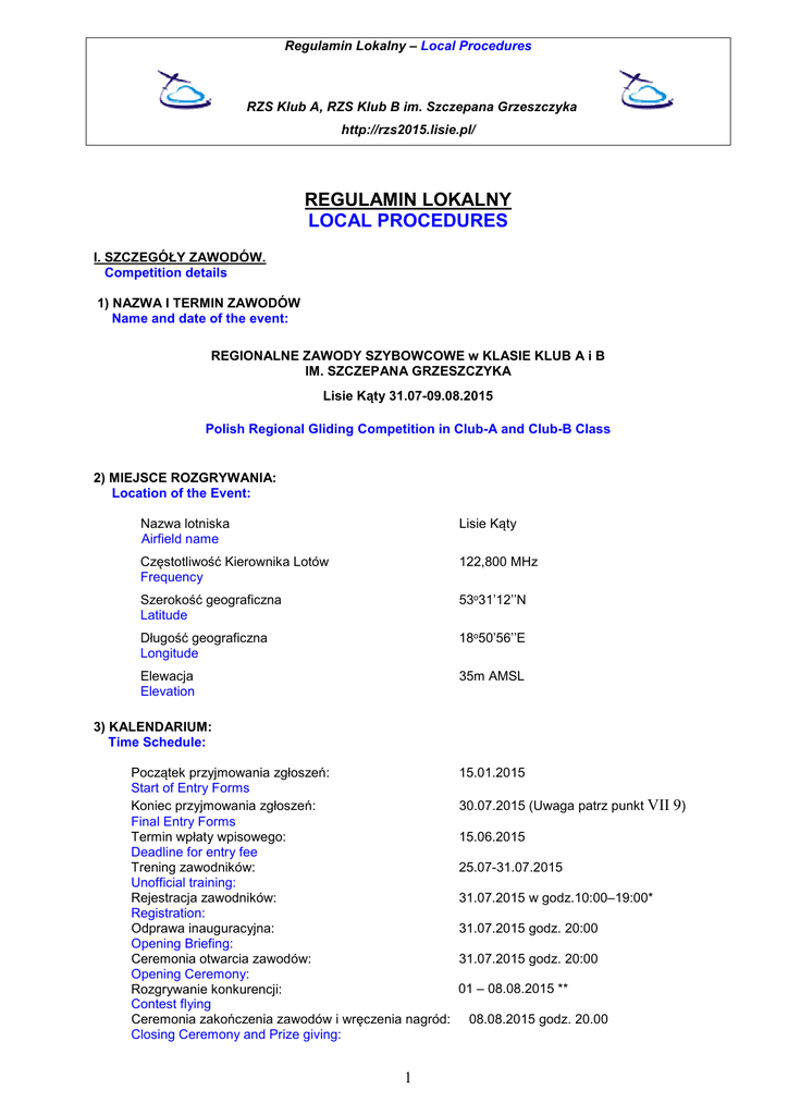 Regulamin Lokalny – Local Procedures RZS Klub A, RZS Klub B im. Szczepana Grzeszczyka http://rzs2015.lisie.pl/ REGULAMIN LOKALNY LOCAL PROCEDURES I. SZCZEGÓŁY ZAWODÓW. Competition details 1) NAZWA I TERMIN ZAWODÓW Name and date of the event: REGIONALNE ZAWODY SZYBOWCOWE w KLASIE KLUB A i B IM. SZCZEPANA GRZESZCZYKA Lisie Kąty 31.07-09.08.2015 Polish Regional Gliding Competition in Club-A and Club-B Class 2) MIEJSCE ROZGRYWANIA: Location of the Event: Nazwa lotniska Airfield name Lisie Kąty Częstotliwość Kierownika Lotów Frequency 122,800 MHz Szerokość geograficzna Latitude 53o31’12’’N Długość geograficzna Longitude 18o50’56’’E Elewacja Elevation 35m AMSL 3) KALENDARIUM: Time Schedule: Początek przyjmowania zgłoszeń: Start of Entry Forms Koniec przyjmowania zgłoszeń: Final Entry Forms Termin wpłaty wpisowego: Deadline for entry fee Trening zawodników: Unofficial training: Rejestracja zawodników: Registration: Odprawa inauguracyjna: Opening Briefing: Ceremonia otwarcia zawodów: Opening Ceremony: Rozgrywanie konkurencji: Contest flying Ceremonia zakończenia zawodów i wręczenia nagród: Closing Ceremony and Prize giving: 1 15.01.2015 30.07.2015 (Uwaga patrz punkt VII 9) 15.06.2015 25.07-31.07.2015 31.07.2015 w godz.10:00–19:00* 31.07.2015 godz. 20:00 31.07.2015 godz. 20:00 01 – 08.08.2015 ** 08.08.2015 godz. 20.00 Regulamin Lokalny – Local Procedures RZS Klub A, RZS Klub B im. Szczepana Grzeszczyka http://rzs2015.lisie.pl/ Termin składania odwołań do Komisji Szybowcowej The deadline for appeals to the Gliding Commission 16.07.2015 *Rejestracja zawodników zostanie zakończona w dniu 31.07.2015 (Piątek) 19:00 czasu lokalnego. Zawodnicy, którzy nie zarejestrują się w powyższym terminie, nie będą dopuszczeni do startu w zawodach i nie otrzymają zwrotu wpisowego! * Registration will be finished on Friday 31.07.2015 at 19.00 Local Time. ** W przypadku, gdy po dniu 08.08.2015 do rozegrania zawodów brakować będzie 1 konkurencja, dzień 09.08.2015 będzie rezerwowym dniem na rozegranie brakującej konkurencji, po której nastąpi ceremonia zakończenia zawodów. ** If there were only 2 valid championship days on Saturday evening, the 09.08.2015 would also be a flying day. In this case the closing ceremony and Prize giving will be held as soon as possible in the evening. 4) KIEROWNICTWO ZAWODÓW: Competition Officials: Dyrektor Zawodów: Competition Director Piotr Czarnowski Kierownik Sportowy: Task Setter Krzysztof Herczyński Asystent Kierownika Sportowego: Assistant Krzysztof Hajduk Kierownik Lotów: Chief of Operations Jakub Jankowiak Kierownik Techniczny: Chief of Technical Staff Karol Lica Sędzia Główny: Chief Scorer Zbigniew Meller Sędzia rezerwowy: Reserve Scorer Wojciech Batog Obsługa Meteorologiczna: Meteorology Krzysztof Herczyński Rzecznik Prasowy: Media Spokesman Waldemar Wingralek Kierownik Finansowy: Financial Manager Monika Celmer Kierownik Administracyjny: Administration Monika Celmer Komisarz Zawodów: Referee Sebastian Stępak 5) ADRES ORGANIZATORA ZAWODÓW ADDRESS OF THE ORGANIZERS 2 Regulamin Lokalny – Local Procedures RZS Klub A, RZS Klub B im. Szczepana Grzeszczyka http://rzs2015.lisie.pl/ Adres: Aeroklub Nadwiślański Lotnisko Lisie Kąty 86-300 Grudziądz (0-56) 468-18-32 (0-56) 468-18-42 [email protected] http://rzs2015.lisie.pl// BGŻ o/Grudziądz 42 1090 2590 0000 0001 2340 6327 Telefon: Fax: e-mail: Internet: Konto bankowe: Bank account: II. CZĘŚĆ OGÓLNA GENERAL 1) Klasy i klasyfikacje na zawodach: Championship Classes and classifications: Regionalne Zawody Szybowcowe w Klasie Klub-A Polish Regional Gliding Competition in Club-A Class Prowadzona będzie jedna klasyfikacja uwzględniająca pilotów polskich i zagranicznych, na szybowcach klasy Klub-A bez balastu wodnego, ze współczynnikami wyrównawczymi zawartymi w Tabeli 1b z Załącznik nr 1 do II Regulaminu Zawodów Szybowcowych. Only one classification will be made. It will contain both Polish and foreign pilots, competing on Club-A class gliders with handicap indexes from Table 1b of Appendix no 1 to the polish rules: II Regulamin Zawodów Szybowcowych. Regionalne Zawody Szybowcowe Klub - B (KZS Klub-B) Polish Regional Gliding Competition in Club-B Class Prowadzona będzie jedna klasyfikacja uwzględniająca pilotów polskich i zagranicznych, na szybowcach klasy Klub-B bez balastu wodnego, ze współczynnikami wyrównawczymi zawartymi w Tabeli 1b II w Załączniku nr 1 do Regulaminu Zawodów Szybowcowych. Wyniki będą obliczane z uwzględnieniem współczynników wyrównawczych zawartych w tejże tabeli. Only one classification will be made. It will contain both Polish and foreign pilots, competing on gliders with handicap indexes from Table 1b of Appendix no 1 the polish rules: II Regulamin Zawodów Szybowcowych. 2) Dodatkowe zasady bezpieczeństwa Additional safety rules a) Kierunek krążenia w kominie termicznym określa szybowiec, który pierwszy rozpoczął krążenie w danym kominie. Direction of circling in thermals is determined by the first glider, which started circling in this thermal. b) Maksymalna prędkość dla pojazdów poruszających się na terenie lotniska nie powinna przekraczać 25 km/h. Vehicle speed limit on the grid is 25 km/h. c) Prawo wjazdu na pole wzlotów uzyskują tylko samochody z identyfikatorem w postaci znaków konkursowych szybowca. Identyfikator powinien być przyklejony w widocznej części samochodu. Przeszkolenie pomocnika w zakresie zasad bezpiecznego poruszania po polu wzlotów jest obowiązkiem pilota. 3 Regulamin Lokalny – Local Procedures RZS Klub A, RZS Klub B im. Szczepana Grzeszczyka http://rzs2015.lisie.pl/ All vehicles entering airfield boundaries should have special identification marks consisting of glider Competition Number, shown in visible way. Pilots have to instruct their crew about all rules while maneuvering on the airfield. 3) Krajowe wymagania dotyczące testów antydopingowych. 