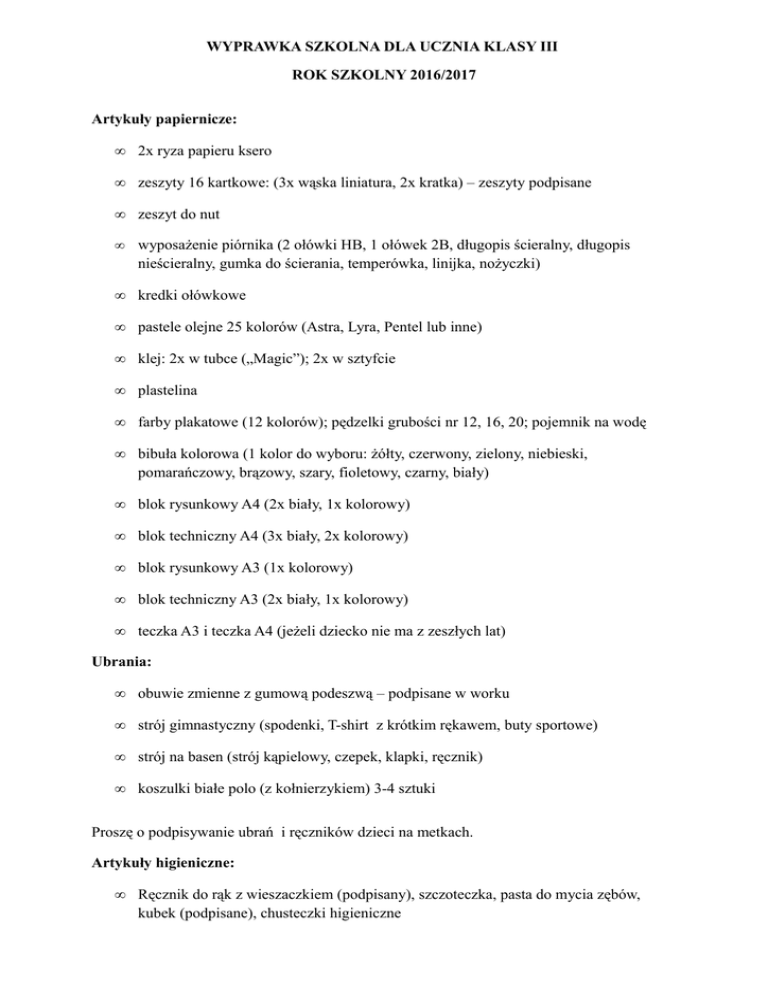 WYPRAWKA SZKOLNA DLA UCZNIA KLASY III ROK SZKOLNY 2016/2017 Artykuły papiernicze: • 2x ryza papieru ksero • zeszyty 16 kartkowe: (3x wąska liniatura, 2x kratka) – zeszyty podpisane • zeszyt do nut • wyposażenie piórnika (2 ołówki HB, 1 ołówek 2B, długopis ścieralny, długopis nieścieralny, gumka do ścierania, temperówka, linijka, nożyczki) • kredki ołówkowe • pastele olejne 25 kolorów (Astra, Lyra, Pentel lub inne) • klej: 2x w tubce („Magic”); 2x w sztyfcie • plastelina • farby plakatowe (12 kolorów); pędzelki grubości nr 12, 16, 20; pojemnik na wodę • bibuła kolorowa (1 kolor do wyboru: żółty, czerwony, zielony, niebieski, pomarańczowy, brązowy, szary, fioletowy, czarny, biały) • blok rysunkowy A4 (2x biały, 1x kolorowy) • blok techniczny A4 (3x biały, 2x kolorowy) • blok rysunkowy A3 (1x kolorowy) • blok techniczny A3 (2x biały, 1x kolorowy) • teczka A3 i teczka A4 (jeżeli dziecko nie ma z zeszłych lat) Ubrania: • obuwie zmienne z gumową podeszwą – podpisane w worku • strój gimnastyczny (spodenki, T-shirt z krótkim rękawem, buty sportowe) • strój na basen (strój kąpielowy, czepek, klapki, ręcznik) • koszulki białe polo (z kołnierzykiem) 3-4 sztuki Proszę o podpisywanie ubrań i ręczników dzieci na metkach. Artykuły higieniczne: • Ręcznik do rąk z wieszaczkiem (podpisany), szczoteczka, pasta do mycia zębów, kubek (podpisane), chusteczki higieniczne