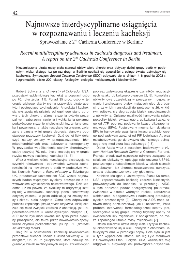 Wspó³czesna Onkologia 42 Najnowsze interdyscyplinarne osi¹gniêcia w rozpoznawaniu i leczeniu kacheksji Sprawozdanie z 2nd Cachexia Conference w Berlinie Recent multidisciplinary advances in cachexia diagnosis and treatment. A report on the 2nd Cachexia Conference in Berlin N i e z a m i e r z o n a u t r a t a m a s y c i a ³ a s t a n o w i o b j a w w i e l u c h o r ó b o r a z d o t y c z y d u ¿ e j g r u p y o s ó b w pode sz³ym wieku, dlatego ju¿ po raz drugi w Berlinie spotkali siê specjaliœci z ca³ego œwiata, zajmuj¹cy siê kacheksj¹. Sympozjum Second Cachexia Conference (SCC) odbywa³o siê w dniach 4–6 grudnia 2003 r. i z g r o m a d z i ³ o b l i s k o 2 0 0 l e k a r z y , f i z j o l o g ó w , b i o l o g ó w m o l e k u l a r n y c h i biochemików. Robert Schwartz z University of Colorado, USA, przedstawi³ epidemiologiê kacheksji w populacji osób po 70. roku ¿ycia [11]. Ponad 35 proc. osób w tej grupie wiekowej skar¿y siê na przewlek³¹ utratê apetytu i postêpuj¹ce wychudzenie. Anoreksja i kacheksja wystêpuj¹ niezale¿nie od ogólnego stanu zdrowia u tych chorych. Wzrost stê¿enia cytokin prozapalnych, zaburzenia trawienia i wch³aniania pokarmu, podwy¿szone stê¿enie cholecystokininy, zmiany smaku i powonienia, a tak¿e restrykcje kaloryczne, zwi¹zane z czêst¹ w tej grupie depresj¹, stanowi¹ podstawowe przyczyny kacheksji. Dziœ do tej listy do³¹czyæ nale¿y zmiany w przepuszczalnoœci b³on mitochondrialnych oraz zaburzenia termogenezy. W przypadku wspó³istnienia stanów chorobowych osoby powy¿ej 70. roku ¿ycia znajduj¹ siê w grupie ryzyka rozwoju nasilonej kacheksji [1, 7]. Wraz z wiekiem roœnie kumulacyjna ekspozycja na czynniki rakotwórcze i odpowiednio wzrasta zachorowalnoœæ na nowotwory u osób w podesz³ym wieku. Kenneth Fearon z Royal Infirmary w Edynburgu, UK, przedstawi³ uczestnikom SCC wyniki najnowszych badañ wi¹¿¹cych cytokiny prozapalne z powstawaniem wyniszczenia nowotworowego. Dziœ wiadomo ju¿ na pewno, ¿e cytokiny te odgrywaj¹ istotn¹ rolê w mediowaniu kacheksji, jednak kontrowersje dotycz¹ zakresu, w jakim oddzia³uj¹ na zmiany masy i sk³adu cia³a pacjenta. Ostra faza odpowiedzi procesu zapalnego (acute phase response, APR) okazuje siê mieæ zwi¹zek zarówno z anoreksj¹, jak i hipermetabolizmem u kachektycznych chorych [1]. APR mo¿e byæ modulowana nie tylko przez cytokiny prozapalne, ale tak¿e przez nowotworowo-specyficzne czynniki prokachteczne, jak np. PIF (proteolisis inducing factor). Rolê PIF w powstawaniu kacheksji nowotworowej przedstawi³ Michael Tisdale z Aston University w Birmingham, UK. PIF to glikoproteina, która indukuje degradacjê bia³ek miofibrylarnych miêœni szkieletowych poprzez zwiêkszon¹ ekspresjê czynników regulacyjnych szlaku ubikwityna-proteasom [2, 5]. Kompleksy ubikwitynowe uczestnicz¹ w precyzyjnym rozpoznawaniu i znakowaniu bia³ek maj¹cych ulec degradacji oraz w ich translokacji do proteasomu 26, w którym odbywa siê degradacja bia³ek zasocjowanych z ubikwityn¹. Opisano mo¿liwoœæ hamowania szlaku proteolizy bia³ek, zwi¹zanego z ubikwityn¹ i zale¿nego od ATP, poprzez podawanie kwasu eikozapentaenowego (EPA). Postulowany mechanizm dzia³ania EPA to hamowanie uwalniania kwasu arachidonowego pod wp³ywem zale¿nej od PIF fosfolipazy A2 oraz metabolizowania go do zwi¹zku chemicznego pe³ni¹cego rolê mediatora katabolicznego [13]. Didier Attaix wraz z zespo³em badawczym z Human Nutrition Research Center z Clermont-Ferrand, Francja, przedstawi³ najnowsze odkrycie zwi¹zane ze szlakiem ubikwityny, opisuj¹c rolê enzymu USP19, powi¹zanego z katabolizmem bia³ek w takich stanach chorobowych, jak choroba nowotworowa, cukrzyca, terapia deksametazonowa czy g³odzenie. Kathleen Mulligan z Uniwersytetu Stanu Kalifornia, USA, zaprezentowa³a kaskadê zdarzeñ klinicznych, prowadz¹cych do kacheksji w przebiegu AIDS, w tym obni¿on¹ poda¿ energetyczn¹ pokarmów, zw³aszcza w okresie wtórnych infekcji, zaburzenia wch³aniania, hipogonadyzm i nadmiern¹ produkcjê cytokin prozapalnych [9]. Chorzy na AIDS trac¹ zarówno masê bezt³uszczow¹. jak i t³uszczow¹. Poza próbami interwencji farmakologicznej istotny jest, szczególnie w tej grupie, trening fizyczny oparty na æwiczeniach si³y miêœniowej z obci¹¿eniem, co mo¿e zapobiegaæ utracie masy miêœniowej [7]. Istotna klinicznie utrata masy cia³a i ryzyko kacheksji obserwowane s¹ u wielu chorych z chorobami infekcyjnymi oraz w przebiegu sepsy. Rola cytokin jest w tych wypadkach istotna, ale wg Lyle Moldawer z Uniwersytetu Stanu Floryda, USA, wa¿niejsz¹ rolê odgrywa tu aktywacja osi podwzgórze-przysadka- 43 -nadnercza oraz udzia³ glikokortykoidów w mediowaniu zmian w obrêbie miêœni szkieletowych [9]. Joseph Walsmith z Uniwersytetu w Bostonie, USA, zaprezentowa³ wyniki badañ nad kacheksj¹ u chorych z reumatoidalnym zapaleniem stawów (RZS). Wzrost poziomu czynnika martwicy nowotworów TNF-α (oraz transformuj¹cego czynnika wzrostu (TGF-β1) u chorych z kacheksj¹ w przebiegu RZS potwierdza rolê cytokin jako lokalnych mediatorów utraty masy miêœniowej [12]. W trakcie SCC zaprezentowano tak¿e obraz kliniczny kacheksji w przebiegu niewydolnoœci nerek, przewlek³ej niewydolnoœci kr¹¿enia oraz przewlek³ej obturacyjnej choroby p³uc [10]. Grupa japoñskich badaczy pod kierunkiem Akio Inui, omówi³a postêp badañ nad grelin¹. Jest to peptyd wydzielany w ¿o³¹dku, stymuluj¹cy pobieranie po¿ywienia oraz obni¿aj¹cy wydatek energetyczny, maj¹cy charakter mediatora oreksogenicznego, zwiêkszaj¹cego masê cia³a. Podobnym czynnikiem jest neuropeptyd Y (NPY) pochodzenia podwzgórzowego. W stanach prowadz¹cych do kacheksji nowotworowej opisuje siê przewagê aktywnoœci leptyny i leptynopochodnych cytokin, antagonizuj¹cych dzia³anie greliny i NPY [6]. Obecnie podejmowane s¹ próby leczenia kacheksji z u¿yciem greliny. Inny potencjalny lek przeciwkachekty