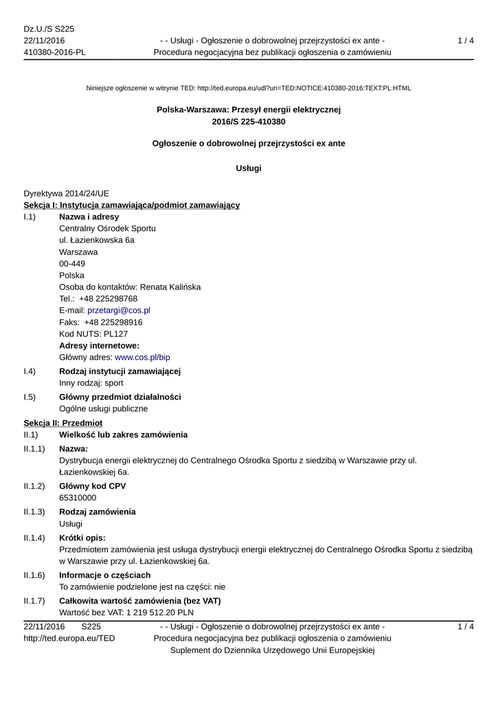 Dz.U./S S225 22/11/2016 410380-2016-PL - - Usługi - Ogłoszenie o dobrowolnej przejrzystości ex ante Procedura negocjacyjna bez publikacji ogłoszenia o zamówieniu 1/4 Niniejsze ogłoszenie w witrynie TED: http://ted.europa.eu/udl?uri=TED:NOTICE:410380-2016:TEXT:PL:HTML Polska-Warszawa: Przesył energii elektrycznej 2016/S 225-410380 Ogłoszenie o dobrowolnej przejrzystości ex ante Usługi Dyrektywa 2014/24/UE Sekcja I: Instytucja zamawiająca/podmiot zamawiający I.1) Nazwa i adresy Centralny Ośrodek Sportu ul. Łazienkowska 6a Warszawa 00-449 Polska Osoba do kontaktów: Renata Kalińska Tel.: +48 225298768 E-mail: [email protected] Faks: +48 225298916 Kod NUTS: PL127 Adresy internetowe: Główny adres: www.cos.pl/bip I.4) Rodzaj instytucji zamawiającej Inny rodzaj: sport I.5) Główny przedmiot działalności Ogólne usługi publiczne Sekcja II: Przedmiot II.1) Wielkość lub zakres zamówienia II.1.1) Nazwa: Dystrybucja energii elektrycznej do Centralnego Ośrodka Sportu z siedzibą w Warszawie przy ul. Łazienkowskiej 6a. II.1.2) Główny kod CPV 65310000 II.1.3) Rodzaj zamówienia Usługi II.1.4) Krótki opis: Przedmiotem zamówienia jest usługa dystrybucji energii elektrycznej do Centralnego Ośrodka Sportu z siedzibą w Warszawie przy ul. Łazienkowskiej 6a. II.1.6) Informacje o częściach To zamówienie podzielone jest na części: nie II.1.7) Całkowita wartość zamówienia (bez VAT) Wartość bez VAT: 1 219 512.20 PLN 22/11/2016 S225 http://ted.europa.eu/TED - - Usługi - Ogłoszenie o dobrowolnej przejrzystości ex ante Procedura negocjacyjna bez publikacji ogłoszenia o zamówieniu Suplement do Dziennika Urzędowego Unii Europejskiej 1/4 Dz.U./S S225 22/11/2016 410380-2016-PL - - Usługi - Ogłoszenie o dobrowolnej przejrzystości ex ante Procedura negocjacyjna bez publikacji ogłoszenia o zamówieniu 2/4 II.2) Opis II.2.1) Nazwa: II.2.2) Dodatkowy kod lub kody CPV 09310000 II.2.3) Miejsce świadczenia usług Kod NUTS: PL127 Główne miejsce lub lokalizacja realizacji: 00-449 Warszawa, ul. Łazienkowska 6a. II.2.4) Opis zamówienia: Przedmiotem zamówienia jest usługa dystrybucji energii elektrycznej do dwóch PPE należących do Centralnego Ośrodka Sportu z siedzibą w Warszawie przy ul. Łazienkowskiej 6a. Szacowana wielkość zużycia energii elektrycznej w okresie 48 miesięcy to 4 800 MWh. II.2.5) Kryteria udzielenia zamówienia II.2.11) Informacje o opcjach Opcje: nie II.2.13) Informacje o funduszach Unii Europejskiej Zamówienie dotyczy projektu/programu finansowanego ze środków Unii Europejskiej: nie II.2.14) Informacje dodatkowe Sekcja IV: Procedura IV.1) Opis IV.1.1) Rodzaj procedury Procedura negocjacyjna bez uprzedniej publikacji • Roboty budowlane/dostawy/usługi mogą być zrealizowane tylko przez określonego wykonawcę z następującego powodu: • brak konkurencji ze względów technicznych Wyjaśnienie: Zakup energii elektrycznej jest nierozerwalnie związany z koniecznością jej dystrybucji od wytwórcy do nabywcy. Prawo Energetyczne definiuje zgodnie z art. 3 pkt 5 pod pojęciem dystrybucja, transport energii elektrycznej sieciami dystrybucyjnymi w celu ich dostarczenia odbiorcom, z wyłączeniem sprzedaży energii. Zgodnie z przepisami, wybór sprzedawcy energii elektrycznej powinien zostać dokonany przez Zamawiającego w sposób zapewniający konkurencję. Natomiast podmiotem świadczącym usługi dystrybucji energii elektrycznej powinien być podmiot, do którego sieci przyłączone są nieruchomości należące do Zamawiającego. O ile istnieje możliwość wyboru sprzedawcy energii, to brak jest możliwości wyboru przedsiębiorstwa energetycznego zajmującego się świadczeniem usług dystrybucji energii elektrycznej. Przedsiębiorstwa te działają w obszarze monopolu naturalnego i Zamawiający nie ma innej możliwości niż zawarcie umowy z Operatorem Sieci Dystrybucyjnej na danym terenie, którym jest w tym przypadku innogy Stoen Operator Sp. z o.o. z siedzibą w Warszawie przy ul. Pięknej 46. Wykonawca ten świadczy usługi przesyłu i dystrybucji energii elektrycznej na obszarze m.st. Warszawy i realizuje zadania Operatora Systemu Dystrybucji w ramach udzielonej koncesji na usługi dystrybucji energii elektrycznej, wydanej przez Prezesa Urzędu Regulacji Energetyki. W/w usługi realizowane są przez Wykonawcę na obszarze m.st. Warszawy własnymi sieciami. Wysokość stawek za dystrybucję energii jest regulowana przez Urząd Regulacji Energetyki i nie podlega negocjacjom. W związku z powyższym uzasadnione jest zastosowanie zamówienia z wolnej ręki, na podstawie art. 67 ust. 1 pkt 1 lit. a ustawy Prawo Zamówień Publicznych. Na poparcie niniejszego uzasadnienia należy przytoczyć opinię 22/11/2016 S225 http://ted.europa.eu/TED - - Usługi - Ogłoszenie o dobrowolnej przejrzystości ex ante Procedura negocjacyjna bez publikacji ogłoszenia o zamówieniu Suplement do Dziennika Urzędowego Unii Europejskiej 2/4 Dz.U./S S225 22/11/2016 410380-2016-PL - - Usługi - Ogłoszenie o dobrowolnej przejrzystości ex ante Procedura negocjacyjna bez publikacji ogłoszenia o zamówieniu 3/4 Prezesa Urzędu Zamówień Publicznych i Prezesa Urzędu Regulacji Energetyki zawartą we wspólnym Komunikacie z dnia 24.4.2008 r. w sprawie stosowania przepisów ustawy Prawo zamówień publicznych w zakresie dostaw energii elektrycznej. W komunikacie tym jednoznacznie stwierdzono, że o ile istnieje możliwość wyboru sprzedawcy energii, to brak jest możliwości wyboru przedsiębiorstwa energetycznego zajmującego się świadczeniem usług dystrybucji energii elektrycznej. Przedsiębiorstwa te działają w obszarze monopolu naturalnego i w takiej sytuacji podmioty objęte obowiązkiem udzielenia zamówień publicznych na dostarczenie energii elektrycznej mają możliwość stosując tryby podstawowe udzielania zamówień, wybrać przedsiębiorstw. IV.1.3) Informacje na temat umowy ramowej IV.1.8) Informacje na temat Porozumienia w sprawie zamó