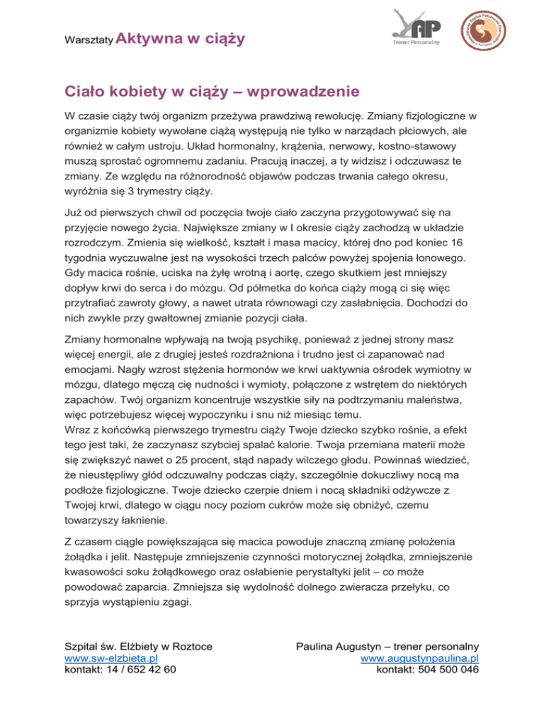 Warsztaty Aktywna w ciąży Ciało kobiety w ciąży – wprowadzenie W czasie ciąży twój organizm przeżywa prawdziwą rewolucję. Zmiany fizjologiczne w organizmie kobiety wywołane ciążą występują nie tylko w narządach płciowych, ale również w całym ustroju. Układ hormonalny, krążenia, nerwowy, kostno-stawowy muszą sprostać ogromnemu zadaniu. Pracują inaczej, a ty widzisz i odczuwasz te zmiany. Ze względu na różnorodność objawów podczas trwania całego okresu, wyróżnia się 3 trymestry ciąży. Już od pierwszych chwil od poczęcia twoje ciało zaczyna przygotowywać się na przyjęcie nowego życia. Największe zmiany w I okresie ciąży zachodzą w układzie rozrodczym. Zmienia się wielkość, kształt i masa macicy, której dno pod koniec 16 tygodnia wyczuwalne jest na wysokości trzech palców powyżej spojenia łonowego. Gdy macica rośnie, uciska na żyłę wrotną i aortę, czego skutkiem jest mniejszy dopływ krwi do serca i do mózgu. Od półmetka do końca ciąży mogą ci się więc przytrafiać zawroty głowy, a nawet utrata równowagi czy zasłabnięcia. Dochodzi do nich zwykle przy gwałtownej zmianie pozycji ciała. Zmiany hormonalne wpływają na twoją psychikę, ponieważ z jednej strony masz więcej energii, ale z drugiej jesteś rozdrażniona i trudno jest ci zapanować nad emocjami. Nagły wzrost stężenia hormonów we krwi uaktywnia ośrodek wymiotny w mózgu, dlatego męczą cię nudności i wymioty, połączone z wstrętem do niektórych zapachów. Twój organizm koncentruje wszystkie siły na podtrzymaniu maleństwa, więc potrzebujesz więcej wypoczynku i snu niż miesiąc temu. Wraz z końcówką pierwszego trymestru ciąży Twoje dziecko szybko rośnie, a efekt tego jest taki, że zaczynasz szybciej spalać kalorie. Twoja przemiana materii może się zwiększyć nawet o 25 procent, stąd napady wilczego głodu. Powinnaś wiedzieć, że nieustępliwy głód odczuwalny podczas ciąży, szczególnie dokuczliwy nocą ma podłoże fizjologiczne. Twoje dziecko czerpie dniem i nocą składniki odżywcze z Twojej krwi, dlatego w ciągu nocy poziom cukrów może się obniżyć, czemu towarzyszy łaknienie. Z czasem ciągle powiększająca się macica powoduje znaczną zmianę położenia żołądka i jelit. Następuje zmniejszenie czynności motorycznej żołądka, zmniejszenie kwasowości soku żołądkowego oraz osłabienie perystaltyki jelit – co może powodować zaparcia. Zmniejsza się wydolność dolnego zwieracza przełyku, co sprzyja wystąpieniu zgagi. Szpital św. Elżbiety w Roztoce www.sw-elzbieta.pl kontakt: 14 / 652 42 60 Paulina Augustyn – trener personalny www.augustynpaulina.pl kontakt: 504 500 046 Warsztaty Aktywna w ciąży U kobiet w ciąży dochodzi do znacznego fizjologicznego zatrzymywania wody w organizmie, w okresie okołoporodowym nawet do 6,5 l wody jest magazynowane w płynie owodniowym, płodzie, łożysku, we krwi, macicy i piersiach. Ciało ciężarnej obrzmiewa najczęściej w okolicy kostek, stóp oraz dłoni i palców, jest to widoczne pod koniec dnia lub po długiem przebywaniu w cieple. Wkrótce po poczęciu dziecka zaczynają zachodzić znaczące zmiany w układzie krążenia. Do najważniejszych należy zwiększenie ilości krwi – około 30 tygodnia ciąży w Twoim ciele będzie krążyć o 50 % więcej krwi, co spowoduje, że ciągle będzie Ci za ciepło. Jeśli w układzie krwionośnym jest więcej krwi, jej obieg staje się przez to wolniejszy, a nacisk powiększającej się macicy dodatkowo będzie utrudniał jej prawidłowy przepływ. Krew będzie miała tendencję do zastoju w naczyniach krwionośnych nóg, dlatego mogą one puchnąć o czym wspomniałam wcześniej. Objętość krwi zwiększa się powoli w I trymestrze ciąży, w II trymestrze znacznie, by w ostatnich tygodniach ciąży pozostawać na niezmienionym poziomie. U niektórych ciężarnych oprócz wzrostu objętości krwi, mogą nastąpić zmiany w morfologii krwi. Częstą przypadłością u kobiet w ciąży jest niedokrwistość będąca skutkiem niedoboru żelaza, co wymusza dodatkową suplementacje tym pierwiastkiem, zwykle pojawia się w 32-34 tygodniu ciąży. Następuje przyspieszenie czynności serca o ok. 10-15 skurczów na minutę. Powiększająca się macica uciska na duże naczynia krwionośne – od połowy ciąży na tętnicę główną – co upośledzenia ukrwienia miejsca łożyskowego (należy unikać leżenia w pozycji na wznak), a później na żyłę główną dolną – w wyniku czego mogą wystąpić burzliwe objawy ograniczenia dopływu krwi do prawego serca (zespół żyły głównej dolnej). Być może zaczniesz odczuwać także skurcze łydek. Wraz z postępem ciąży stają się one coraz częstsze i bardziej bolesne, niestety nie wiadomo dokładnie co je powoduje. Jedna teoria mówi, że są to niedobory magnezu lub wapnia, inna stwierdza, że przyczyną może być gromadzenie się płynów w nogach w porze wieczornej lub osłabienie krążenia, które narasta w pozycji siedzącej. Zmiany hormonalne i rozrost macicy wpływają na górne drogi oddechowe, powodując uniesienie przepony o 4 cm, zwiększenie wymiaru poprzecznego klatki piersiowej o 2 cm, a obwodu klatki piersiowej o 6 cm. Kobieta jest bardziej wrażliwa na dwutlenek węgla. Już od początku ciąży u połowy kobiet pojawia się duszność w czasie wysiłku lub spoczynku. Nie jest ona oznaką zaburzeń w układzie oddechowym ani sercowo-naczyniowym, a ze względu na częstość występowania Szpital św. Elżbiety w Roztoce www.sw-elzbieta.pl kontakt: 14 / 652 42 60 Paulina Augustyn – trener personalny www.augustynpaulina.pl kontakt: 504 500 046 Warsztaty Aktywna w ciąży określa się ją jako duszność fizjologiczną. Niewykluczone, że pod koniec ciąży będzie trapiła Cię zadyszka, to efekt zwiększonego wydzielania progesteronu, który przyspiesza oddech, a w ostatnim trymestrze macica uciska dodatkowo na przeponę i płu