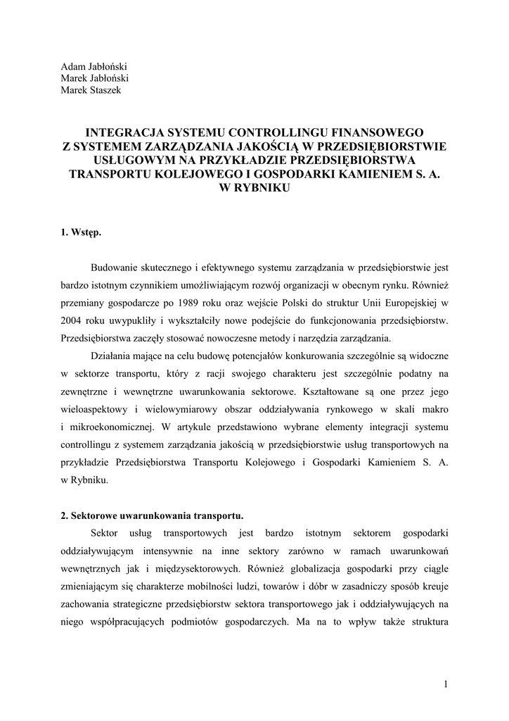 Adam Jabłoński Marek Jabłoński Marek Staszek INTEGRACJA SYSTEMU CONTROLLINGU FINANSOWEGO Z SYSTEMEM ZARZĄDZANIA JAKOŚCIĄ W PRZEDSIĘBIORSTWIE USŁUGOWYM NA PRZYKŁADZIE PRZEDSIĘBIORSTWA TRANSPORTU KOLEJOWEGO I GOSPODARKI KAMIENIEM S. A. W RYBNIKU 1. Wstęp. Budowanie skutecznego i efektywnego systemu zarządzania w przedsiębiorstwie jest bardzo istotnym czynnikiem umoŜliwiającym rozwój organizacji w obecnym rynku. RównieŜ przemiany gospodarcze po 1989 roku oraz wejście Polski do struktur Unii Europejskiej w 2004 roku uwypukliły i wykształciły nowe podejście do funkcjonowania przedsiębiorstw. Przedsiębiorstwa zaczęły stosować nowoczesne metody i narzędzia zarządzania. Działania mające na celu budowę potencjałów konkurowania szczególnie są widoczne w sektorze transportu, który z racji swojego charakteru jest szczególnie podatny na zewnętrzne i wewnętrzne uwarunkowania sektorowe. Kształtowane są one przez jego wieloaspektowy i wielowymiarowy obszar oddziaływania rynkowego w skali makro i mikroekonomicznej. W artykule przedstawiono wybrane elementy integracji systemu controllingu z systemem zarządzania jakością w przedsiębiorstwie usług transportowych na przykładzie Przedsiębiorstwa Transportu Kolejowego i Gospodarki Kamieniem S. A. w Rybniku. 2. Sektorowe uwarunkowania transportu. Sektor usług transportowych jest bardzo istotnym sektorem gospodarki oddziaływującym intensywnie na inne sektory zarówno w ramach uwarunkowań wewnętrznych jak i międzysektorowych. RównieŜ globalizacja gospodarki przy ciągle zmieniającym się charakterze mobilności ludzi, towarów i dóbr w zasadniczy sposób kreuje zachowania strategiczne przedsiębiorstw sektora transportowego jak i oddziaływujących na niego współpracujących podmiotów gospodarczych. Ma na to wpływ takŜe struktura 1 i charakter systemu transportowego wyznaczonego przez sieć transportową zawierającą między innymi: - struktury sieci transportowej; - charakterystyki technicznych sieci transportowych; - potoki ruchu; - sposoby organizowania ruchu w sieci transportowej.1 W tak przedstawionej interpretacji transport jest funkcją pozwalającą na przepływ zasobów z miejsca o niskim na nie zapotrzebowaniu do miejsca, gdzie zapotrzebowanie na zasoby jest wyŜsze. W taki sposób, więc zaspokajane są jednocześnie potrzeby, preferencje i Ŝyczenia człowieka lub grupy osób. Transport ma znaczący wpływ na czas, koszt i jakość wytwarzanych na danym obszarze usług, dlatego teŜ występuje we wszystkich branŜach gospodarki i jest nieodzownym elementem ich systemów zarządzania. Usługową rolę transportu i jego kluczowe znaczenie w systemie gospodarki narodowej rozpatruje się w głównej mierze poprzez układ zewnętrznych i wewnętrznych cech techniczno – eksploatacyjnych i ekonomicznych przemieszczania. Do cech zewnętrznych moŜna zaliczyć: czas przewozu; czas realizacji czynności przygotowawczych; warunki nadania i odbioru (dowozu i odwozu); częstotliwość przewozu; odległość nadawcy lub odbiorcy od punktu nadania lub odbioru; terminowość przewozu; bezpieczeństwo przewozu i ładunku; warunki w jakich odbywa się przewóz. Do cech wewnętrznych moŜna zaliczyć: dostępność – co w rozumieniu logistycznym oznacza moŜliwość umieszczania danego ładunku na konkretnym pojeździe; niezawodność – zgodność wykonania przewozu z załoŜonym planem; moŜliwość kontroli i monitorowania przewozów czyli odpowiedni dostęp do swoich systemów informacyjnych w celu aktualizowania danych dotyczących statusu przesyłki; elastyczność – moŜliwość sprostania nadzwyczajnym potrzebom (np. przyspieszenie nadania przesyłki); 1 J. Leszczyński, Modelowanie systemów i procesów transportowych, Politechnika Warszawska, Warszawa 1999. 2 stawki przewozowe – opłaty za przewóz jednostki węglowej ładunku na określoną odległość. Wielowymiarowa kombinacja w/w cech charakterystycznych dla sektora usług transportowych w sposób kompleksowy kształtuje jego system zaleŜności wewnętrznych i zewnętrznych w układzie podmiotowym i przedmiotowym. Specyfiką sektora transportu wzbogaca ponadto substytutowy charakter sektora wyraŜony zarówno środkiem transportu (kolejowy, samochodowy, lotniczy, morski) jak i trasą przejazdu ograniczoną wytworzona i rozbudowaną infrastrukturą transportową. W takim rozbudowanym układzie przestrzennym rywalizujące rodzaje transportu poprzez odpowiednie struktury organizacyjne przedsiębiorstw porównują między sobą kryteria, wzorce i wskaźniki odniesienia. Zatem specyfika sektora transportowego szczególnie jest wyraźne w aspekcie rozpatrywania go w układzie pięciu sił Portera. Pięć sił konkurencyjnych – wejście, groźbę substytucji, siła przetargowa klientów, siła przetargowa dostawców i rywalizacja obecnych konkurentów – odzwierciedla fakt, Ŝe konkurencja w danym sektorze wykracza znacznie poza dotychczasowych uczestników gry. Konkurentami firm są klienci, dostawcy, substytuty oraz ewentualni nowo wchodzący. W zaleŜności od konkretnych warunków mogą oni odgrywać większą lub mniejszą rolę. W tym szerszym znaczeniu konkurencję moŜna określić jako rozszerzoną rywalizację.2 Taką rozszerzoną rywalizację charakteryzuje wielopodmiotowość i wielowymiarowość sektora transportowego rozpatrywanego w bardzo szerokim kryterium otoczenia w aspekcie jego dynamicznej niestabilności i turbulencji. Zwłaszcza, Ŝe otoczenie podobnie jak przedsiębiorstwo jest pewnym systemem i jak kaŜdy system składa się z róŜnych elementów oraz wzajemnych, często wielce skomplikowanych powiązań, relacji między tymi elementami. Te relacje zachodzą w róŜnych kierunkach – czasami stają się mocniejsze, czasami ulegają osłabieniu. Powoduje to jednak ciągłe zmiany, drgania, przepływy w ramach systemu, jakim jest otoczenie.3 Tak rozpatrując sektor transportowy szczególne znaczenie ma zaró