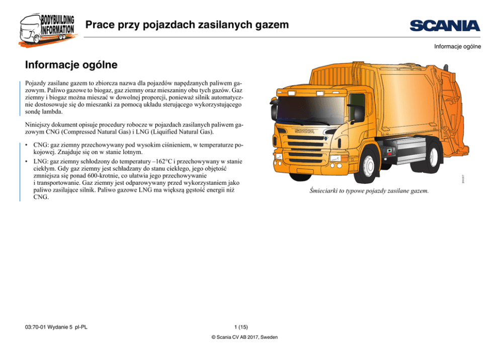 Prace przy pojazdach zasilanych gazem Informacje ogólne Informacje ogólne Pojazdy zasilane gazem to zbiorcza nazwa dla pojazdów napędzanych paliwem gazowym. Paliwo gazowe to biogaz, gaz ziemny oraz mieszaniny obu tych gazów. Gaz ziemny i biogaz można mieszać w dowolnej proporcji, ponieważ silnik automatycznie dostosowuje się do mieszanki za pomocą układu sterującego wykorzystującego sondę lambda. • CNG: gaz ziemny przechowywany pod wysokim ciśnieniem, w temperaturze pokojowej. Znajduje się on w stanie lotnym. • LNG: gaz ziemny schłodzony do temperatury –162°C i przechowywany w stanie ciekłym. Gdy gaz ziemny jest schładzany do stanu ciekłego, jego objętość zmniejsza się ponad 600-krotnie, co ułatwia jego przechowywanie i transportowanie. Gaz ziemny jest odparowywany przed wykorzystaniem jako paliwo zasilające silnik. Paliwo gazowe LNG ma większą gęstość energii niż CNG. 03:70-01 Wydanie 5 pl-PL 1 (15) © Scania CV AB 2017, Sweden 319 517 Niniejszy dokument opisuje procedury robocze w pojazdach zasilanych paliwem gazowym CNG (Compressed Natural Gas) i LNG (Liquified Natural Gas). Śmieciarki to typowe pojazdy zasilane gazem. Prace przy pojazdach zasilanych gazem Obsługa pojazdów zasilanych gazem w warsztacie Obsługa pojazdów zasilanych gazem w warsztacie Środki ostrożności OSTRZEŻENIE! Pracując przy pojeździe z silnikiem gazowym, należy zawsze wykonywać poniższe czynności: • Nigdy nie uzupełniaj paliwa w pojeździe bezpośrednio przed wprowadzeniem do warsztatu. Jest to szczególnie ważne, gdy temperatura powietrza na zewnątrz jest niska, ponieważ ciśnienie gazu wzrasta w wyższej temperaturze (dotyczy wyłącznie pojazdów zasilanych CNG). • Firma Scania zaleca, aby sprawdzić pojazd pod kątem wycieków gazu niezwłocznie po jego wprowadzeniu do warsztatu. Więcej informacji zamieszczono w części pt. „Sprawdzenie pojazdu pod kątem wycieków gazu w warsztacie”. • Żadne nieupoważnione ani nieprzeszkolone osoby nie mogą modyfikować ani wymontowywać instalacji gazowej, w tym zbiorników gazu. Praca z instalacją gazową i zbiornikami gazu może być wykonywana wyłącznie przez osoby zatwierdzone przez firmę Scania i mające dostateczną wiedzę w kwestii gazu. Skontaktuj się z warsztatem firmy Scania. • Instalacja gazowa i zbiorniki gazowe muszą być chronione podczas prac stwarzających zagrożenie pożarowe w pojeździe lub warsztacie. Prace stwarzające zagrożenie pożarowe to spawanie, szlifowanie i innego rodzaju obróbka metali skutkująca wysoką temperaturą i powstawaniem iskier. • Przestrzegaj odpowiednich lokalnych przepisów dotyczących obchodzenia się z paliwem gazowym. Na przykład: – Krajowe przepisy BHP – Przepisy regulujące zasady pracy przy zbiornikach pod ciśnieniem – Przepisy dotyczące materiałów wybuchowych 03:70-01 Wydanie 5 pl-PL 2 (15) © Scania CV AB 2017, Sweden Prace przy pojazdach zasilanych gazem Obsługa pojazdów zasilanych gazem w warsztacie • Poinformuj wszystkich pracowników warsztatu o podstawowych zagrożeniach związanych z paliwem gazowym. Korzystaj ze znaków ostrzegawczych informujących o trwającej pracy z paliwem łatwopalnym. Znaki ostrzegawcze muszą być sporządzone w języku lokalnym. Przestrzegaj stosownych lokalnych przepisów dotyczących projektowania znaków ostrzegawczych. • Paliwo gazowe jest wysoce łatwopalne, może być bezwonne i bezbarwne. • Nie umieszczaj podzespołów zbyt blisko układu wydechowego, ponieważ temperatura spalin podczas pracy na biegu jałowym jest wyższa w przypadku pojazdów zasilanych gazem niż pojazdów na olej napędowy. • W pobliżu pojazdów zasilanych gazem nie wolno palić tytoniu. 365 213 Działania zabezpieczające w przypadku pożaru OSTRZEŻENIE! 03:70-01 Wydanie 5 pl-PL Przykładowy znak ostrzegawczy 381 185 • Wyprowadź pojazd z warsztatu. • Nigdy nie próbuj gasić płomienia gazu. Zamiast tego spróbuj odciąć dopływ gazu. Przenieś wszelkie materiały, które mogą ulec zapłonowi. • W przypadku zapłonu LNG użyj gaśnicy proszkowej. Nie stosuj wody ani dwutlenku węgla do gaszenia pożaru, ponieważ spowoduje to szybsze odparowanie LNG, co z kolei doprowadzi do wzmożenia pożaru. • W razie pożaru nie próbuj schładzać bezpieczników topikowych w pojeździe zasilanym CNG, patrz rysunek. Aktywacja bezpieczników topikowych następuje w temperaturze 110°C. Gaz zostaje wówczas uwolniony. Zapobiega to nadmiernemu wzrostowi ciśnienia powodującemu wybuch zbiornika gazu. Umiejscowienie bezpieczników topikowych na zbiorniku gazu CNG, odpowiednio z przodu i z tyłu 3 (15) © Scania CV AB 2017, Sweden Prace przy pojazdach zasilanych gazem Sprawdzenie pojazdu pod kątem wycieków gazu w warsztacie Sprawdzenie pojazdu pod kątem wycieków gazu w warsztacie Prace przygotowawcze 381 186 Upewnij się, że: • Osoby wykonujące prace są świadome zagrożeń związanych z gazem, dysponują wiedzą na temat działania wykrywacza gazu (numer części: 2 380 848) i potrafią go używać. • Wykrywacz gazu był kalibrowany w ciągu ostatnich 12 miesięcy. • Wszystkie obszary zagrożenia zbadano wykrywaczem gazu. Postępujesz zgodnie ze wszystkimi punktami zawartymi w części pt. „Opis prac”. • Wokół pojazdu oraz przy wejściu umieszczono znaki ostrzegawcze informujące o trwającej pracy z paliwem łatwopalnym. • Dotyczy wyłącznie pojazdów zasilanych LNG: paliwo gazowe jest odprowadzane na zewnątrz z przewodu wentylacyjnego pojazdu za pośrednictwem przewodu giętkiego, oraz że przy wylocie znajduje się znak ostrzegawczy. Wykrywacze gazu można nabyć u dealera firmy Scania. 03:70-01 Wydanie 5 pl-PL 4 (15) © Scania CV AB 2017, Sweden Wykrywacz gazu. Prace przy pojazdach zasilanych gazem Sprawdzenie pojazdu pod kątem wycieków gazu w warsztacie Opis prac Wprowadź pojazd do warsztatu: 1. Dotyczy wyłącznie pojazdów zasilanych LNG: podłącz przewód giętki do przew