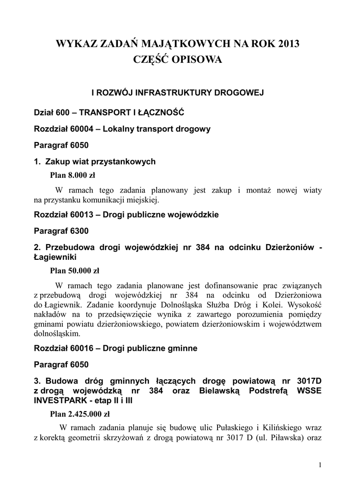 WYKAZ ZADAŃ MAJĄTKOWYCH NA ROK 2013 CZĘŚĆ OPISOWA I ROZWÓJ INFRASTRUKTURY DROGOWEJ Dział 600 – TRANSPORT I ŁĄCZNOŚĆ Rozdział 60004 – Lokalny transport drogowy Paragraf 6050 1. Zakup wiat przystankowych Plan 8.000 zł W ramach tego zadania planowany jest zakup i montaż nowej wiaty na przystanku komunikacji miejskiej. Rozdział 60013 – Drogi publiczne wojewódzkie Paragraf 6300 2. Przebudowa drogi wojewódzkiej nr 384 na odcinku Dzierżoniów Łagiewniki Plan 50.000 zł W ramach tego zadania planowane jest dofinansowanie prac związanych z przebudową drogi wojewódzkiej nr 384 na odcinku od Dzierżoniowa do Łagiewnik. Zadanie koordynuje Dolnośląska Służba Dróg i Kolei. Wysokość nakładów na to przedsięwzięcie wynika z zawartego porozumienia pomiędzy gminami powiatu dzierżoniowskiego, powiatem dzierżoniowskim i województwem dolnośląskim. Rozdział 60016 – Drogi publiczne gminne Paragraf 6050 3. Budowa dróg gminnych łączących drogę powiatową nr 3017D z drogą wojewódzką nr 384 oraz Bielawską Podstrefą WSSE INVESTPARK - etap II i III Plan 2.425.000 zł W ramach zadania planuje się budowę ulic Pułaskiego i Kilińskiego wraz z korektą geometrii skrzyżowań z drogą powiatową nr 3017 D (ul. Piławska) oraz 1 z drogą wojewódzką nr 384 (ul. Dzierżoniowska) oraz budowę łącznika komunikującego Bielawską Podstrefą WSSE „INVESTPARK”. Szacunkowy koszt zadania opiewa na kwotę 4.850.000 zł. Pierwszy etap przedsięwzięcia został wykonany w roku 2012. Obecnie Gmina Bielawa ubiega się o dofinansowanie przedmiotowego zadania, w ramach Narodowego Programu Przebudowy Dróg Lokalnych 2012 – 2015. System punktowej oceny wniosków preferuje przedsięwzięcia realizowane przez samorządy w partnerstwie. 4. Budowa drogi gminnej prowadzącej do zdegradowanych terenów po zlikwidowanych zakładach włókienniczych w Bielawie Plan 50.000 zł W ramach zadania planuje się wykonanie dokumentacji projektowej przebudowy ul. Lotniczej do parametrów umożliwiających przejazd pojazdów o nacisku 115 kN na oś. W celu odwodnienia drogi zostanie wybudowana kanalizacja deszczowa. Pas drogowy zostanie oświetlony lampami sodowymi na słupach stalowych. Gmina zamierza ubiegać się o dofinansowanie przedmiotowego zadania w ramach Regionalnego Programu Operacyjnego Województwa Dolnośląskiego na lata 2007 – 2013. Jeżeli wniosek Gminy zostanie wybrany do dofinansowania, zadanie będzie realizowane w latach 2013 – 2014. 5. Modernizacja nawierzchni gminnych ciągów komunikacyjnych Plan 200.000 zł W ramach zadania planowana jest kontynuacja modernizacji nawierzchni gminnych ciągów komunikacyjnych. Do realizacji zostaną wskazane ulice i chodniki po przeglądzie ich stanu technicznego po okresie zimowym 2012/2013. 6. Przebudowa dróg – projekty Plan 100.000 zł W ramach zadania zostaną opracowane projekty budowlane przebudowy dróg, które Gmina będzie chciała zgłosić do Narodowego Programu Przebudowy Dróg Lokalnych na lata 2012-2015. 2 II ROZWÓJ BAZY TURYSTYCZNEJ, SPORTOWEJ I WYPOCZYNKOWEJ Dział 900 – GOSPODARKA KOMUNALNA I OCHRONA ŚRODOWISKA Rozdział 90004 – Utrzymanie zieleni w miastach i gminach Paragraf 6050 7. Ekologiczne Ogrody Dydaktyczne w Bielawie Plan 150.000 zł W ramach zadania planuje się m.in. wykonanie dokumentacji projektowej dotyczącej adaptacji Parku Miejskiego w Bielawie na Ekologiczne Ogrody Dydaktyczne. W ramach realizacji zadania planowane jest wykonanie cięć pielęgnacyjnych drzewostanu, ustawienie nowych ławek i koszy. Planowana jest modernizacja oświetlenia terenu, poprawa stanu technicznego ścieżek parkowych. Gmina zamierza ubiegać się o dofinansowanie przedmiotowego zadania w ramach Regionalnego Programu Operacyjnego Województwa Dolnośląskiego na lata 2007 – 2013. Jeżeli wniosek Gminy zostanie wybrany do dofinansowania, zadanie będzie realizowane w latach 2013 – 2014. Rozdział 90095 – Pozostała działalność Paragraf 6050 8. Zagospodarowanie zdegradowanych terenów wokół zbiornika wody przemysłowej w Bielawie na potrzeby Ośrodka Wypoczynkowego „Sudety” Plan 50.000 zł W ramach zadania planuje się wykonanie dokumentacji projektowej dotyczącej zagospodarowania Ośrodka Wypoczynkowego „Sudety” w Bielawie. Gmina zamierza ubiegać się o refundację poniesionych wydatków (budowa placu Elfickiego oraz zakup i montaż fontanny) oraz o dofinansowanie przedmiotowego zadania (budowa ciągów spacerowych oraz siłowni plenerowej) w ramach Regionalnego Programu Operacyjnego Województwa Dolnośląskiego na lata 2007 – 2013. Jeżeli wniosek Gminy zostanie wybrany do dofinansowania, zadanie będzie realizowane w latach 2013 – 2014. 3 Dział 926 – KULTURA FIZYCZNA I SPORT Rozdział 92601 – Obiekty sportowe Paragraf 6050 9. Budowa hali sportowej Plan 40.000 zł W ramach realizacji zadania planowane jest wykonanie dokumentacji projektowej w przypadku podjęcia przez Gminę starań o pozyskanie środków zewnętrznych na dofinansowanie zadania. Rodzaj dokumentacji uzależniony będzie od wymagań ogłoszonego konkursu. 10. Ekomodernizacja AQUARIUS systemu energetycznego Pływalni Miejskiej Plan 370.000 zł W ramach zadania planuje się: - odzysk i wtórne wykorzystanie energii cieplnej z powietrza poprzez modernizację i wymianę urządzeń oraz systemów wentylacji i rekuperacji, - odzysk i wtórne wykorzystanie energii cieplnej z wody poprzez montaż nowych urządzeń oraz systemu wymienników ciepła typu woda/ścieki na obiegu z natrysków, umywalek i filtrów, - instalację modułu do produkcji energii w kogeneracji, - modernizację źródła ciepła m.in. poprzez wymianę palnika gaz-olej na palnik modulowany. Szacunkowy koszt zadania opiewa na kwotę 2.500.000 zł. Obecnie Gmina Bielawa ubiega się o dofinansowanie przedmiotowego zadania, w ramach Regionalnego Programu Operacyjnego Województwa Dolnośląskiego na lata 2007 – 2013. Jeżeli wniosek Gminy zostanie wybra