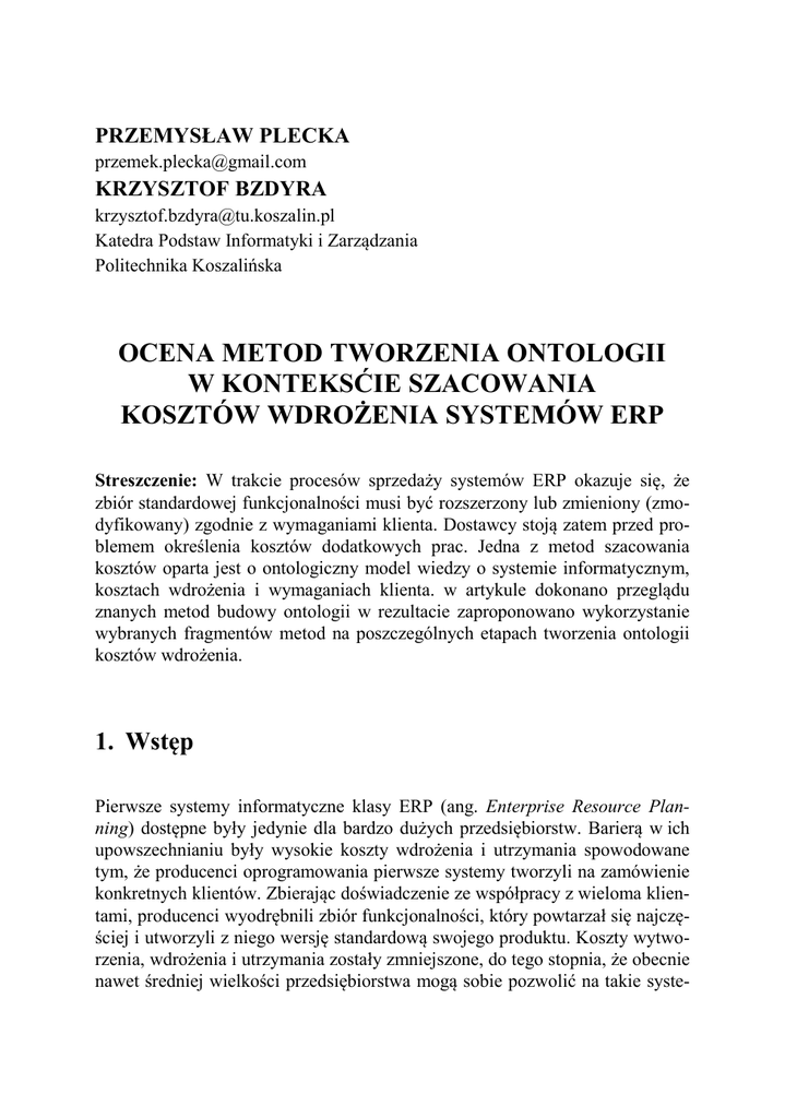 PRZEMYSŁAW PLECKA [email protected] KRZYSZTOF BZDYRA [email protected] Katedra Podstaw Informatyki i Zarządzania Politechnika Koszalińska OCENA METOD TWORZENIA ONTOLOGII W KONTEKSĆIE SZACOWANIA KOSZTÓW WDROŻENIA SYSTEMÓW ERP Streszczenie: W trakcie procesów sprzedaży systemów ERP okazuje się, że zbiór standardowej funkcjonalności musi być rozszerzony lub zmieniony (zmodyfikowany) zgodnie z wymaganiami klienta. Dostawcy stoją zatem przed problemem określenia kosztów dodatkowych prac. Jedna z metod szacowania kosztów oparta jest o ontologiczny model wiedzy o systemie informatycznym, kosztach wdrożenia i wymaganiach klienta. w artykule dokonano przeglądu znanych metod budowy ontologii w rezultacie zaproponowano wykorzystanie wybranych fragmentów metod na poszczególnych etapach tworzenia ontologii kosztów wdrożenia. 1. Wstęp Pierwsze systemy informatyczne klasy ERP (ang. Enterprise Resource Planning) dostępne były jedynie dla bardzo dużych przedsiębiorstw. Barierą w ich upowszechnianiu były wysokie koszty wdrożenia i utrzymania spowodowane tym, że producenci oprogramowania pierwsze systemy tworzyli na zamówienie konkretnych klientów. Zbierając doświadczenie ze współpracy z wieloma klientami, producenci wyodrębnili zbiór funkcjonalności, który powtarzał się najczęściej i utworzyli z niego wersję standardową swojego produktu. Koszty wytworzenia, wdrożenia i utrzymania zostały zmniejszone, do tego stopnia, że obecnie nawet średniej wielkości przedsiębiorstwa mogą sobie pozwolić na takie syste- 102 Przemysław Plecka, Krzysztof Bzdyra my [1]. Standaryzacja wiąże się jednak z tym, że istnieją grupy procesów w przedsiębiorstwie, którym nie odpowiada żadna funkcjonalność w standardowym systemie ERP. W odpowiedzi na takie wymaganie dostawcy rozszerzyli swoje oferty o przystosowanie (ang. customization) rozwiązań do specyficznych potrzeb użytkowników [2]. W efekcie, dla systemów wielodziedzinowych takich, jak ERP, trudno mówić o jednym „standardowym” rozwiązaniu. Mimo, że wejściowy system ERP jest standardowy (taki sam dla danego dostawcy), to po przystosowaniu i wdrożeniu, każde rozwiązanie końcowe jest inne, tak jak każde przedsiębiorstwo jest inne w zakresie organizacji procesów w nim zachodzących. Konieczność częstych zmian oprogramowania wymusza konieczność trafnej wyceny tychże zamian. Warto zauważyć, że po podpisaniu kontraktu przez dostawcę i klienta koszty prac, które nie zostaną wykazane w SLA (ang. Service Level Agreement) obciążą dostawcę obniżając rentowność przedsięwzięcia. Z drugiej natomiast strony zbyt wysoka wycena, która w założeniu ma pokryć wszelkie nieprzewidywane koszty, obniża konkurencyjność dostawcy. Znanych jest wiele metod pozwalających na wycenę przedsięwzięcia IT (ang. Information Technology) [3]. Stosowanie tych metod jest ograniczone ze względu na informacje o wymaganiach klienta, którymi dysponuje dostawca w poszczególnych fazach cyklu przygotowawczego (opisane w publikacjach Plecka i Bzdyra np. [4]). Właśnie ze względu na te uwarunkowania, metody szacowania kosztów można podzielić na: grupa 1 - metody wykorzystywane na etapie rozmów handlowych, kiedy dostawcy posiadają niepełne informacje, co do wymagań klienta, np.: indywidualna ocena eksperta, ocena grupy ekspertów, grupa 2 - metody wykorzystywane na etapie analizy wdrożeniowej, kiedy dostawcy posiadają pełną informację na temat wymagań klienta, np.: Analiza Punktów Funkcyjnych (ISO/IEC 20926:2009), Analiza Pełnych Punktów Funkcyjnych COSMIC (ISO/IEC 19761:2011), itp., grupa 3 - metody wykorzystywane na etapie projektu, kiedy oprócz wymagań klienta znane są składowe projektu, takie jak encje z relacjami, obiekty z metodami, interfejsy, itp., np.: metoda COCOMO. Mając na uwadze proces negocjacji kontraktu, dostawcom zależy na jak najdokładniejszej wycenie kosztów metodami z grupy 1. Aby pozyskać odpowiednie informacje do szacowanie, niektórzy autorzy (np. Plecka i Bzdyra [5]) proponują rozwiązania oparte na ontologii, rozumianej zarówno, jako baza wiedzy o SI (System Informatyczny), jak również o samym procesie wdrożenia (w tym działań związanych z modyfikacjami). Mimo, że rozwiązanie takie pozbawione jest ograniczeń, jakie posiadają inne metody wymiarowania, to popu- Ocena metod tworzenia ontologii… 103 larność jego jest znikoma. Przyczyn należy upatrywać w trudnościach przy tworzenia i konserwacji ontologii, chociaż w literaturze opisano szereg metod budowaniu ontologii [6, 7]. Celem niniejszej pracy jest przedstawienie sposobów budowania modeli ontologicznych oraz ich ocena w kontekście późniejszego wykorzystania w procesie szacowania oprogramowania. w rozważanym przypadku poszukiwana jest odpowiedź na pytanie, która z istniejących metod jest odpowiednia dla procesu tworzenia i utrzymywania bazy wiedzy o kosztach wdrożenia mając na uwadze koszty dostawcy systemu ERP. W pierwszym rozdziale scharakteryzowano proces budowania ontologii kosztów wdrożenia, określono jego specyficzne elementy i etapy tworzenia. Następnie zweryfikowano przydatność znanych metod uwzględniając warunki określone w poprzednim rozdziale i zaproponowano wykorzystanie rozwiązania składające się z fragmentów znanych metod. Takie podejście zilustrowano na przykładzie budowania ontologii kosztów systemu informatycznego i kosztów jego wdrożenia. w ostatnim rozdziale wskazano kierunki dalszych badań. 2. Ontologia - reprezentacja wiedzy o wymaganiach Skoro, jak wspomniano we wstępie, podstawą metod szacujących są dane o przedsiębiorstwie, to rozwiązaniem problemu dokładniejszego szacowania kosztów wdrożenia może być wspólna baza wiedzy o SI i przedsiębiorstwie, która będzie obejmowała: statyczny model oprogramowania (dane i ich relacje, np. w powiązane z kodem UML), dynamiczne modele obsługiwanych przez oprogramowanie procesów