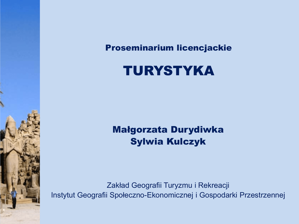 Proseminarium licencjackie TURYSTYKA Małgorzata Durydiwka Sylwia Kulczyk Zakład Geografii Turyzmu i Rekreacji Instytut Geografii Społeczno-Ekonomicznej i Gospodarki Przestrzennej Zakład Geografii Turyzmu i Rekreacji prof. dr hab. Andrzej Kowalczyk • Zagospodarowanie i planowanie turystyczne • Turystyka kulturowa • Geografia polityczna Azji dr hab. Sylwia Kulczyk • Przyrodnicze uwarunkowania turystyki • Relacje krajobraz – turystyka dr Marta Derek dr hab. Małgorzata Durydiwka • Turystyka wiejska • Rozwój i przemiany funkcji turystyczno-rekreacyjnych • Spa & wellness • Turystyka a rozwój lokalny • Zagospodarowanie i planowanie turystyczne dr Mikołaj Madurowicz dr Katarzyna Duda-Gromada • Turystyka wodna • Zagospodarowanie i planowanie turystyczne Doktoranci: mgr Paulina Kosowska, mgr Piotr Kociszewski, mgr Monika Kordowska, mgr Joanna Tomczak • Turystyka miejska • Geografia humanistyczna Nasze zalety • Mamy praktyczne doświadczenia z zakresu panowania, organizacji i promocji turystycznej. • Mamy doświadczenie w prowadzeniu prac licencjackich i magisterskich. • Zapewniamy miłą atmosferę na seminariach. • Jesteśmy pomocni i konstruktywni w dyskusjach naukowych. • Jesteśmy autorami wiodących publikacji z zakresu geografii turyzmu. Wybrane publikacje Wybrane tematy zrealizowanych prac licencjackich Przyrodnicze aspekty turystyki Kulturowe aspekty turystyki Zagospodarowanie turystyczne Inne Przyrodnicze aspekty turystyki • Uwarunkowania atrakcyjności turystycznej Pojezierza ŁęczyńskoWłodawskiego, ze szczególnym uwzględnieniem jeziora Białego • Ocena potencjału rekreacyjnego doliny rzeki Liwiec na terenie gmin Liw i Węgrów • Środowisko przyrodnicze a rozwój żeglarstwa w hrabstwie Galway w Irlandii Kulturowe aspekty turystyki • Zasoby kulturowe Ziemi Sejneńskiej i ich wykorzystanie w promocji turystycznej • Turystyka winiarska i możliwości jej rozwoju (na przykładzie okolic Zielonej Góry) • KWB „Bełchatów” jako miejsce recepcji dla turystyki przemysłowej • Zasoby kulturowe i ich wykorzystanie na potrzeby turystyki na przykładzie departamentu Finistére w Bretanii • Kultura baskijska i jej wykorzystanie w turystyce (na przykładzie San Sebastian) Zagospodarowanie turystyczne • Funkcjonowanie hoteli przy lotniskach na przykładzie hotelu Novotel Warszawa Airport • Funkcjonowanie Orlej Perci jako ogólnodostępnego szlaku dla turystów • Zmiany zagospodarowania turystycznego i Lutowiska w okresie 1960-2012 • Formalno-prawne aspekty działalności przykładzie powiatu hajnowskiego) w gminach agroturystycznej Cisna (na Inne • Turystyka aktywna osób niepełnosprawnych w Polsce na wybranych przykładach • Działania stowarzyszenia LGD Zakole Dolnej Wisły na rzecz rozwoju turystyki wiejskiej • Rozwój funkcji turystycznej w Sztynorcie po 2000 roku • Turystyka wyjazdowa do Egiptu w ofercie polskich biur podróży • Region Toskanii w ofercie wybranych biur podróży • Norwegia Północna jako region turystyczny Proseminarium licencjackie 2014-2015 Uwarunkowania i następstwa turystyki (przyrodnicze i kulturowe) Przyrodnicze uwarunkowania turystyki wypoczynkowej poznawczej aktywnej/kwalifikowanej Matala (Grecja) Kapadocja (Turcja) Prasonisi (Grecja) Jezioro Mikorzyńskie Park Narodowy Timanfaya (Hiszpania) Wyżyna Krakowsko-Częstochowska Źródło: fot. M. Durydiwka, www.polskikierunek.pl, mapa.targeo.pl Kulturowe (antropogeniczne) uwarunkowania turystyki poznawczej wypoczynkowej Isla Cristina (Hiszpania) Tawerna (Kreta, Grecja) Knossos (Grecja) Geria – krajobraz winiarski (Hiszpania) Grób Jana Pawła II w Rzymie Lesedi Cultural Village” – wioska Zulusów Źródło: fot. M. Durydiwka, podroze.onet.pl, www.autobutler.co.za Przyrodnicze następstwa turystyki – przykłady Zabór ziemi i wody Badlands – pole golfowe w okolicy Las Vegas (USA) Ubożenie krajobrazu Baza hotelowa w Cancun (Meksyk) Zanieczyszczenie wód Pogarszający się stan wód na plażach Kornwalii (W. Brytania) Niszczenie roślinności Ojcowski PN – parkowanie aut w niedozwolonych miejscach Źródło: www.vegas.com, www.destination360.com, www.dailymail.co.uk, www.wgorach.com Kulturowe (antropogeniczne) następstwa turystyki – przykłady Zanik autentyczności kultury regionalnej Komercjalizacja kultury regionalnej Niszczenie obiektów zabytkowych Hotel Pekin we Władysławowie Pamiątki do nabycia w sanktuarium w El Rocio (Hiszpania) Malowidła naskalne Buszmenów na górze Brandberg (Namibia) Źródło: fot. M. Durydiwka, http://strony.aster.pl Dla kogo jest to proseminarium? • Dla zainteresowanych podróżami, turystyką oraz wszelkimi formami rekreacji. • Dla odważnie myślących. • Dla tych, którzy chcą napisać dobrą pracę. Od zawsze interesowały mnie podróże. Na „geografii turyzmu”, a potem na seminarium, miałam możliwość poznać różne aspekty podróżowania, bo to nie tylko turyści i zabytki, ale całe zaplecze. Na proseminarium poszerzamy wiedzę z zakresu szeroko rozumianej turystyki, poznajemy świat i Polskę od zupełnie strony. Piszemy pracę licencjacką o tym, co nas najbardziej interesuje i robimy to z przyjemnością Uczymy się nieco inaczej patrzeć na miejsca uważane przez turystów za atrakcyjne. Seminarium prowadzone jest w bardzo przemyślany i interesujący sposób. Tematy dobierane są według naszych zainteresowań, a w trakcie pisania pracy możemy liczyć na życzliwą pomoc ze strony opiekunów prac i innych pracowników ZGTiR. Zapraszamy! www.wgsr.uw.edu.pl/turyzm