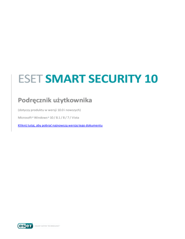 ESET SMART SECURITY 10 Podręcznik użytkownika (dotyczy produktu w wersji 10.0 i nowszych) Microsoft Windows 10 / 8.1 / 8 / 7 / Vista Kliknij tutaj, aby pobrać najnowszą wersję tego dokumentu ESET SMART SECURITY Copyright 2016 by ESET, spol. s r. o. Oprogramowanie ESET Smart Security zostało opracowane przez firmę ESET, spol. s r. o. Więcej informacji można znaleźć w witrynie www.eset.pl. Wszelkie prawa zastrzeżone. Żadna część niniejszej dokumentacji nie może być powielana, przechowywana w systemie pobierania ani przesyłana w żadnej formie bądź przy użyciu jakichkolwiek środków elektronicznych, mechanicznych, przez fotokopiowanie, nagrywanie, skanowanie lub w inny sposób bez uzyskania pisemnego zezwolenia autora. Firma ESET, spol. s r. o. zastrzega sobie prawo do wprowadzania zmian w dowolnych elementach opisanego oprogramowania bez uprzedniego powiadomienia. Pomoc techniczna dla klientów z całego świata: www.eset.com/support WER. 2016-10-24 Spis treści 4.1.3.1 Edytor ..................................................................................44 reguł kontroli dostępu do urządzeń 1. ESET Smart .......................................................6 Security 4.1.3.2 Dodawanie ..................................................................................45 reguł kontroli dostępu do urządzeń 1.1 Nowe ....................................................................................................7 funkcje w wersji 10 4.1.3.3 Edytor ..................................................................................46 reguł ochrony kamery internetowej 4.1.4 System zapobiegania włamaniom działający na hoście (HIPS) ..............................................................................47 1.3 Wymagania ....................................................................................................8 systemowe 4.1.4.1 Ustawienia ..................................................................................49 zaawansowane 1.4 Zapobieganie ....................................................................................................9 4.1.4.2 Okno ..................................................................................50 interaktywne systemu HIPS 4.1.4.3 Wykryto potencjalne zachowanie oprogramowania wymuszającego ..................................................................................50 okup 4.1.5 Tryb gier ..............................................................................51 1.2 Który ....................................................................................................7 produkt posiadam? 2. Instalacja .......................................................10 2.1 Live ....................................................................................................10 Installer 4.2 Ochrona ....................................................................................................52 internetowa 2.2 Instalacja ....................................................................................................11 offline 2.2.1 Ustawienia ..............................................................................12 zaawansowane 2.3 Typowe ....................................................................................................12 problemy z instalacją 2.4 Aktywacja ....................................................................................................12 produktu 2.5 Wprowadzanie ....................................................................................................13 klucza licencyjnego 2.6 Uaktualnianie ....................................................................................................13 do nowszej wersji 4.2.1 Ochrona ..............................................................................53 dostępu do stron internetowych 4.2.1.1 Podstawowe ..................................................................................54 4.2.1.2 Protokoły ..................................................................................54 sieciowe 4.2.1.3 Zarządzanie ..................................................................................54 adresami URL 4.2.2 Ochrona ..............................................................................55 programów poczty e-mail 4.2.2.1 Programy ..................................................................................55 poczty e-mail 2.7 Pierwsze ....................................................................................................14 skanowanie po instalacji 4.2.2.2 Protokoły ..................................................................................56 poczty e-mail 3. Przewodnik .......................................................15 dla początkujących 4.2.2.3 Alerty ..................................................................................57 i powiadomienia 4.2.2.4 Integracja ..................................................................................58 z programami poczty e-mail 3.1 Główne ....................................................................................................15 okno programu ........................................................................58 ochrony programów poczty e-mail 4.2.2.4.1 Konfiguracja 3.2 Aktualizacje ....................................................................................................17 4.2.2.5 Filtr ..................................................................................59 protokołów POP3 i POP3S 3.3 Ustawienia ....................................................................................................18 strefy zaufanej 4.2.2.6 Ochrona ..................................................................................60 przed spamem 3.4 Anti-Theft ....................................................................................................19 4.2.3 Filtrowanie .................................................................