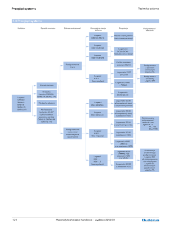 Przegląd systemu Technika solarna 6.4 Przegląd systemu Kolektor Sposób montażu Zakres zastosowań Kompletna stacja solarna Regulacja Logasol KS0105 SM10 Moduł solarny SM10 (zabudowany w stacji) Logasol KS0105 SC20 Logasol KS0105 SC40 Logamatic SC20/SC40 (zabudowany w stacji) EMS z modułem solarnym SM10 Podgrzewanie c.w.u. Logamatic 2107 z FM244 Logasol KS01… (bez regulacji) Logamatic 4000 z FM443 Ponad dachem Logasol CKN2.0 SKN4.0 SKS4.0 SKR6.1R SKR12.1R Podgrzewacz/ zasobnik W dachu (oprócz CKN2.0, SKR6.1R, SKR12.1R) Podgrzewacz z syfonem termicznym Logalux SL Podgrzewacz biwalenty Logalux SM Logamatic SC10/20/40 Na dachu płaskim Na fasadzie budynku 40-60° (tylko kolektor poziomy, oprócz CKN2.0, SKR6.1R, SKR12.1R) Logasol KS0105 SC20 Logamatic SC20 w kompetencji stacji z czujnikiem powrotu Logasol KS0105 SC40 Logamatic SC40 w kompetencji stacji z zestawem HZG Logamatic SC20 z czujnikiem powrotu Podgrzewanie c.w.u. oraz wspomaganie ogrzewania Logasol KS01… (bez regulacji) Kombinowany podgrzewacz/ zasobnik c.wu. Logalux P...S PL.../2S, Duo FWS Logamatic SC40 z zestawem HZG Logamatic 4000 z FM443 oraz zestawem HZG Logasol KS01… KS01...E (bez regulacji) 104 Materiały techniczno-handlowe – wydanie 2013/01 Logamatic 4000 z FM443, FSS zestawem HZG oraz VS-SU Logamatic SC40 z zestawem HZG Kombinacja biwalentnego podgrzewacza Logalux SM lub podgrzewacza z termosyfonem Logalux SL, z buforowym zasobnikiem Logalux PL Technika solarna Kolektory próżniowe Logasol SKR6.1R CPC / SKR12.1R CPC 6.1.4 Kolektory rurowe próżniowe Logasol SKR6.1R CPC / SKR12.1R CPC Typ Ilość rur Nr katalogowy SKR6.1R CPC 6 8 718 530 548 SKR12.1R CPC 12 8 718 530 549 Logasol SKR6.1R CPC/Logasol SKR12.1R CPC Opis Kolektory próżniowe Logasol SKR...R CPC budową przypominają termos. Konstrukcja ma kształt rury o podwójnych ściankach, pomiędzy którymi panuje próżnia. Wewnętrzna rura szklana pokryta jest od środka powłoką selektywną. Dzięki próżni absorber jest bardzo dobrze zaizolowany i może efektywnie odbierać ciepło nawet zimą. Wewnętrzna rura styka się z cylindrem blaszanym odbierającym ciepło i przekazującym je dalej poprzez u-rurkę, w której płynie ciecz solarna. Do zwiększenia wydajności kolektory Logasol SKR...R CPC wyposażono w lustro, które skupia promieniowanie słoneczne z różnych kierunków i skupia je na rurze kolektora. Dzięki temu kolektor pracuje dobrze niezależnie od kierunku padania promieni słonecznych. Dodatkowo selektywny absorber pochłania również promieniowanie rozproszone, które występuje w pochmurne dni. Konstrukcja kolektorów Logasol SKR...R CPC posiada wbudowany dodatkowy przewód hydrauliczny zapewniający jednostronne podłączenie rury „zasilającej” oraz „powrotnej” (Twin Tube), z lewej bądź prawej strony kolektora. Zalety kolektorów słonecznych Logasol SKR...R CPC • Przeznaczone do ogrzewania c.w.u. oraz/lub wspomagania pracy instalacji c.o. • Elastyczność zabudowy dzięki dwóm wielkościom kolektorów. • Wysoka sprawność rur kolektorów poprzez zastosowanie szkła borowo-krzemowego oraz napylonej azotynem aluminiowym powłoki absorbera. • Wydajna praca w każdych warunkach pogodowych dzięki systemowi luster typu CPC (compound parabolic concentrator – zespolony koncentrator paraboliczny). • Możliwość wymiany pojedynczych rur kolektora bez konieczności opróżniania instalacji. • Wbudowany dodatkowy przewód hydrauliczny zapewniający jednostronne podłączenie rury „zasilającej” oraz „powrotnej”, z lewej bądź prawej strony kolektora. • Powierzchnia zewnętrzna (brutto): SKR6.1R CPC – 1,46 m², SKR12.1R CPC – 2,90 m². • Powierzchnia czynna (dopływu światła): SKR6.1R CPC – 1,28 m², SKR12.1R CPC – 2,57 m². • Pojemność absorbera: SKR6.1R CPC – 1,19 dm³, SKR12.1R CPC – 2,36 dm³. • Waga kolektora: SKR6.1R CPC – 24 kg, SKR12.1R CPC – 44 kg. • Wymiary (szer. x wys. x gł.): SKR6.1R CPC – 702 x 2083 x 95 mm, SKR12.1R CPC – 1392 x 2083 x 95 mm. • Przeznaczone do montażu na dachu skośnym, płaskim oraz fasadach. • Szybki i łatwy montaż dzięki modułowej budowie elementów składowych instalacji. • Wyprodukowane Niemczech. Materiały techniczno-handlowe – wydanie 2013/01 79 Kolektory próżniowe Logasol SKR6.1R CPC / SKR12.1R CPC Technika solarna Wymiary montażowe Logasol SKR6.1R CPC / SKR12.1R CPC 1392 2083 95 2083 95 702 S KR6. 1R CPC S KR12. 1R CPC Dane techniczne Logasol SKR6.1R CPC / SKR12.1R CPC jednostka Rurowy kolektor próżniowy Logasol SKR6.1R CPC SKR12.1R CPC 6 12 Ilość rur próżniowych Powierzchnia zewnętrzna (powierzchnia brutto) m² 1,46 2,9 Powierzchnia apertury (powierzchnia wejściowa światła) m² 1,28 2,57 l 1,19 2,36 Stopień absorpcji % > 94 > 94 Stopień emisji % <6 <6 kg 24 44 η 0 % 64,4 64,4 k1 W/(m² ∙ K) 0,749 0,749 k2 W/(m² ∙ K2) 0,005 0,005 Wydajność cieplna c kJ/(m² ∙ K) 9,18 9,18 Znamionowy objętościowy strumień przepływu V l/h 46 92 °C 301 301 bar 10 10 > 525 > 525 Pojemność absorbera Selektywność Masa Stopień sprawności Efektywny współczynnik przewodzenia ciepła Temperatura stagnacji Max ciśnienie robocze Minimalny uzysk cieplny kolektora (dla dopłat BAFA) 1) kWh/(m² ∙ a) RAL-UZ73 (Niebieski Anioł) kryteria są spełnione Numer rejestrowy DIN 011-7S1502 R Potwierdzenie minimalnego uzysku cieplnego w oparciu o normę DIN 4757 przy stałym udziale pokrycia na poziomie 40 %, 200 l zużycia dziennego. 1) 80 Materiały techniczno-handlowe – wydanie 2013/01