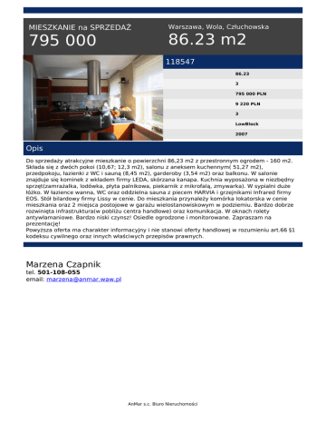MIESZKANIE na SPRZEDAŻ 795 000 Warszawa, Wola, Człuchowska 86.23 m2 118547 86.23 3 795 000 PLN 9 220 PLN 3 LowBlock 2007 Opis Do sprzedaży atrakcyjne mieszkanie o powierzchni 86,23 m2 z przestronnym ogrodem - 160 m2. Składa się z dwóch pokoi (10,67; 12,3 m2), salonu z aneksem kuchennym( 51,27 m2), przedpokoju, łazienki z WC i sauną (8,45 m2), garderoby (3,54 m2) oraz balkonu. W salonie znajduje się kominek z wkładem firmy LEDA, skórzana kanapa. Kuchnia wyposażona w niezbędny sprzęt(zamrażalka, lodówka, płyta palnikowa, piekarnik z mikrofalą, zmywarka). W sypialni duże łóżko. W łazience wanna, WC oraz oddzielna sauna z piecem HARVIA i grzejnikami Infrared firmy EOS. Stół bilardowy firmy Lissy w cenie. Do mieszkania przynależy komórka lokatorska w cenie mieszkania oraz 2 miejsca postojowe w garażu wielostanowiskowym w podziemiu. Bardzo dobrze rozwinięta infrastruktura(w pobliżu centra handlowe) oraz komunikacja. W oknach rolety antywłamaniowe. Bardzo niski czynsz! Osiedle ogrodzone i monitorowane. Zapraszam na prezentację! Powyższa oferta ma charakter informacyjny i nie stanowi oferty handlowej w rozumieniu art.66 §1 kodeksu cywilnego oraz innych właściwych przepisów prawnych. Marzena Czapnik tel. 501-108-055 email: [email protected] AnMar s.c. Biuro Nieruchomości Powered by TCPDF (www.tcpdf.org)
