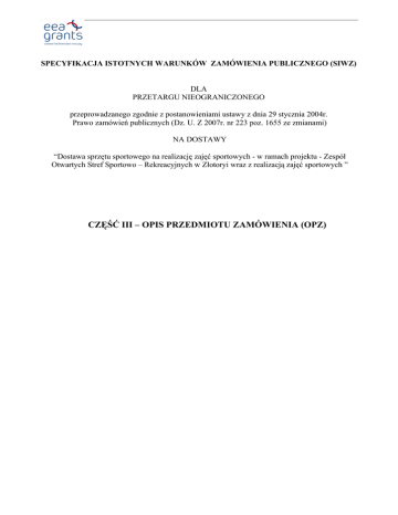SPECYFIKACJA ISTOTNYCH WARUNKÓW ZAMÓWIENIA PUBLICZNEGO (SIWZ) DLA PRZETARGU NIEOGRANICZONEGO przeprowadzanego zgodnie z postanowieniami ustawy z dnia 29 stycznia 2004r. Prawo zamówień publicznych (Dz. U. Z 2007r. nr 223 poz. 1655 ze zmianami) NA DOSTAWY “Dostawa sprzętu sportowego na realizację zajęć sportowych - w ramach projektu - Zespół Otwartych Stref Sportowo – Rekreacyjnych w Złotoryi wraz z realizacją zajęć sportowych ” CZĘŚĆ III – OPIS PRZEDMIOTU ZAMÓWIENIA (OPZ) Rodzaj sprzętu Piłka siatkowa Wysokiej jakości klejona, 18-panelowa piłka siatkowa. Piłka posiada atest FIVB, oficjalny rozmiar. Podwójnie laminowana butylo-gumowa dętka całkowicie uniemożliwia przepuszczanie powietrza. Rozmiar: 5 Obwód: 66 - 68 cm Piłka koszykowa Outdoor Odporna piłka posiada oryginalne wymiary a także wagę piłek oficjalnie używanych w NBA. Materiał: odporna powłoka syntetyczna Rozmiar: 5, 7 Piłka nożna Piłka meczowo- treningowa na wszystkie nawierzchnie, wodoodporna, szyta ręcznie. Wysoka stabilność kształtu. Rozmiar 5 Piłka ręczna Piłka wykonana z materiału syntetycznego na każdy rodzaj nawierzchni, szyta ręcznie. Zawór butylowy, zwrotny. Rozmiar 1, 2 Blok startowy Blok startowy treningowy służy jako oparcie stóp przy starcie do biegów krótkodystansowych. Urządzenie mocowane jest do bieżni za pomocą kołków. Blok długości 80 cm, posiada na długości 58 cm skokową regulację rozstawu płytek oparcia stóp co 2,5 cm. Elementy stalowe bloku zabezpieczone ochronnymi powłokami galwanicznymi. Płytki oparcia stóp pokryte gumową wykładziną antypoślizgową. Słupek startowy do biegów lekkoatletycznych Znacznik toru - wykonany z białego włókna szklanego - o przekroju kwadratowym i trójkątnym -dwa wskaźniki falstartu - specjalne wycięcie ułatwiające przenoszenie Płotek lekkoatletyczny gięty treningowy Płotek stalowy, przeznaczony dla młodzieży szkolnej. Lekka stalowa konstrukcja (waga ok. 4,5 kg), wykonana z rur giętych po kątem 90 stopni i połączonych poprzeczką. W stopach płotka umieszczone są stałe obciążniki. Aluminiowe rury teleskopowe z zatrzaskowym systemem regulacji wysokości i specjalnymi wycięciami do montażu poprzeczki. Estetyczne i trwałe wykończenie poprzez malowanie farbami proszkowymi. Regulacja wysokości: 600, 686, 762, 840, 914mm Posiada świadectwo PZLA Płotek aluminiowy samowstawający Płotek lekkoatletyczny uchylny. Przeznaczony do treningu dzieci i młodzieży w szkołach. Aluminiowe rury teleskopowe są połączone z poprzeczką osłoniętą miękką otuliną zamiast tradycyjnej listwy. Specjalny mechanizm powoduje uchylenie i powrót na miejsce ramy płotka po uderzeniu w poprzeczkę. Masywne stopy z płaskownika stalowego gwarantują stabilność płotka. Rama z rur i kształotowników stalowych cynkowanych galwanicznie. Regulacja wysokości: 600, 686, 762, 840, 914mm Wózek na piłki Wykonany z metalowych prętów, malowany proszkowo w kolorze niebieskim. Wyposażony w klapę.Wymiary: 80 x 60 x48 cm Stanowisko sędziowskie do siatkówki Wykonane z cienkościennych rur stalowych, malowane lakierem proszkowym. Posiada mechaniczną regulację wysokości podestu oraz kółka ułatwiające transport. Zgodne z wymogami FIVB. Certyfikat bezpieczeństwa B. Pałeczki sztafetowe Różnokolorowe - pakowane po 6 szt. w rękawie foliowym. Pałeczki wykonane z cienkościennej rurki aluminiowej, malowane farbami proszkowymi o wysokiej trwałości. Odskocznia gimnastyczna turniejowa Przeznaczona jest do treningu lub wyczynu dla juniorów. Wykonana ze specjalnie profilowanej sklejki liściastej, pokryta wykładziną dywanopodobną na gąbczastym podkładzie. Wyposażona w amortyzator z mikrogumy zwiększający elastyczność. Wysokość czoła odskoczni - 21 cm. Urządzenie posiada certyfikat bezpieczeństwa. Kozioł Korpus kozła wykonany jest z drewna klejonego pokrytego otuliną elastyczną i skórą naturalną. Podstawa urządzenia wykonana z cynkowanych profili stalowych, malowanych proszkowo. Nogi podstawy zaopatrzone są w antypoślizgowe, niebrudzące stopki wykonane z tworzywa. Dwie nogi posiadają kółka ułatwiające przemieszczanie. Kozioł posiada regulację wysokości od 90 do 130 cm, skokowo co 5 cm. Urządzenie posiada certyfikat bezpieczeństwa. Stojak do skoku wzwyż Podstawa stojaka wyposażona w stopki z pokrętłami umożliwiającymi wypoziomowanie poprzeczki. Poziomnicę umieszczono w podpórce poprzeczki. Stojak do skoku wzwyż z regulacją wysokości zawieszenia podpór poprzeczki od 40 do 220 cm. Urządzenie posiada certyfikat bezpieczeństwa. Poprzeczka do skoku wzwyż Treningowa, aluminiowa. Urządzenie posiada certyfikat bezpieczeństwa. Materac gimnastyczny zeskokowy(300*200*50cm) Materac gimnastyczny zeskokowy o wymiarach 300 x 200 x 50 cm, wykonany metodą komorową z mieszanki pianki poliuretanowej obszytej wysokogatunkową folią PVC o podwyższonej odporności na uszkodzenia typu rozerwanie i ścieranie. Spodnia część materaca posiada warstwę antypoślizgową. Materac posiada uchwyty, bardzo pomocne przy przenoszeniu. Certyfikat bezpieczeństwa B. Piłka lekarska 3 kg Piłka rehabilitacyjna 3 kg, szyta, wykonana z materiału syntetycznego skóro-podobnego. Piłka lekarska 5 kg Piłka rehabilitacyjna 5 kg, szyta, wykonana z materiału syntetycznego skóro-podobnego. Kompresor sportowy Wyposażony w 3 końcówki przydatne do pompowania (materace, piłki). Napięcie znamionowe: 220-240 V, natężenie prądu 0,5 A, moc nominalna 95 W. Certyfikat CE. Strój sportowy (materiał: poliester): Stroje numerowane, nacechowane logami wskazanymi przez zamawiającego: - 4 komplety dziewczęta Szkoła Podstawowa; kolor: czerwony i biały; koszulka: rękaw krótki, spodenki: krótkie; rozmiar: na wzrost 138- 146; - 4 komplety chłopcy Szkoła Podstawowa; kolor: niebieski i biały; koszulka: rękaw krótki; spodenki: krótkie; rozmiar: na wzrost 148- 156; - 4 komplety dziew