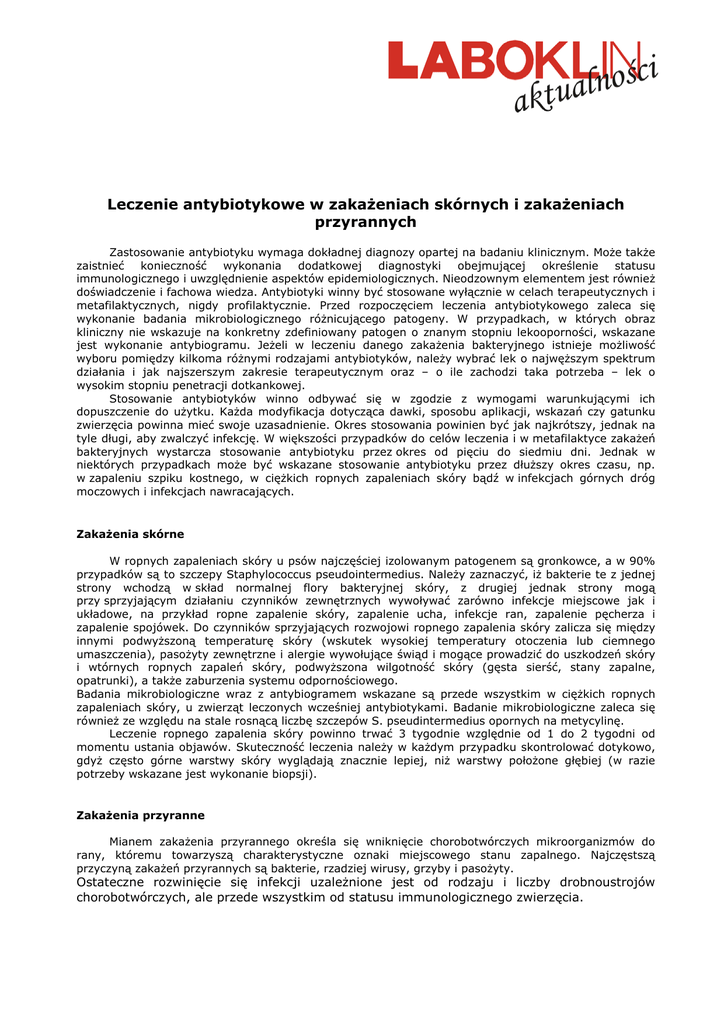 Leczenie antybiotykowe w zakaŜeniach skórnych i zakaŜeniach przyrannych Zastosowanie antybiotyku wymaga dokładnej diagnozy opartej na badaniu klinicznym. MoŜe takŜe zaistnieć konieczność wykonania dodatkowej diagnostyki obejmującej określenie statusu immunologicznego i uwzględnienie aspektów epidemiologicznych. Nieodzownym elementem jest równieŜ doświadczenie i fachowa wiedza. Antybiotyki winny być stosowane wyłącznie w celach terapeutycznych i metafilaktycznych, nigdy profilaktycznie. Przed rozpoczęciem leczenia antybiotykowego zaleca się wykonanie badania mikrobiologicznego róŜnicującego patogeny. W przypadkach, w których obraz kliniczny nie wskazuje na konkretny zdefiniowany patogen o znanym stopniu lekooporności, wskazane jest wykonanie antybiogramu. JeŜeli w leczeniu danego zakaŜenia bakteryjnego istnieje moŜliwość wyboru pomiędzy kilkoma róŜnymi rodzajami antybiotyków, naleŜy wybrać lek o najwęŜszym spektrum działania i jak najszerszym zakresie terapeutycznym oraz – o ile zachodzi taka potrzeba – lek o wysokim stopniu penetracji dotkankowej. Stosowanie antybiotyków winno odbywać się w zgodzie z wymogami warunkującymi ich dopuszczenie do uŜytku. KaŜda modyfikacja dotycząca dawki, sposobu aplikacji, wskazań czy gatunku zwierzęcia powinna mieć swoje uzasadnienie. Okres stosowania powinien być jak najkrótszy, jednak na tyle długi, aby zwalczyć infekcję. W większości przypadków do celów leczenia i w metafilaktyce zakaŜeń bakteryjnych wystarcza stosowanie antybiotyku przez okres od pięciu do siedmiu dni. Jednak w niektórych przypadkach moŜe być wskazane stosowanie antybiotyku przez dłuŜszy okres czasu, np. w zapaleniu szpiku kostnego, w cięŜkich ropnych zapaleniach skóry bądź w infekcjach górnych dróg moczowych i infekcjach nawracających. ZakaŜenia skórne W ropnych zapaleniach skóry u psów najczęściej izolowanym patogenem są gronkowce, a w 90% przypadków są to szczepy Staphylococcus pseudointermedius. NaleŜy zaznaczyć, iŜ bakterie te z jednej strony wchodzą w skład normalnej flory bakteryjnej skóry, z drugiej jednak strony mogą przy sprzyjającym działaniu czynników zewnętrznych wywoływać zarówno infekcje miejscowe jak i układowe, na przykład ropne zapalenie skóry, zapalenie ucha, infekcje ran, zapalenie pęcherza i zapalenie spojówek. Do czynników sprzyjających rozwojowi ropnego zapalenia skóry zalicza się między innymi podwyŜszoną temperaturę skóry (wskutek wysokiej temperatury otoczenia lub ciemnego umaszczenia), pasoŜyty zewnętrzne i alergie wywołujące świąd i mogące prowadzić do uszkodzeń skóry i wtórnych ropnych zapaleń skóry, podwyŜszona wilgotność skóry (gęsta sierść, stany zapalne, opatrunki), a takŜe zaburzenia systemu odpornościowego. Badania mikrobiologiczne wraz z antybiogramem wskazane są przede wszystkim w cięŜkich ropnych zapaleniach skóry, u zwierząt leczonych wcześniej antybiotykami. Badanie mikrobiologiczne zaleca się równieŜ ze względu na stale rosnącą liczbę szczepów S. pseudintermedius opornych na metycylinę. Leczenie ropnego zapalenia skóry powinno trwać 3 tygodnie względnie od 1 do 2 tygodni od momentu ustania objawów. Skuteczność leczenia naleŜy w kaŜdym przypadku skontrolować dotykowo, gdyŜ często górne warstwy skóry wyglądają znacznie lepiej, niŜ warstwy połoŜone głębiej (w razie potrzeby wskazane jest wykonanie biopsji). ZakaŜenia przyranne Mianem zakaŜenia przyrannego określa się wniknięcie chorobotwórczych mikroorganizmów do rany, któremu towarzyszą charakterystyczne oznaki miejscowego stanu zapalnego. Najczęstszą przyczyną zakaŜeń przyrannych są bakterie, rzadziej wirusy, grzyby i pasoŜyty. Ostateczne rozwinięcie się infekcji uzaleŜnione jest od rodzaju i liczby drobnoustrojów chorobotwórczych, ale przede wszystkim od statusu immunologicznego zwierzęcia. Rany dzieli się na 4 kategorie: - rany czyste, - rany czyste/skaŜone, - rany skaŜone, - rany brudne. Lekoopornośc szczepów Staphylococcus pseudointermedius (n=1019) Am oksycylina z kw asem klaw ulonow ym Cefow ecyna Cefaleksyna Enrofloksacyna Marbofloksacyna Kw as fusydynow y wraŜliwe Ibafloksacyna słabo wraŜliwe oporne Difloksacyna Sulfadizyna i trim etoprim Klindam ycyna Klindam ycyna Linkom ycyna Doksycyklina 0% 20% 40% 60% 80% 100% Lekoopornośc szczepów Staphylococcus pseudointermedius opornych na metycylinę (n=374) Enrofloksacyna Marbofloksacyna Kw as fusydynow y Ibafloksacyna wraŜliwe Difloksacyna słabo wraŜliwe oporne Sulfadizyna i trim etoprim Klindam ycyna Linkom ycyna Doksycyklina 0% 20% 40% 60% 80% 100% Czynnikami ryzyka w przypadku zakaŜeń przyrannych są z jednej strony czynniki związane z samym zwierzęciem, np. zaawansowany wiek, ogólnie zły stan zdrowia, schorzenia główne (cukrzyca), zaburzenia wewnątrzwydzielnicze, obniŜona odporność czy chemioterapia. Pewną rolę odgrywają tu równieŜ tzw. operacyjne czynniki ryzyka, np. zgolenie sierści, niedostateczna bądź nieprawidłowa dezynfekcja skóry, czas trwania zabiegu, czas trwania znieczulenia, a takŜe doświadczenie osoby wykonującej zabieg. Na przestrzeni roku 2008 przebadano ogółem 578 wymazów pobranych z ran, przy czym w 70% przypadków stwierdzono obecność chorobotwórczych drobnoustrojów. Drobnoustrojami izolowanymi najczęściej u psów były szczepy S. pseudointermedius, a w dalszej kolejności szczepy E.coli i S.aureus (MRSA). S. pseudointermedius 33,2% S. aureus 3,7% MRSA 4,9% Pseudomonas aeruginosa 1,6% E. coli 12,8% E. coli (szczepy hemolizujące) 2,3% pozostałe Enterobacteriaceae 7,7% paciorkowce beta-hemolizujące 6,7% Enterococcus sp. 5,8% Enterobacter sp. 3,2% Pasteurella sp. 3,9% Klebsiella sp. 2,4% Drobnoustroje środowiskowe 8,8% 0% 5% 10% 15% 20% U kotów izolowano najczęściej szczepy Pasteurella pseudointermedius, S.felis, S. aureus (MRSA). 25% spp., a w 30% dalszej 35% kolejności E.coli, S.