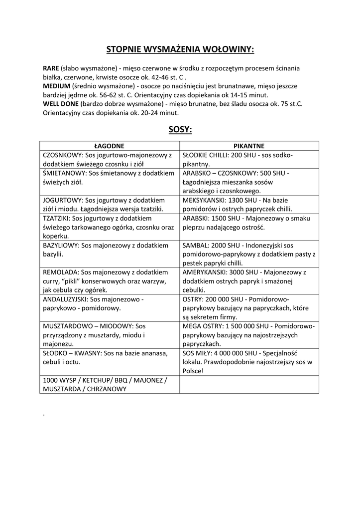 STOPNIE WYSMAŻENIA WOŁOWINY: RARE (słabo wysmażone) - mięso czerwone w środku z rozpoczętym procesem ścinania białka, czerwone, krwiste osocze ok. 42-46 st. C . MEDIUM (średnio wysmażone) - osocze po naciśnięciu jest brunatnawe, mięso jeszcze bardziej jędrne ok. 56-62 st. C. Orientacyjny czas dopiekania ok 14-15 minut. WELL DONE (bardzo dobrze wysmażone) - mięso brunatne, bez śladu osocza ok. 75 st.C. Orientacyjny czas dopiekania ok. 20-24 minut. SOSY: ŁAGODNE CZOSNKOWY: Sos jogurtowo-majonezowy z dodatkiem świeżego czosnku i ziół ŚMIETANOWY: Sos śmietanowy z dodatkiem świeżych ziół. JOGURTOWY: Sos jogurtowy z dodatkiem ziół i miodu. Łagodniejsza wersja tzatziki. TZATZIKI: Sos jogurtowy z dodatkiem świeżego tarkowanego ogórka, czosnku oraz koperku. BAZYLIOWY: Sos majonezowy z dodatkiem bazylii. REMOLADA: Sos majonezowy z dodatkiem curry, “pikli” konserwowych oraz warzyw, jak cebula czy ogórek. ANDALUZYJSKI: Sos majonezowo paprykowo - pomidorowy. MUSZTARDOWO – MIODOWY: Sos przyrządzony z musztardy, miodu i majonezu. SŁODKO – KWASNY: Sos na bazie ananasa, cebuli i octu. 1000 WYSP / KETCHUP/ BBQ / MAJONEZ / MUSZTARDA / CHRZANOWY . PIKANTNE SŁODKIE CHILLI: 200 SHU - sos sodkopikantny. ARABSKO – CZOSNKOWY: 500 SHU Łagodniejsza mieszanka sosów arabskiego i czosnkowego. MEKSYKANSKI: 1300 SHU - Na bazie pomidorów i ostrych papryczek chilli. ARABSKI: 1500 SHU - Majonezowy o smaku pieprzu nadającego ostrość. SAMBAL: 2000 SHU - Indonezyjski sos pomidorowo-paprykowy z dodatkiem pasty z pestek papryki chilli. AMERYKANSKI: 3000 SHU - Majonezowy z dodatkiem ostrych papryk i smażonej cebulki. OSTRY: 200 000 SHU - Pomidorowopaprykowy bazujący na papryczkach, które są sekretem firmy. MEGA OSTRY: 1 500 000 SHU - Pomidorowopaprykowy bazujący na najostrzejszych papryczkach. SOS MIŁY: 4 000 000 SHU - Specjalność lokalu. Prawdopodobnie najostrzejszy sos w Polsce! SKRZYDEŁKA Do każdych skrzydełek słupki marchewkowe lub świeży ogórek oraz jeden sos gratis. Kolejny sos + 1.5 zł. Skrzydełka sprzedawane są w ilości: 6szt - 10zł 10szt - 12zł 15szt - 15zł 20 szt -18zł MIŁE 4.000.000 SHU Widziałem Ducha 1.500.000 SHU Uber doładowanie 500.000 SHU OgnisteBBQ 250.00 SHU Sriracha-cha-cha 150.00 SHU Smokey BBQ 80.000 SHU Tropical Chilli 50.000 SHU Asian Sesame 5.000 SHU Ukojenie 0.000 SHU Buffalo wings 0.000 SHU Specjalność szefa kuchni, prawdopodobnie najostrzejsze skrzydełka w kraju. Klasyczne buffalo wings doprawione porcją papryczek Ghost Chilli. Klasyczne buffalo wings doładowane papryczkami habanero. Lubisz BBQ i ostre jedzenie? Na co czekasz! Słodko pomidorowo-czosnkowe, jeszcze piekące. Wędzone papryczki Chipolete razem z sosem BBQ. Ananas, mango, chilli. Wakacje! Egzotyczne, azjatyckie z sezamem i miodem. Łagodne Parmezanowo-Pieprzowe. Łagodne klasyczne skrzydełka Buffalo. STEKI I ŻEBERKA Do każdego dania dajemy sos do wyboru, frytki lub pieczywo grillowane oraz colesław lub świeże warzywa polane sosem vinegrett. Pochodzenie mięsa oraz sposób przyrządzania czynią nasze steki specjalnymi i są tajemnicą Miłego. T-Bone Steak 300g RIB-eye 300g Chicken Fried Steak 200g Żeberka BBQ 400g Stek, rostbeff i polędwica połączone w literę “T”. Stek przyżądzony z środkowej częsci antrykotu. Specjalność lokalu! Rozbity kawałek udźca, sekretnie panierowany, smażony, podany z frytkami oraz jasnym sosem. Soczyste,miękkie żeberka, glazurowane specjalnym sosem wg. receptury szefa kuchni. Podane z frytkami i colesławem 40 zł 40 zł 25 zł 25 zł BURGERYKLASYCZNE MAŁY 300g 8 zł 9 zł 10 zł Kurczak Wieprzowina Wołowina Wegetariański DUŻY 400g 11 zł 12 zł 13 zł 11 zł MEGA 800g 17 zł 18 zł 19 zł SZEFA 500g 13 zł 14 zł 15 zł BURGERY SPECJALNE Disco Burger 350g Mary Jane 400g BBQ 400g Kapelusznik 400g Łosoś 400g California 400g PULLED PORK BurgR 400g UBERCheeseBurgr 450g TEX-MEX BurgrR 450g LEET BurgR 450g Miły* 400g Kotlet wołowy (150g) z czerwoną cebulą, boczkiem, szynką, serem żółtym, jajkiem gotowanym i sosem pomidorowo-majonezowym. Kotlet wołowy (200g) z serem typu blue cheese z dodatkiem rukoli, prażonych orzechów włoskich, karmelizowana cebulą, pomidorem i sosem majonezowym. Kotlet wołowy (200g) z boczkiem, glazurowany specjalnym sosem, czerwoną cebulą, pomidorem i sosem majonezowym. Kotlet wołowy (200g) z sadzonym jajkiem, boczkiem, sałatą, piklami, i delikatnym sosem pomidorowym. Grillowany łosoś z warzywami i sosem jogurtowym. Kotlet wołowy (200g) z grillowanym serem camembert, czerwoną cebulą, suszonymi pomidorami, świeżymi ogórkami, kiełkami, sosem bazyliowym i pomidorkiem koktajlowym. Wieprzowina (250g) z rozpuszczonym serem, papryczkami jalapeno, sosem BBQ. Wołowy burger (200g) z czterema rodzajami sera. Odważysz się? Wołowy burger (200g) z serem cheddar, guacamole, bekonem, nachos i czarną fasolą. Podane z sosem śmietanowym i świeżymi jalapeno. Wołowy burger (200g) z grillowanymi grzybami, bekonem, specjalnym ostrym sosem oraz rozpuszczonym szwajcarskim serem. *Specjalność szefa kuchni! Uwaga! Aby go zamówić jest wymagana pisemna zgoda. DODATKI DO BURGERÓW: Kotlet – 3 zł Boczek, ananas, jajko, ser pleśniowy, ser cheddar - 1,5 zł 14 zł 18 zł 18 zł 18 zł 18 zł 18 zł 18 zł 18 zł 18 zł 18 zł 18 zł JUNIOR BURGER Junior Kurczak 350g Kurczak Zestaw 550g Junior Wołowy 350g Wołowy zestaw 550g Junior Kurka 350g Kotlet z kurczaka, ser cheddar, pikle, keczup-majonez sos. Zestaw złożony z burgera, frytek i soczku. 6 zł 8 zł Kotlet wołowy, ser cheddar, pikle, keczup-majonez sos. Zestaw złożony z burgera, frytek i soczku. 7 zł 9 zł 2 polędwiczki z kurcząt z frytkami i soczkiem dla dzieci. 8 zł TORTILLE MAŁY 380g 12 zł 13 zł 14 zł 12 zł Kurczak Wieprzowina Wołowina Wegetariański MEGA 900g 19 zł 20 zł 21 zł KANAPKI Lowlanders 450g / 900g Cheesesteak 500g / 1000g Grillowana wędlina(szynka / boczek / indyk) z warzywami. 
