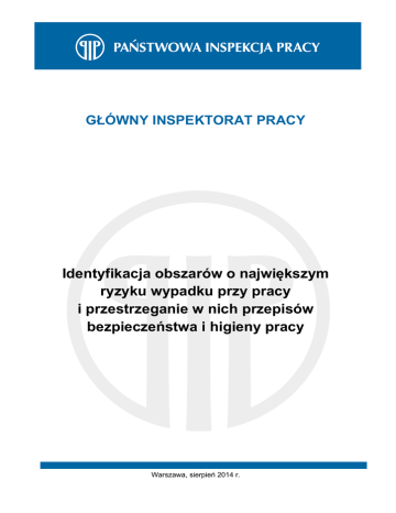 GŁÓWNY INSPEKTORAT PRACY Identyfikacja obszarów o największym ryzyku wypadku przy pracy i przestrzeganie w nich przepisów bezpieczeństwa i higieny pracy Warszawa, sierpień 2014 r. 1 Wprowadzenie Jednym z priorytetowych zadań Państwowej Inspekcji Pracy jest podejmowanie działań polegających na zapobieganiu i ograniczaniu zagrożeń zawodowych w środowisku pracy. Działania te mogą mieć charakter reaktywny – po zaistnieniu wypadku przy pracy organy PIP przystępują do zbadania okoliczności i przyczyn tego zdarzenia wskazując naruszenia przepisów bhp oraz obligując do usunięcia nieprawidłowości, które przyczyniły się do jego powstania. Działania te mogą również być realizowane w ramach podejścia proaktywnego – na bazie dotychczasowych doświadczeń typowane są do kontroli zakłady z branż o wysokim prawdopodobieństwie zaistnienia wypadku przy pracy. Dobór zakładów jest kluczowym elementem skutecznej profilaktyki wypadkowej z poziomu organu kontrolno-nadzorczego. Informacji niezbędnych do właściwego planowania działań dostarczają przede wszystkim własne bazy danych Państwowej Inspekcji Pracy. Wśród nich jedną z najistotniejszych jest baza zawierająca dane z czynności kontrolnonadzorczych ukierunkowanych na zbadanie okoliczności i przyczyn zgłoszonych do PIP wypadków przy pracy. Informacje o wypadkach okręgowe inspektoraty pracy uzyskują przede wszystkim od pracodawców, na mocy art. 234 § 2 Kodeksu pracy, a także od samych poszkodowanych, Policji, pogotowia ratunkowego i innych. Procedura postępowania inspektorów pracy stanowi analizę łańcucha przyczynowoskutkowego dotyczącego danego wypadku. Dzięki temu możliwe jest wskazanie konkretnych nieprawidłowości, które doprowadziły do wypadku oraz koniecznych do podjęcia przez pracodawcę działań zmierzających do poprawy stanu warunków pracy pozostałym pracownikom lub poszkodowanym po ich powrocie do pracy. Dane pochodzące z badania okoliczności i przyczyn wypadków przez inspektorów pracy gromadzone są przede wszystkim w celu wskazania kluczowych informacji niezbędnych do planowania programów kontrolno-prewencyjnych. Biorąc pod uwagę cel nadrzędny uczestników systemu ochrony pracy w Polsce – dbałość o bezpieczeństwo człowieka w procesie pracy, PIP prowadzi działania ukierunkowane na eliminowanie zagrożeń w miejscu pracy lub ograniczanie ich oddziaływania na pracujących. 2 Analiza a danych pochodzą ących z czzynności kontrolno k -nadzorczzych w zak kresie badaniia okoliczn ności i prz zyczyn wy ypadków przy p pracy y B Badanie przez organ ny PIP oko oliczności i przyczyn wypadków w przy prac cy jest jednym m z podstawowych postępowań ń dostarcz zających wiarygodny w ych informa acji na temat sstanu warunków pra acy w pod dmiotach oraz o branż żach. W laatach 2011 1-2013 inspekttorzy pracyy przeprow wadzili pon nad 6 tys. postępowa p ań związannych z bad daniem okoliczności i przzyczyn wyp padków przzy pracy. Dane D z kon ntroli PIP bbyły podsta awą do planow wania i rea alizowania działań kkontrolo-na adzorczych h w branżżach o wy ysokim ryzyku zaistnienia wypadk ku przy pra racy. Dane e te wskaz zują na s padek w liczbie wypadkków przy pracy p zgłos szonych do o PIP i ba adanych prrzez inspekktorów pra acy, co wynika z ogólnej tendencji zmniejsza ania się lic czby wypad dków przy pracy w Polsce P odnotow wywanej przez p GUS. Zb badane prze ez PIP wypaadki zaistniałe w latach h 2011‐20113 25000 20000 225 22 2 201 15000 10000 zbiorowe wypadki z 1 poszkodowanyym 2028 17558 1687 20122r. 2013r. 50 00 0 2 2011r. Wykres 1. Liczba wypadków przy pracy zaistniałych h w latach 2011-2013 zbadanych h przez orów pracy (źźródło: dane PIP). inspekto P Powyższa tendencja a zniżkow wa dotyczy y również ż wypadkóów śmierte elnych i ciężkicch zbadan nych przez inspektoró ów pracy. 3 P Poszkodowani w zbadaanych przezz PIP wypad dkach zaistnniałych w w latach 201 11‐2013 1000 0 885 7770 800 0 735 600 0 400 0 397 369 ze skutkiem m śmiertelnym m 315 z ciężkimi mi obrażeniam ciała 200 0 0 20 011r. 2013r. 2012r. Wykres 2. Liczba poszkodowa p nych w wy padkach prz zy pracy śm miertelnie i ciężko zaistniałych z przez p inspekttorów pracy (źródło: dane e PIP). w latach 2011-2013 zbadanych D Dane z kontroli k ins spektorów pracy wskazują, że ż w ciąggu ostatnich lat zauważżalna staje się zm miana stru ktury stattusu zatru udnienia pposzkodow wanych w wypa adkach prrzy pracy. Inspekto orzy pracy y reagują na sytuaacje, w których k wypadkkom ulegajją osoby świadczące ś e pracę na a innej podstawie niż stosunek pracy. W wyypadkach zaistniały ych w 2 013 roku u stanowili oni 1 3,4% z ogółu poszko odowanych h w wypadk kach zbada anych prze ez PIP. Poszkod dowani w zb badanych p przez PIP wy ypadkach ‐ wg podstawy świad dczenia praccy w latach 2011‐20133 100,0% 87,1% 86,7% % 86,6% 12,9% 13,3% % 13,4% 80,0% 60,0% 40,0% 20,0% 0,0% 2011 1 2012 2013 2 Po oszkodowani śświadczący prracę na podstaawie umowy o o pracę Po oszkodowani śświadczący prracę na innej podstawie niżż umowa o pra racę Wykres 3 3. Poszkodo owani ze wzg ględu na pod stawę świad dczenia pracy y w latach 20011-2013 (źrródło: dane PIP P) 4 W Wyniki kon ntroli wska azują, że n najczęściej wypadkom m ulegają osoby o krótkim k stażu p pracy w danym za akładzie. W latach 2011-2013 2 3 odsetek pracujący ych do 1 roku w zakładziie osiągał wartość w po onad 40%. Wśród przyczyn 864 wypa adków, któ órym uleglli poszkodowani o sstażu do 1 roku w danyym zakładzzie pracy znajdują się ę: brak lub niewłaściw n we urządze enia zabe ezpieczając ce pracująących prze ed np. d dostępem do strefy niebezpiec n cznej oraz brak lub niewłaściwe n e środki oc chrony zzbiorowej; brak nadzo oru nad pra acującymi;; niedostarcczenie instrrukcji posłu ugiwania się s czynnikiem materiialnym; nieprzeszkkole