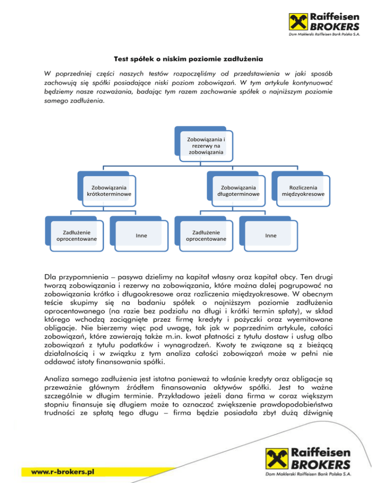 Test spółek o niskim poziomie zadłużenia W poprzedniej części naszych testów rozpoczęliśmy od przedstawienia w jaki sposób zachowują się spółki posiadające niski poziom zobowiązań. W tym artykule kontynuować będziemy nasze rozważania, badając tym razem zachowanie spółek o najniższym poziomie samego zadłużenia. Zobowiązania i rezerwy na zobowiązania Zobowiązania krótkoterminowe Zadłużenie oprocentowane Zobowiązania długoterminowe Inne Zadłużenie oprocentowane Rozliczenia międzyokresowe Inne Dla przypomnienia – pasywa dzielimy na kapitał własny oraz kapitał obcy. Ten drugi tworzą zobowiązania i rezerwy na zobowiązania, które można dalej pogrupować na zobowiązania krótko i długookresowe oraz rozliczenia międzyokresowe. W obecnym teście skupimy się na badaniu spółek o najniższym poziomie zadłużenia oprocentowanego (na razie bez podziału na długi i krótki termin spłaty), w skład którego wchodzą zaciągnięte przez firmę kredyty i pożyczki oraz wyemitowane obligacje. Nie bierzemy więc pod uwagę, tak jak w poprzednim artykule, całości zobowiązań, które zawierają także m.in. kwot płatności z tytułu dostaw i usług albo zobowiązań z tytułu podatków i wynagrodzeń. Kwoty te związane są z bieżącą działalnością i w związku z tym analiza całości zobowiązań może w pełni nie oddawać istoty finansowania spółki. Analiza samego zadłużenia jest istotna ponieważ to właśnie kredyty oraz obligacje są przeważnie głównym źródłem finansowania aktywów spółki. Jest to ważne szczególnie w długim terminie. Przykładowo jeżeli dana firma w coraz większym stopniu finansuje się długiem może to oznaczać zwiększenie prawdopodobieństwa trudności ze spłatą tego długu – firma będzie posiadała zbyt dużą dźwignię finansową, co może oznaczać problemy z płynnością finansową w przypadku czasowego obniżenia się przychodów spółki. Aby uniknąć więc takiej sytuacji poszukamy spółek posiadających najniższy poziom zadłużenia na polskiej giełdzie i przetestujemy jak w ciągu 10 ostatnich lat zachowywały się portfele z takich walorów złożone. Każdy z badanych portfeli będzie posiadać 10 spółek o równych udziałach. Zmiana składu portfela następuje co roku. Dla ułatwienia pominięto podatek od zysków kapitałowych i prowizję biura maklerskiego. Użyte w teście dane pochodzą z serwisu Bloomberg. W związku z charakterystyką testu pominęliśmy w nim banki oraz inne instytucje finansowe, których model działania zakłada finansowanie ze źródeł zewnętrznych a ich stabilność oraz płynność finansową mierzy się nieco inaczej niż w przypadku reszty spółek. Omówienie kryteriów inwestycyjnych Udział zadłużenia w strukturze finansowania mierzy się dwoma popularnymi wskaźnikami: Dług/kapitał własny Wykres 1. Stopy zwrotu spółek poszeregowanych na decyle od najmniejszej do największej wartości wskaźnika dług/kapitał własny, na warszawskiej giełdzie w ciągu ostatnich 10 lat. Źródło: Bloomberg. Najpopularniejszym i najczęściej używanym wskaźnikiem jest stosunek długu do kapitałów własnych (ang. debt to equity ratio). Mierzy on w prosty sposób dźwignię finansową czyli proporcję w jakiej spółka finansuje się ze źródeł wewnętrznych. Wynik powyższego testu pokazuje, że najlepsze stopy zwrotu generują spółki posiadające średni (względem innych spółek) wskaźnik dług/kapitał własny. Sytuacja taka może być związana z poszukiwaniem optymalnego poziomu dźwigni finansowej spółki. Jej zbyt niski poziom nie pozwala skorzystać w pełni z możliwości szybszego rozwoju spółki przy użyciu finansowania zewnętrznego. Także nie w pełni wykorzystywana jest tarcza podatkowa. Z drugiej strony zbyt duża dźwignia finansowa powoduje zwiększenie prawdopodobieństwa utraty płynności finansowej i może generować koszty obsługi długu większe od potencjalnych korzyści z zaciąganego długu (ang. financial distress). Dług/aktywa Wykres 2. Stopy zwrotu spółek poszeregowanych na decyle od najmniejszej do największej wartości wskaźnika dług/aktywa, na warszawskiej giełdzie w ciągu ostatnich 10 lat. Źródło: Bloomberg. Drugim wskaźnikiem mierzący udział długu w strukturze finansowania jest stosunek długu do całości aktyw spółki. Jego konstrukcja oraz interpretacja jest podobna do poprzedniego wskaźnika, jedyną różnicą jest porównanie zadłużenia do aktywów spółki a nie do kapitału własnego. Warto zwrócić uwagę, że jeżeli wskaźnik ten osiąga wartości powyżej jeden to oznacza to, iż dana spółka posiada dług o wyższej wartości niż jej całe aktywa, co może powodować problemy ze spłatą tego długu. Powyższa statystyka pokazuje, że znowu spółki o najwyższych stopach zwrotu posiadają poziom swojego zadłużenia bliski średniej/pewnemu optimum. Co ciekawe najwyższy zwrot posiadały jednak najbardziej zadłużone spółki. Z jednej strony może mieć to związek z agresywnym finansowaniem i rozwojem spółki za pomocą długu, z drugiej strony takie wzrosty mogą mieć także charakter spekulacyjny (spółki o wysokim zadłużeniu stojące na skraju bankructwa). Wyniki testu W celu uwidocznienia działania poszczególnych parametrów, stworzyliśmy kilka portfeli: D/E.Nd: W skład tego portfela wchodzą spółki o najniższym poziomie wskaźnika dług/kapitał własny posortowane od najmniejszej wartości długu netto. D/E.Ndps: W skład tego portfela wchodzą spółki o najniższym poziomie wskaźnika dług/kapitał własny posortowane od najmniejszej wartości długu netto na akcję. D/E.G: W skład tego portfela wchodzą spółki o najniższym poziomie wskaźnika dług/kapitał własny posortowane od najmniejszej wartości kryterium Grahama czyli iloczynu wskaźników C/WK i C/Z. D/A.Nd: W skład tego portfela wchodzą spółki o najniższym poziomie wskaźnika