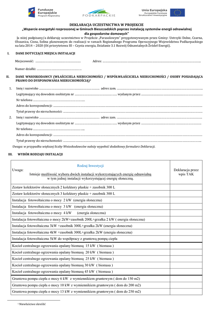 DEKLARACJA UCZESTNICTWA W PROJEKCIE „Wsparcie energetyki rozproszonej w Gminach Bieszczadzkich poprzez instalację systemów energii odnawialnej dla gospodarstw domowych” Ja niżej podpisany/a deklaruję uczestnictwo w Projekcie „Parasolowym” przygotowywanym przez Gminy: Ustrzyki Dolne, Czarna, Olszanica, Cisna, Solina planowanym do realizacji w ramach Regionalnego Programu Operacyjnego Województwa Podkarpackiego na lata 2014 – 2020 (Oś priorytetowa III – Czysta energia, Działanie 3.1 Rozwój Odnawialnych Źródeł Energii). I. DANE DOTYCZĄCE MIEJSCA INSTALACJI Miejscowość: …………………………………………….… Adres: ……………………………………………………………………………………………………….. Numer działki: ……………………………………………… II. DANE WNIOSKODAWCY (WŁAŚCICIELA NIERUCHOMOŚCI / WSPÓŁWŁAŚCICIELA NIERUCHOMOŚCI / OSOBY POSIADAJĄCA PRAWO DO DYSPONOWANIA NIERUCHOMOŚCIĄ)1 1. Imię i nazwisko ………………………………………………………………. adres zam. ………………………………………………………………………………………….. Legitymujący się dowodem osobistym nr …………………………………………… wydanym przez ………………………………………………………………… Nr telefonu ……………………………………………………... Adres do korespondencji: ………………………………………………………………………………………………………………………………………………………………… Tytuł prawny do nieruchomości: …………………………………………………………………………………………………………………………………………………… 2. Imię i nazwisko ………………………………………………………………. adres zam. …………………………………………………………………………………………. Legitymujący się dowodem osobistym nr …………………………………………… wydanym przez ………………………………………………………………. Nr telefonu ……………………………………………………... Adres do korespondencji: ……………………………………………………………………………………………………………………………………………………………… Tytuł prawny do nieruchomości: ………………………………………………………………………………………………………………………………………………….. Uwaga: w przypadku większej liczby Wnioskodawców należy wypełnić dodatkowy formularz Deklaracji. III. WYBÓR RODZAJU INSTALACJI Rodzaj Inwestycji Uwaga: Istnieje możliwość wyboru dwóch instalacji wykorzystujących energię odnawialną w tym jednej instalacji wykorzystującej energię słoneczną. Zestaw kolektorów słonecznych 2 kolektory płaskie + zasobnik 300 L Zestaw kolektorów słonecznych 3 kolektory płaskie + zasobnik 300 L Instalacja fotowoltaiczna o mocy 2 kW (energia słoneczna) Instalacja fotowoltaiczna o mocy 3 kW (energia słoneczna) Instalacja fotowoltaiczna o mocy 4 kW (energia słoneczna) Instalacja fotowoltaiczna o mocy 2kW+zasobnik 200L+grzałka 2 kW ( energia słoneczna) Instalacja fotowoltaiczna 3kW +zasobnik 300L+grzałka 2kW (energia słoneczna) Instalacja fotowoltaiczna 4kW +zasobnik 300L+grzałka 2kW (energia słoneczna) Instalacja fotowoltaiczna 5kW do współpracy z gruntową pompą ciepła Kocioł centralnego ogrzewania opalany biomasą 15 kW ( biomasa ) Kocioł centralnego ogrzewania opalany biomasą 20 kW ( biomasa ) Kocioł centralnego ogrzewania opalany biomasą 25 kW ( biomasa ) Kocioł centralnego ogrzewania opalany biomasą 30 kW ( biomasa ) Kocioł centralnego ogrzewania opalany biomasą 45 kW ( biomasa ) Gruntowa pompa ciepła o mocy 6 kW z wymiennikiem gruntowym ( dom do 150 m2) Gruntowa pompa ciepła o mocy 10 kW z wymiennikiem gruntowym ( dom do 200 m2) Gruntowa pompa ciepła o mocy 13 kW z wymiennikiem gruntowym ( dom do 250 m2) 1 Niewłaściwe skreślić Deklaracja przez wpis TAK IV. Kryteria formalne wyboru projektu: Lp. 1. 2. 3. 4. 5. 6. Wyszczególnienie Posiadam uregulowany stan prawny nieruchomości, na której wykonana ma być Instalacja – posiadane prawo do dysponowania nieruchomością co najmniej do dnia 31 grudnia 2024 roku. W przypadku umów zawartych na czas nieokreślony, umowa powinna zawierać klauzulę, że nie może zostać rozwiązana do dnia 31 grudnia 2024 r. Na potwierdzenie spełniania kryterium przedkładam do Deklaracji jeden z poniższych dokumentów (kserokopię, a oryginał do wglądu): a) Odpis z księgi wieczystej b) Decyzje administracyjne c) Akt notarialny, d) Orzeczenia sądu, e) Umowa najmu/dzierżawy/użyczenia, Przedkładam weryfikacja techniczna nie starszą niż 12 miesięcy. TAK / NIE Akceptuję wzór umowy przystąpienia do Projektu. Oświadczam, ze zasiedlę budynek do 31.03.2018r. (jeśli dotyczy) Oświadczam, że zobowiązuję się ubezpieczać nieruchomość na której będzie zainstalowana instalacja OZE co najmniej przez okres 5 lat trwałości projektu Oświadczam, że nie mam/y jakichkolwiek nieuregulowanych a wymagalnych zobowiązań Mieszkańca wobec Gminy na dzień złożenia Deklaracji. Dotychczasowy sposób ogrzewania budynku (dla instalacji kotła na biomasę) Węglowe – Tak / Nie * Dotychczasowy sposób ogrzewania ciepłej wody użytkowej – c.w.u. (dla kolektorów słonecznych, fotowoltaiki i gruntowych pomp ciepła) Węglowe – Tak / Nie * Kryteria społeczno–ekonomiczne: V. OŚWIADCZENIE DOTYCZĄCE SPEŁNIANIA KRYTERIÓW SPOŁECZNO-EKONOMICZNYCH Oświadczam, że na dzień składania Deklaracji spełniam następujące kryteria społeczno-ekonomiczne: TAK /NIE Członkowie