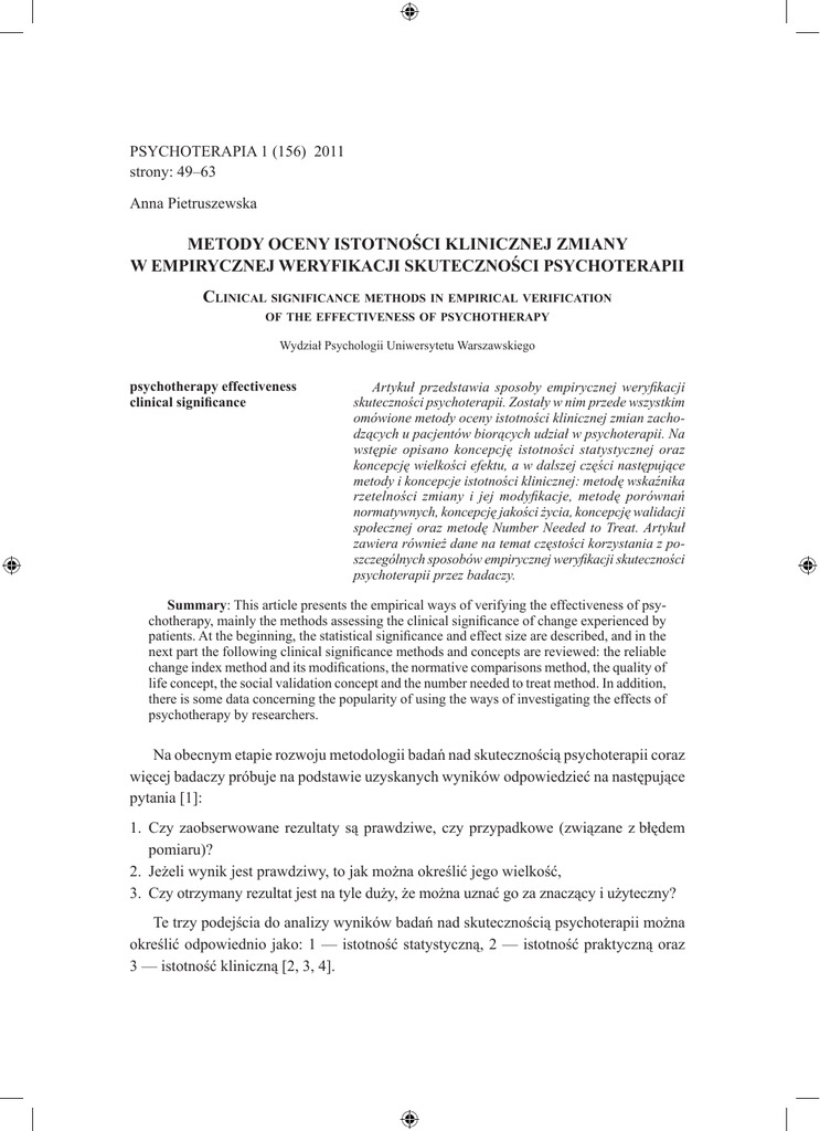Psychoterapia 1 (156) 2011 strony: 49–63 Anna Pietruszewska Metody oceny istotności klinicznej zmiany w empirycznej weryfikacji skuteczności psychoterapii Clinical significance methods in empirical verification of the effectiveness of psychotherapy Wydział Psychologii Uniwersytetu Warszawskiego psychotherapy effectiveness clinical significance Artykuł przedstawia sposoby empirycznej weryfikacji skuteczności psychoterapii. Zostały w nim przede wszystkim omówione metody oceny istotności klinicznej zmian zachodzących u pacjentów biorących udział w psychoterapii. Na wstępie opisano koncepcję istotności statystycznej oraz koncepcję wielkości efektu, a w dalszej części następujące metody i koncepcje istotności klinicznej: metodę wskaźnika rzetelności zmiany i jej modyfikacje, metodę porównań normatywnych, koncepcję jakości życia, koncepcję walidacji społecznej oraz metodę Number Needed to Treat. Artykuł zawiera również dane na temat częstości korzystania z poszczególnych sposobów empirycznej weryfikacji skuteczności psychoterapii przez badaczy. Summary: This article presents the empirical ways of verifying the effectiveness of psychotherapy, mainly the methods assessing the clinical significance of change experienced by patients. At the beginning, the statistical significance and effect size are described, and in the next part the following clinical significance methods and concepts are reviewed: the reliable change index method and its modifications, the normative comparisons method, the quality of life concept, the social validation concept and the number needed to treat method. In addition, there is some data concerning the popularity of using the ways of investigating the effects of psychotherapy by researchers. Na obecnym etapie rozwoju metodologii badań nad skutecznością psychoterapii coraz więcej badaczy próbuje na podstawie uzyskanych wyników odpowiedzieć na następujące pytania [1]: 1. Czy zaobserwowane rezultaty są prawdziwe, czy przypadkowe (związane z błędem pomiaru)? 2. Jeżeli wynik jest prawdziwy, to jak można określić jego wielkość, 3. Czy otrzymany rezultat jest na tyle duży, że można uznać go za znaczący i użyteczny? Te trzy podejścia do analizy wyników badań nad skutecznością psychoterapii można określić odpowiednio jako: 1 — istotność statystyczną, 2 — istotność praktyczną oraz 3 — istotność kliniczną [2, 3, 4]. 50 Anna Pietruszewska Niniejszy artykuł ma na celu krótkie przybliżenie ewolucji podejścia do empirycznej weryfikacji skuteczności psychoterapii oraz przedstawienie powstałych do tej pory metod badania istotności klinicznej zmiany zachodzącej u uczestników psychoterapii. 1. Od istotności klinicznej do… istotności klinicznej Pierwsza strategia badań nad psychoterapią miała charakter idiograficzny. Na początku XX wieku psychoanalitycy wykorzystywali studium przypadku, rozwijane następnie przez psychoterapeutów humanistycznych i fenomenologicznych [5]. Najwcześniejsze badania nad skutecznością psychoterapii opierały się głównie na opinii terapeuty o stopniu poprawy stanu pacjenta [6]. Przegląd danych zebranych w Berlińskim Instytucie Psychoanalizy w latach 20. XX wieku wskazuje na to, że psychoanalitycy po zakończeniu leczenia klasyfikowali swoich pacjentów jako wyleczonych i niewyleczonych, a także takich, których stan poprawił się w mniejszym lub większym stopniu, biorąc pod uwagę takie kryteria, jak ustąpienie objawów oraz pozytywne zmiany w osobowości. Stąd wniosek, że w trakcie początków uprawiania psychoterapii terapeuci skupiali się na klinicznym wymiarze zmiany, na poprawie, którą można było rzeczywiście zaobserwować u pacjenta. Jednak wraz z rozwojem innych szkół psychoterapii pojawił się zarzut, że subiektywne zdanie psychoterapeuty nie może być miarą skuteczności jego własnych interwencji i badacze zaczęli się skupiać na naukowych metodach weryfikacji działania psychoterapii. 1. 1. Istotność statystyczna Obliczanie istotności statystycznej jest standardową procedurą podejmowaną w większości badań i od kilkudziesięciu lat stanowi ważną część metodologii badań psychologicznych. W badaniach nad skutecznością psychoterapii standardowym wymaganiem jest wykorzystanie grupy kontrolnej oraz rzetelnych i trafnych narzędzi do pomiaru badanych zmiennych z perspektywy pacjenta, znaczącej osoby z jego otoczenia lub terapeuty [5, 7]. Otrzymane w badaniach wyniki są poddawane odpowiednim analizom statystycznym [8]. Jeśli prawdopodobieństwo wystąpienia różnicy między wynikami grup jest większe niż zakładany próg błędu, przyjmuje się, że otrzymane wyniki nie są rezultatem przypadkowej zmienności dobranych prób i można je uznać za istotne statystycznie. Można zatem powiedzieć, iż analizy statystyczne i istotność statystyczna mają duże znaczenie dla oceny efektów psychoterapii, ponieważ dostarczają informacji, czy zmiany, które zaszły, są przypadkowe czy nie. Pojawiły się jednak zarzuty podające w wątpliwość użyteczność koncepcji istotności statystycznej w ocenie skuteczności leczenia pacjentów. Po pierwsze, szansę otrzymania wyników istotnych statystycznie można uczynić bardziej prawdopodobną przez zwiększenie liczebności próby, więc badając odpowiednio dużą grupę można uzyskać potwierdzenie istotnych statystycznie zależności między niemalże dowolnymi zmiennymi [8]. Po drugie, metody wnioskowania statystycznego nie określają praktycznego znaczenia efektów psychoterapii ani wielkości zaistniałej zmiany, lecz jedynie wskazują, kiedy należy odrzucić hipotezę zerową mówiącą o braku zmiany [9]. Istotna statystycznie zmiana niekoniecznie świadczy o rzeczywistych, odczuwanych przez pacjenta i jego otoczenie rezultatach psychoterapii. Po trzecie, porównania statystyczne między grupami nie pokazują lub ujawniają w bardzo małym sto
