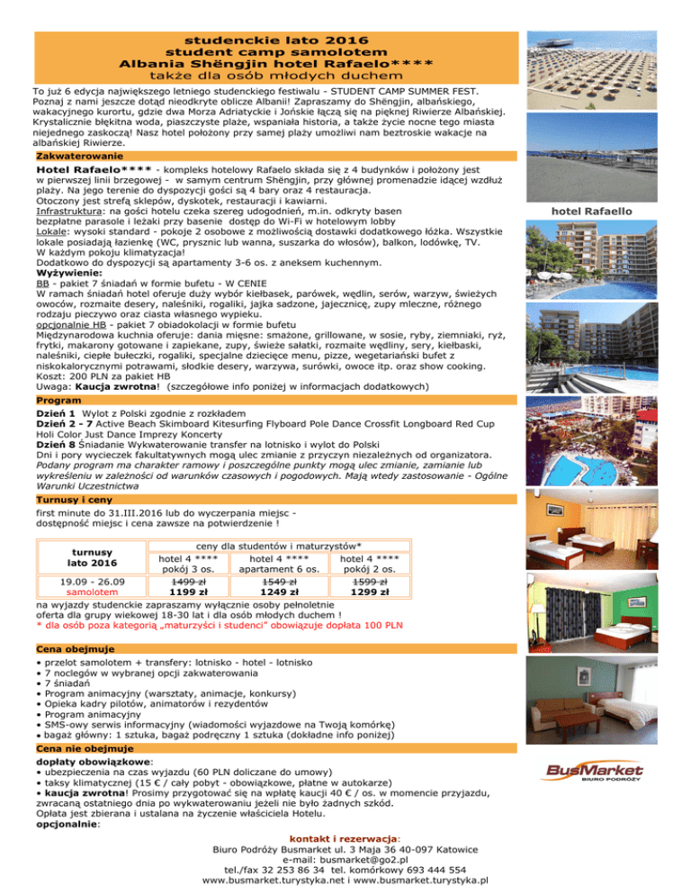 studenckie lato 2016 student camp samolotem Albania Shëngjin hotel Rafaelo**** także dla osób młodych duchem To już 6 edycja największego letniego studenckiego festiwalu - STUDENT CAMP SUMMER FEST. Poznaj z nami jeszcze dotąd nieodkryte oblicze Albanii! Zapraszamy do Shëngjin, albańskiego, wakacyjnego kurortu, gdzie dwa Morza Adriatyckie i Jońskie łączą się na pięknej Riwierze Albańskiej. Krystalicznie błękitna woda, piaszczyste plaże, wspaniała historia, a także życie nocne tego miasta niejednego zaskoczą! Nasz hotel położony przy samej plaży umożliwi nam beztroskie wakacje na albańskiej Riwierze. Zakwaterowanie Hotel Rafaelo**** - kompleks hotelowy Rafaelo składa się z 4 budynków i położony jest w pierwszej linii brzegowej - w samym centrum Shëngjin, przy głównej promenadzie idącej wzdłuż plaży. Na jego terenie do dyspozycji gości są 4 bary oraz 4 restauracja. Otoczony jest strefą sklepów, dyskotek, restauracji i kawiarni. Infrastruktura: na gości hotelu czeka szereg udogodnień, m.in. odkryty basen bezpłatne parasole i leżaki przy basenie dostęp do Wi-Fi w hotelowym lobby Lokale: wysoki standard - pokoje 2 osobowe z możliwością dostawki dodatkowego łóżka. Wszystkie lokale posiadają łazienkę (WC, prysznic lub wanna, suszarka do włosów), balkon, lodówkę, TV. W każdym pokoju klimatyzacja! Dodatkowo do dyspozycji są apartamenty 3-6 os. z aneksem kuchennym. Wyżywienie: BB - pakiet 7 śniadań w formie bufetu - W CENIE W ramach śniadań hotel oferuje duży wybór kiełbasek, parówek, wędlin, serów, warzyw, świeżych owoców, rozmaite desery, naleśniki, rogaliki, jajka sadzone, jajecznicę, zupy mleczne, różnego rodzaju pieczywo oraz ciasta własnego wypieku. opcjonalnie HB - pakiet 7 obiadokolacji w formie bufetu Międzynarodowa kuchnia oferuje: dania mięsne: smażone, grillowane, w sosie, ryby, ziemniaki, ryż, frytki, makarony gotowane i zapiekane, zupy, świeże sałatki, rozmaite wędliny, sery, kiełbaski, naleśniki, ciepłe bułeczki, rogaliki, specjalne dziecięce menu, pizze, wegetariański bufet z niskokalorycznymi potrawami, słodkie desery, warzywa, surówki, owoce itp. oraz show cooking. Koszt: 200 PLN za pakiet HB Uwaga: Kaucja zwrotna! (szczegółowe info poniżej w informacjach dodatkowych) Program Dzień 1 Wylot z Polski zgodnie z rozkładem Dzień 2 - 7 Active Beach Skimboard Kitesurfing Flyboard Pole Dance Crossfit Longboard Red Cup Holi Color Just Dance Imprezy Koncerty Dzień 8 Śniadanie Wykwaterowanie transfer na lotnisko i wylot do Polski Dni i pory wycieczek fakultatywnych mogą ulec zmianie z przyczyn niezależnych od organizatora. Podany program ma charakter ramowy i poszczególne punkty mogą ulec zmianie, zamianie lub wykreśleniu w zależności od warunków czasowych i pogodowych. Mają wtedy zastosowanie - Ogólne Warunki Uczestnictwa Turnusy i ceny first minute do 31.III.2016 lub do wyczerpania miejsc dostępność miejsc i cena zawsze na potwierdzenie ! ceny dla studentów i maturzystów* hotel 4 **** hotel 4 **** hotel 4 **** pokój 3 os. apartament 6 os. pokój 2 os. 19.09 - 26.09 1499 zł 1549 zł 1599 zł samolotem 1199 zł 1249 zł 1299 zł na wyjazdy studenckie zapraszamy wyłącznie osoby pełnoletnie oferta dla grupy wiekowej 18-30 lat i dla osób młodych duchem ! * dla osób poza kategorią „maturzyści i studenci” obowiązuje dopłata 100 PLN turnusy lato 2016 Cena obejmuje • • • • • • • przelot samolotem + transfery: lotnisko - hotel - lotnisko 7 noclegów w wybranej opcji zakwaterowania 7 śniadań Program animacyjny (warsztaty, animacje, konkursy) Opieka kadry pilotów, animatorów i rezydentów Program animacyjny SMS-owy serwis informacyjny (wiadomości wyjazdowe na Twoją komórkę) ● bagaż główny: 1 sztuka, bagaż podręczny 1 sztuka (dokładne info poniżej) Cena nie obejmuje dopłaty obowiązkowe: • ubezpieczenia na czas wyjazdu (60 PLN doliczane do umowy) • taksy klimatycznej (15 € / cały pobyt - obowiązkowe, płatne w autokarze) • kaucja zwrotna! Prosimy przygotować się na wpłatę kaucji 40 € / os. w momencie przyjazdu, zwracaną ostatniego dnia po wykwaterowaniu jeżeli nie było żadnych szkód. Opłata jest zbierana i ustalana na życzenie właściciela Hotelu. opcjonalnie: kontakt i rezerwacja: Biuro Podróży Busmarket ul. 3 Maja 36 40-097 Katowice e-mail: [email protected] tel./fax 32 253 86 34 tel. komórkowy 693 444 554 www.busmarket.turystyka.net i www.busmarket.turystyka.pl hotel Rafaello • PREMIUM PASS*** - Wstęp na wszystkie WARSZTATY, IMPREZY i KONCERTY (69 PLN + t-shirt festiwalowy GRATIS) PREMIUM PASS umożliwia uczestnictwo we wszystkich IMPREZACH, KONCERTACH i WARSZTATACH obowiązuje w terminie 16-25 września promocyjna cena 69 PLN dotyczy osób, które po rezerwacji wybiorą tę opcję, pozostałe osoby mogą zakupić PREMIUM PASS na StudentShop.pl w cenie 129 PLN lub na miejscu w cenie 35 € * Osoby bez karnetu mogą dołączyć do imprez płacąc za wstęp do klubów przy wejściu - jednorazowy wstęp do klubów w Shëngjin to koszt 500 ALL (ok. 16 PLN), w dni koncertowe 1000 ALL (ok. 32 PLN) • opcjonalnie pakiet HB - 7 obiadokolacji + 200 PLN • pakiet FLEXI - możliwość dokonania zmiany w rezerwacji do 7 dni przed wyjazdem. Do 7 dni przed wyjazdem możesz: zmienić dane osoby podróżującej, termin wyjazdu, kierunek wyjazdu koszt: 79 PLN Zapisy: do 7 dni przed wyjazdem ● pakiet BUS - możliwość wyboru miejsca w autokarze koszt: 39 PLN ● pakiet PREMIUM MAX (FLEXI + BUS) - poza promocją first minute koszt: 99 PLN • dodatkowy bagaż - informacje poniżej • Wycieczki fakultatywne Albania Południowa 30 € Albania Północna 30 € Rafting 25 € Informacje transportowe samolotem Dopłata [zł] Katowice Port Lotniczy Pyrzowice - Katowice Port Lotniczy Pyrzowice plus transfer Warszawa 100 Godzina 00 16 1200 Data wsiadania w dniu rozpoczęcia Uwaga! Podane godziny są orientacyjne i mogą ul