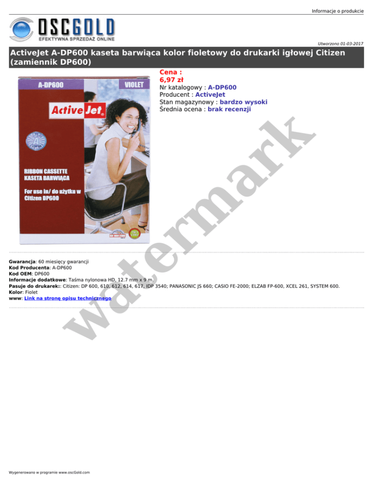 Informacje o produkcie Utworzono 01-03-2017 ActiveJet A-DP600 kaseta barwiąca kolor fioletowy do drukarki igłowej Citizen (zamiennik DP600) Cena : 6,97 zł er m ar k Nr katalogowy : A-DP600 Producent : ActiveJet Stan magazynowy : bardzo wysoki Średnia ocena : brak recenzji w at Gwarancja: 60 miesięcy gwarancji Kod Producenta: A-DP600 Kod OEM: DP600 Informacje dodatkowe: Taśma nylonowa HD, 12.7 mm x 9 m. Pasuje do drukarek:: Citizen: DP 600, 610, 612, 614, 617, IDP 3540; PANASONIC JS 660; CASIO FE-2000; ELZAB FP-600, XCEL 261, SYSTEM 600. Kolor: Fiolet www: Link na stronę opisu technicznego Wygenerowano w programie www.oscGold.com