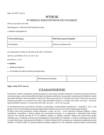 Sygn. akt:XII C 215/14 WYROK W IMIENIU RZECZYPOSPOLITEJ POLSKIEJ Dnia 20 stycznia 2016 roku Sąd Okręgowy w Gliwicach XII Wydział Cywilny w składzie następującym: Przewodniczący: SSO Katarzyna Sznajder Protokolant: Katarzyna Zegartowska po rozpoznaniu w dniu 20 stycznia 2016 roku w Gliwicach sprawy z powództwa M. D. (1), M. D. (2) przeciwko (...) w Z. o zapłatę 1. oddala powództwo; 2. nie obciąża powodów kosztami postępowania. SSO Katarzyna Sznajder Sygn. akty XII C 215/14 UZASADNIENIE Powodowie wnieśli o zasądzenie zadośćuczynienia za naruszenie ich dóbr osobistych w postaci naruszenia zdrowia i miru domowego, a także uniemożliwienia bądź utrudnienia możliwości wypoczynku i regeneracji sił witalnych, a także powstanie obrażeń w sferze psychiki w okresie od 1 lipca 2009 roku do 21 września 2011 roku w kwocie po 92.294,01 zł (pismo powodów z 20 stycznia 2015 roku, zapis protokołu rozprawy z 20 lipca 2015 roku, 00:09:43 – 00:14:29, zapis protokołu rozprawy z 20 stycznia 2016 roku, 00:03:31 – 00:07:15, k.54-55). W uzasadnieniu pozwu powodowie wskazali, że mieszkają w bezpośrednim sąsiedztwie (...) Kopalni (...)w Z., a do jednej ze stron ich mieszkania przylega bezpośrednio budynek maszynowni szybu kopalnianego kopalni. W lipcu 2009 roku powodowie zaczęli codziennie w godz. od 6:15 – 22:00 odczuwać wibracje podłogi w całym mieszkaniu, szczególnie w dużym pokoju oraz monotonne buczenie, co w połączeniu z wibracjami było bardzo męczące. Na wniosek powoda M. D. (1) kopalnia ustaliła, że źródłem wibracji i hałasu jest przetwornica prądu zainstalowana w budynku maszynowni przylegającym bezpośrednio do budynku, w którym mieszkają powodowie, w czasie której pracy średni poziom dźwięku A w dzień wykazał 62 dB, natomiast po wyłączeniu urządzenia poziom dźwięku A wynosił 24dB. Po przeprowadzeniu działań mających na celu obniżenie poziomu hałasu emitowanego podczas pracy przetwornicy prądu średni poziom dźwięku w pokoju dziennym wynosił 31dB. Powodowie oświadczyli, że na skutek odczuwanych drgań i hałasu doznali stałych zaburzeń snu, bólów głowy, mięśni oraz spadku koncentracji uwagi. W powódki lekarz stwierdził nadciśnienie tętnicze, na które nie cierpiała nigdy wcześniej, a które mogły wywoływać hałas i wibracje. W dniu 4 grudnia 2012 roku powód wezwał (...) Kopalnię (...) do zapłaty kwoty 200.000 zł (k.2-46, k.49). Pismem z 19 czerwca 2015 roku powodowie wskazali, że stroną pozwaną jest (...)w Z. jako następca prawny pierwotnej strony pozwanej (k.98-99). Pozwany podnosząc zarzut przedawnienia wniósł o oddalenie powództwa w całości i zasądzenie kosztów. Uzasadniając wniosek wskazał, że termin przedawnienia roszczenia majątkowego wynosi 3 lata, a z oświadczeń powodów zawartych w pozwie wynika, że dowiedzieli się oni o szkodzie i o osobie zobowiązanej do jej naprawienia w październiku 2010 roku, zatem ich roszczenia uległy przedawnieniu w październiku 2013 roku. Wskazał, że powodowie nie wykazali, aby zachowanie pozwanego było zawinione, a nadto że doznali jakiejkolwiek krzywdy wskutek ewentualnego naruszenia dóbr osobistych (k.87-94, zapis protokołu rozprawy z 20 lipca 2015 roku, 00:14:29 – 00:20:00). Sąd ustalił następujący stan faktyczny: Od 1996 roku powodowie zajmują lokal mieszkalny położony w Z., przy ulicy (...) jedną ścianą pokoju dziennego sąsiadującą bezpośrednio z budynkiem maszynowni szybu kopalnianego (...) w Z.. W lipcu 2009 roku powodowie zaczęli odczuwać wibracje, drżenie i zaczął im dokuczać hałas wynikający z pracy przetwornicy prądu znajdującej się za ścianą ich pokoju dziennego. Hałas i drżenie było odczuwalne codziennie w godzinach od 6:00 rano do około 20:00 – 22:00. Powód poszukiwał pomocy u Rzecznika Praw Obywatelskich, Policji, Straży Miejskiej i prosił o interwencje, a jednocześnie zgłaszał swoje uwagi do poprzednika prawnego pozwanej w lipcu 2009 roku. Pomimo podjęcia prób wyciszenia hałasu i usunięcia drgań powodowie nadal odczuwali drgania, wibracje i dokuczał im hałas. PowódM. D. (1)od początku interweniował u poprzednika prawnego pozwanej i domagał się usunięcia hałasu. Ostatecznie pismem z 20 października 2010 roku powód zwrócił się do Dyrektora (...) o ponowną kontrolę lub naprawę urządzeń w budynku maszynowni szybowej wskazując, że wibracje i uciążliwy hałas zakłócają życie rodziny i nie pozwalają normalnie mieszkać. Wibracje, drżenie ścian, podłóg i dobiegające zza ściany buczenie uniemożliwiały naukę synowi powodów, a powódka zaczęła odczuwać bóle głowy (k.18, przesłuchanie powoda M. D. (1), zapis protokołu rozprawy z 20 stycznia 2016 roku, 00:09:29 – 00:24:06, przesłuchanie powódki M. D. (2), zapis protokołu rozprawy z 20 stycznia 2016 roku, 00:24:06 – 00:32:43). Pismem z 1 grudnia 2010 roku powód zwrócił się do Powiatowej Stacji Sanitarno – Epidemiologicznej w G. o interwencję w sprawie wibracji i hałasu (pismo powoda z 1 grudnia 2010 roku, k.19). Pismem z 9 grudnia 2010 roku powód zwrócił się o interwencję do (...) Gospodarki Nieruchomościami w Z. o interwencję w (...)(pismo powoda z 9 grudnia 2010 roku, k.20). 9 grudnia 2010 roku Państwowy Powiatowy Inspektor Sanitarny stwierdził organoleptycznie występowanie intensywnego drgania podłogi oraz słyszalnego monotonnego buczenia najbardziej zintensyfikowanego w dużym pokoju, a następnie w kuchni i pokoju środkowym (protokół kontroli z 9 grudnia 2010 roku, k.21-23). Po przeprowadzeniu badań środowiskowych w mieszkaniu powodów w dniu 28 grudnia 2010 roku Państwowy Powiatowy Inspektor Sanitarny w G. stwierdził, że źródłem hałasu jest pracująca przetwornica prądu zainstalowana w budynku maszynowni szybu kopalnianego (...). Średni, a poziom dźwięku wynosi 62 dB (sprawozdanie nr (...) z badań środowiskowych przeprowadzonych na zlecenie