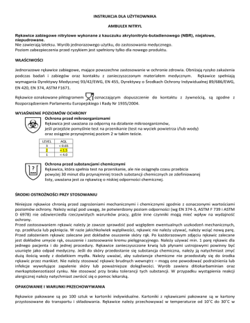 INSTRUKCJA DLA UŻYTKOWNIKA AMBULEX NITRYL Rękawice zabiegowe nitrylowe wykonane z kauczuku akrylonitrylo-butadienowego (NBR), niejałowe, niepudrowane. Nie zawierają lateksu. Wyrób jednorazowego użytku, do zastosowania medycznego. Poziom zabezpieczenia przed ryzykiem jest spełniony tylko dla nowego produktu. WŁAŚCIWOŚCI Jednorazowe rękawice zabiegowe, mające powszechne zastosowanie w ochronie zdrowia. Obniżają ryzyko zakażenia podczas badań i zabiegów oraz kontaktu z zanieczyszczonym materiałem medycznym. Rękawice spełniają wymagania Dyrektywy Medycznej 93/42/EWG, EN 455, Dyrektywy o Środkach Ochrony Indywidualnej 89/686/EWG, EN 420, EN 374, ASTM F1671. Rękawice oznakowane piktogramem oznaczającym dopuszczenie do kontaktu z żywnością, są zgodne z Rozporządzeniem Parlamentu Europejskiego i Rady Nr 1935/2004. WYJAŚNIENIE POZIOMÓW OCHRONY Ochrona przed mikroorganizmami Rękawica jest uważana za odporną na działanie mikroorganizmów, jeśli przejdzie pomyślnie test na przenikanie (test na wyciek powietrza i/lub wody) oraz osiągnie przynajmniej poziom 2 w takim teście. LEVEL 3 2 1 AQL < 0.65 < 1.5 < 4.0 Ochrona przed substancjami chemicznymi Rękawica, która spełnia test na przenikanie, ale nie osiągnęła czasu przebicia powyżej 30 minut dla przynajmniej trzech substancji chemicznych ze zdefiniowanej listy, uważana jest za rękawicę o niskiej odporności chemicznej. ŚRODKI OSTROŻNOŚCI PRZY STOSOWANIU Niniejsze rękawice chronią przed zagrożeniami mechanicznymi i chemicznymi zgodnie z oznaczonymi wartościami poziomów ochrony. Należy wziąć pod uwagę, że potwierdzony poziom odporności (wg EN 374-3, ASTM F 739 i ASTM D 6978) nie odzwierciedla rzeczywistych warunków pracy, gdzie inne czynniki mogą mieć wpływ na wydajność ochrony. Przed zastosowaniem rękawic należy je zawsze sprawdzić pod względem ewentualnych uszkodzeń mechanicznych, np. przekłucia lub pęknięcia. W razie jakichkolwiek wątpliwości, rękawic nie należy używać, należy wziąć nową parę. Przed założeniem rękawic zalecane jest dokładne osuszenie skóry rąk. Po każdorazowym zdjęciu rękawic zalecane jest dokładne umycie rąk, osuszenie i zastosowanie kremu pielęgnacyjnego. Należy używać min. 1 parę rękawic dla jednego pacjenta i do jednej procedury. Rękawice zanieczyszczone krwią lub płynami ustrojowymi powinny być usunięte jako odpad medyczny. Jeśli do skóry przedostanie się substancja chemiczna, należy ją natychmiast zmyć dużą ilością wody z dodatkiem mydła. Należy uważać, aby substancje chemiczne nie przedostały się do środka rękawic przez mankiet. Nie należy stosować rękawic brudnych wewnątrz – mogą one powodować podrażnienia lub infekcje wywołujące zapalenie skóry lub poważniejsze dolegliwości. Wyrób zawiera ditiokarbaminian oraz merkaptobenzotiazol cynku. Nie stosować przy braku tolerancji tych substancji. W przypadku wystąpienia reakcji alergicznej należy natychmiast zwrócić się o pomoc lekarską. OPAKOWANIE I WARUNKI PRZECHOWYWANIA Rękawice pakowane są po 100 sztuk w kartoniki indywidualne. Kartoniki z rękawicami pakowane są w kartony przystosowane do transportu i składowania. Rękawice należy przechowywać w temperaturze od 10˚C do 30˚C w oryginalnym opakowaniu, w suchym i ciemnym miejscu. Chronić przed ciepłem, wilgocią, mocnym światłem i ozonem. OKRES PRZYDATNOŚCI DO UŻYTKU Przy prawidłowym przechowywaniu własności fizyczne rękawic są zachowane przez okres trzech lat od wyprodukowania. Data produkcji oraz data ważności naniesione są na opakowaniu. UTYLIZACJA Zużyte rękawice należy utylizować odpowiednio do obowiązujących przepisów o materiale do rękawic. Rękawice zanieczyszczone substancjami chemicznymi należy utylizować odpowiednio do przepisów o danych substancjach chemicznych. UWAGI KOŃCOWE Uszkodzony produkt należy bezzwłocznie wycofać z eksploatacji, ponieważ nie zapewnia deklarowanej przez producenta ochrony, a jego dalsze stosowanie może być przyczyną dodatkowych zagrożeń. Data aktualizacji ulotki: 2015-02-24
