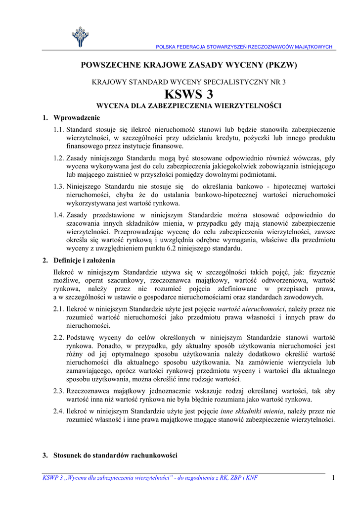 POLSKA FEDERACJA STOWARZYSZEŃ RZECZOZNAWCÓW MAJĄTKOWYCH POWSZECHNE KRAJOWE ZASADY WYCENY (PKZW) KRAJOWY STANDARD WYCENY SPECJALISTYCZNY NR 3 KSWS 3 WYCENA DLA ZABEZPIECZENIA WIERZYTELNOŚCI 1. Wprowadzenie 1.1. Standard stosuje się ilekroć nieruchomość stanowi lub będzie stanowiła zabezpieczenie wierzytelności, w szczególności przy udzielaniu kredytu, pożyczki lub innego produktu finansowego przez instytucje finansowe. 1.2. Zasady niniejszego Standardu mogą być stosowane odpowiednio również wówczas, gdy wycena wykonywana jest do celu zabezpieczenia jakiegokolwiek zobowiązania istniejącego lub mającego zaistnieć w przyszłości pomiędzy dowolnymi podmiotami. 1.3. Niniejszego Standardu nie stosuje się do określania bankowo - hipotecznej wartości nieruchomości, chyba że do ustalania bankowo-hipotecznej wartości nieruchomości wykorzystywana jest wartość rynkowa. 1.4. Zasady przedstawione w niniejszym Standardzie można stosować odpowiednio do szacowania innych składników mienia, w przypadku gdy mają stanowić zabezpieczenie wierzytelności. Przeprowadzając wycenę do celu zabezpieczenia wierzytelności, zawsze określa się wartość rynkową i uwzględnia odrębne wymagania, właściwe dla przedmiotu wyceny z uwzględnieniem punktu 6.2 niniejszego standardu. 2. Definicje i założenia Ilekroć w niniejszym Standardzie używa się w szczególności takich pojęć, jak: fizycznie możliwe, operat szacunkowy, rzeczoznawca majątkowy, wartość odtworzeniowa, wartość rynkowa, należy przez nie rozumieć pojęcia zdefiniowane w przepisach prawa, a w szczególności w ustawie o gospodarce nieruchomościami oraz standardach zawodowych. 2.1. Ilekroć w niniejszym Standardzie użyte jest pojęcie wartość nieruchomości, należy przez nie rozumieć wartość nieruchomości jako przedmiotu prawa własności i innych praw do nieruchomości. 2.2. Podstawę wyceny do celów określonych w niniejszym Standardzie stanowi wartość rynkowa. Ponadto, w przypadku, gdy aktualny sposób użytkowania nieruchomości jest różny od jej optymalnego sposobu użytkowania należy dodatkowo określić wartość nieruchomości dla aktualnego sposobu użytkowania. Na zamówienie wierzyciela lub zamawiającego, oprócz wartości rynkowej przedmiotu wyceny i wartości dla aktualnego sposobu użytkowania, można określić inne rodzaje wartości. 2.3. Rzeczoznawca majątkowy jednoznacznie wskazuje rodzaj określanej wartości, tak aby wartość inna niż wartość rynkowa nie była błędnie rozumiana jako wartość rynkowa. 2.4. Ilekroć w niniejszym Standardzie użyte jest pojęcie inne składniki mienia, należy przez nie rozumieć własność i inne prawa majątkowe mogące stanowić zabezpieczenie wierzytelności. 3. Stosunek do standardów rachunkowości KSWP 3 „Wycena dla zabezpieczenia wierzytelności” - do uzgodnienia z RK, ZBP i KNF 1 POLSKA FEDERACJA STOWARZYSZEŃ RZECZOZNAWCÓW MAJĄTKOWYCH Ze względu na odmienne cele wyceny operaty szacunkowe, sporządzane na potrzeby sprawozdań finansowych, nie mogą być wykorzystywane dla zabezpieczenia wierzytelności. 4. Zastosowanie Standardu 4.1 Przeprowadzając wycenę do celu zabezpieczenia wierzytelności, rzeczoznawca majątkowy powinien odnieść się do wymagań udostępnionych przez wierzycieli i w każdym przypadku, kiedy nie będą one uwzględnione rzeczoznawca powinien zaznaczyć ten fakt w operacie szacunkowym. Nieuwzględnienie wymagań może być spowodowane m.in. brakiem możliwości uzyskania informacji przez rzeczoznawcę majątkowego dotyczących wymagań wierzyciela lub niezgodnością tych wymagań z przepisami prawa i/lub standardami zawodowymi. 4.2. Uwzględniając wymogi stawiane rzeczoznawcy majątkowemu przy sporządzaniu operatu szacunkowego, należy ujawnić poznane w trakcie szacowania nieruchomości okoliczności ograniczające jej przydatność dla zabezpieczenia wierzytelności. Rzeczoznawca majątkowy ma również obowiązek, na podstawie dostępnych źródeł informacji i znajomości rynku, wskazać obszary ryzyka związanego z nieruchomością jako przedmiotem zabezpieczenia, w tym z przewidywanymi zmianami na danym rynku nieruchomości oraz ryzykiem związanym z oceną danej nieruchomości przez inwestorów wraz z ogólną opinią na temat wpływu powyższego na poziom wartości wycenianej nieruchomości w przyszłości. Powyższe dodatkowe informacje przedstawia się w formie , załącznika do operatu szacunkowego. 4.3. Określanie wartości należy odróżnić od szacowania ryzyka kredytowego. Szczegółowa interpretacja i analiza ryzyka, związanego z przedmiotem zabezpieczenia, o którym mowa w pkt. 4.2., może być dla rzeczoznawcy majątkowego dodatkową czynnością lub przedmiotem odrębnego opracowania, niestanowiącego operatu szacunkowego. Rzeczoznawca majątkowy może, na zamówienie wierzyciela lub zamawiającego, w miarę posiadanych kompetencji, w ramach dodatkowej usługi, wykonać analizę wrażliwości. Analiza pozwoli na pełniejszą ocenę ryzyka przyjęcia konkretnej nieruchomości jako zabezpieczenia wierzytelności. W ramach tej analizy należy przedstawić wrażliwość wartości nieruchomości wycenianej na zmiany parametrów wejściowych, wpływających na tę wartość. Ostateczna ocena ryzyka, związanego z zabezpieczeniem wierzytelności na nieruchomości, należy w każdym przypadku do wierzyciela. 5. Wymagania szczegółowe 5.1. Nieruchomości, stanowiące zabezpieczenie wierzytelności, mogą wymagać różnego potraktowania z punktu widzenia procesu i procedur wyceny. Wycenę można przeprowadzić z uwzględnieniem wewnętrznych uregulowań stosowanych przez wierzycieli, o których mowa w punkcie 4.1 o ile uregulowania te nie są sprzeczne z przepisami prawa i PKZW. 5.2. Przy szacowaniu nieruchomości na potrzeby zabezpieczenia wierzytelności mogą wystąpić w szczególności przypadki wskazane w punktach od 5.3 do 5.6. 5.3. Nieruchomości inwestycyjne, z
