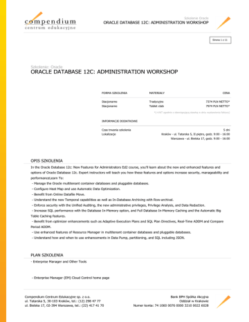 Szkolenie Oracle ORACLE DATABASE 12C: ADMINISTRATION WORKSHOP Strona 1 z 11 Szkolenie: Oracle ORACLE DATABASE 12C: ADMINISTRATION WORKSHOP FORMA SZKOLENIA MATERIAŁY CENA Stacjonarne Tradycyjne 7374 PLN NETTO* Stacjonarne Tablet ctab 7974 PLN NETTO* *(+VAT zgodnie z obowiązującą stawką w dniu wystawienia faktury) INFORMACJE DODATKOWE Czas trwania szkolenia 5 dni Lokalizacje Kraków - ul. Tatarska 5, II piętro, godz. 9:00 - 16:00 Warszawa - ul. Bielska 17, godz. 9:00 - 16:00 OPIS SZKOLENIA In the Oracle Database 12c: New Features for Administrators Ed2 course, you'll learn about the new and enhanced features and options of Oracle Database 12c. Expert instructors will teach you how these features and options increase security, manageability and performanceLearn To: - Manage the Oracle multitenant container databases and pluggable databases. - Configure Heat Map and use Automatic Data Optimization. - Benefit from Online Datafile Move. - Understand the new Temporal capabilities as well as In-Database Archiving with Row-archival. - Enforce security with the Unified Auditing, the new administrative privileges, Privilege Analysis, and Data Redaction. - Increase SQL performance with the Database In-Memory option, and Full Database In-Memory Caching and the Automatic Big Table Caching features. - Benefit from optimizer enhancements such as Adaptive Execution Plans and SQL Plan Directives, Real-Time ADDM and Compare Period ADDM. - Use enhanced features of Resource Manager in multitenant container databases and pluggable databases. - Understand how and when to use enhancements in Data Pump, partitioning, and SQL including JSON. PLAN SZKOLENIA - Enterprise Manager and Other Tools - Enterprise Manager (EM) Cloud Control home page Compendium Centrum Edukacyjne sp. z o.o. ul. Tatarska 5, 30-103 Kraków, tel.: (12) 298 47 77 ul. Bielska 17, 02-394 Warszawa, tel.: (22) 417 41 70 Bank BPH Spółka Akcyjna Oddział w Krakowie Numer konta: 74 1060 0076 0000 3210 0022 6028 Szkolenie Oracle ORACLE DATABASE 12C: ADMINISTRATION WORKSHOP Strona 2 z 11 - Enterprise Manager Express home page versus Enterprise Manager Database Control - SQL Developer with new functionalities - OUI, DBCA - Basics of Multitenant Container Database (CDB) - Benefits of the multitenant architecture - Differences between the root container and pluggable database containers - Structure of the root - Structure of Pluggable Database (PDB) - CDB_xxx and DBA_xxx views - Impacts in Security, Data Guard, Oracle GoldenGate, Oracle Streams, XStream, and Scheduler - Configuring and Creating CDB and PDBs - Tools: DBCA and SQL*Plus - Configuration and creation of CDB - Exploring the Structure (CDB_xxx views and EM) - Tools used: SQL Developer, DBCA and SQL*Plus and EM Database Express - Create a new PDB from PDB$SEED - Create a PDB from a non-CDB - Clone a PDB into the same CDB or into another CDB using DB links Compendium Centrum Edukacyjne sp. z o.o. ul. Tatarska 5, 30-103 Kraków, tel.: (12) 298 47 77 ul. Bielska 17, 02-394 Warszawa, tel.: (22) 417 41 70 Bank BPH Spółka Akcyjna Oddział w Krakowie Numer konta: 74 1060 0076 0000 3210 0022 6028 Szkolenie Oracle ORACLE DATABASE 12C: ADMINISTRATION WORKSHOP Strona 3 z 11 - Plug in an unplugged PDB - Managing CDB and PDBs - Connect to CDB as administrator - Connect to a PDB using a service name - Start up a CDB - Open / Close a PDB (SQL*Plus, srvctl, EM) - Open / Close all PDBs - Shut down a CDB - Preserve or discard the PDBs open mode when the CDB restarts - Change PDB state - Managing Tablespaces, Common and Local Users, Privileges and Roles - Create permanent tablespaces in the root and PDBs - Manage common and local schemas and users in the root and PDBs - Manage system and object privileges to common and local grantees granted "commonly" or "locally" - Manage common and local roles granted "commonly" or "locally" - Managing Backup / Recovery / Flashback Compendium Centrum Edukacyjne sp. z o.o. ul. Tatarska 5, 30-103 Kraków, tel.: (12) 298 47 77 ul. Bielska 17, 02-394 Warszawa, tel.: (22) 417 41 70 Bank BPH Spółka Akcyjna Oddział w Krakowie Numer konta: 74 1060 0076 0000 3210 0022 6028 Szkolenie Oracle ORACLE DATABASE 12C: ADMINISTRATION WORKSHOP Strona 4 z 11 - Backup a whole CDB - Backup a PDB - Recover CDB from redo log files, control files, undo datafiles loss - Recover PDB from PDB datafiles loss - Flashback at CDB level - Explain the two methods of migration - Online Datafile Move and Automatic Data Optimization - Data classification in 12c : tablespace, group, object, row levels - Configure heat map - Automatic movement and compression - Compression levels and types - Policy declaration: simple declarative SQL extension - Customized automated action execution with user-defined function - Execution in scheduled maintenance windows and by MMON - Customized schedule with DBMS_ILM package - In-Database Archiving - Challenges of old data in tables and 11g solutions - In-database archiving new solutions Compendium Centrum Edukacyjne sp. z o.o. ul. Tatarska 5, 30-103 Kraków, tel.: (12) 298 47 77 ul. Bielska 17, 02-394 Warszawa, tel.: (22) 417 41 70 Bank BPH Spółka Akcyjna Oddział w Krakowie Numer konta: 74 1060 0076 0000 3210 0022 6028 Szkolenie Oracle ORACLE DATABASE 12C: ADMINISTRATION WORKSHOP Strona 5 z 11 - Use ROW ARCHIVAL clause to enable row lifecycle state for applications - Set ROW ARCHIVAL VISIBILITY for session level visibility control - Use predicate on ORA_ARCHIVE_STATE column - Temporal Validity versus Temporal History (Transaction Time of FDA) - New clause of CREATE / ALTER TABLE to set a Temporal Validity: PERIOD FOR - New SQL temporal data type - Auditing Enhancements - Review of 11g R2 audit trail implementation - Overview of the Unified Audit Trail - Enabling the Unified Audit Trail - Creating a separate tablespace for the unified audit trail - Granting the AUDIT_ADMIN role to a user for audit trail configuration and management - Configuring the Unified Audit Tra