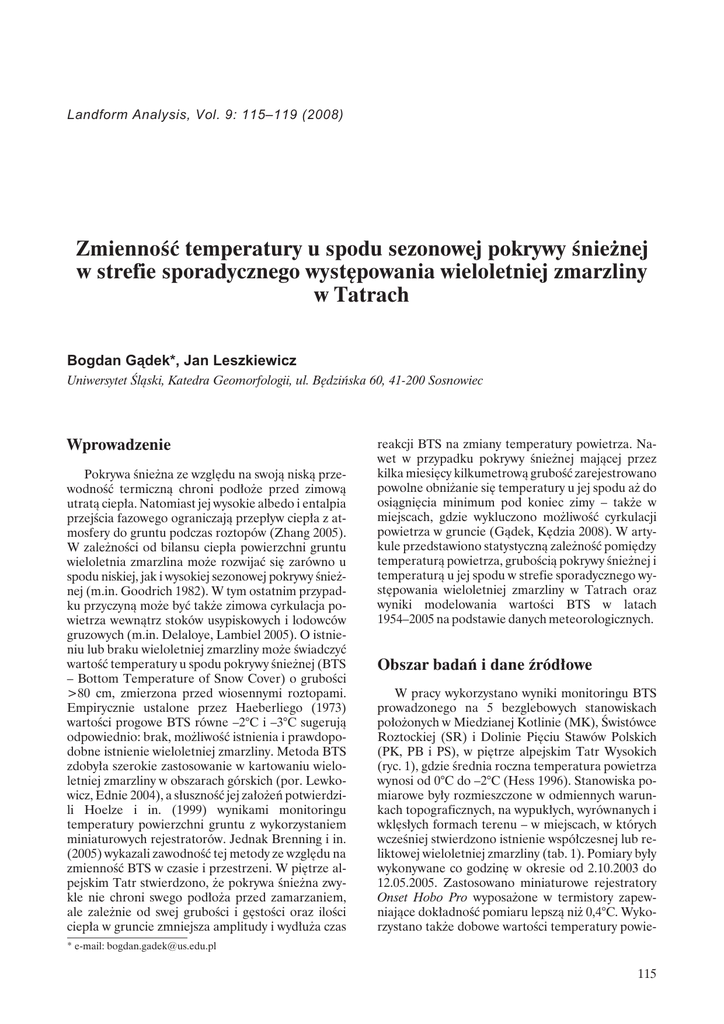 Landform Analysis, Vol. 9: 115–119 (2008) Zmienność temperatury u spodu sezonowej pokrywy śnieżnej w strefie sporadycznego występowania wieloletniej zmarzliny w Tatrach Bogdan G¹dek*, Jan Leszkiewicz Uniwersytet Śląski, Katedra Geomorfologii, ul. Będzińska 60, 41-200 Sosnowiec Wprowadzenie Pokrywa śnieżna ze względu na swoją niską przewodność termiczną chroni podłoże przed zimową utratą ciepła. Natomiast jej wysokie albedo i entalpia przejścia fazowego ograniczają przepływ ciepła z atmosfery do gruntu podczas roztopów (Zhang 2005). W zależności od bilansu ciepła powierzchni gruntu wieloletnia zmarzlina może rozwijać się zarówno u spodu niskiej, jak i wysokiej sezonowej pokrywy śnieżnej (m.in. Goodrich 1982). W tym ostatnim przypadku przyczyną może być także zimowa cyrkulacja powietrza wewnątrz stoków usypiskowych i lodowców gruzowych (m.in. Delaloye, Lambiel 2005). O istnieniu lub braku wieloletniej zmarzliny może świadczyć wartość temperatury u spodu pokrywy śnieżnej (BTS – Bottom Temperature of Snow Cover) o grubości >80 cm, zmierzona przed wiosennymi roztopami. Empirycznie ustalone przez Haeberliego (1973) wartości progowe BTS równe –2°C i –3°C sugerują odpowiednio: brak, możliwość istnienia i prawdopodobne istnienie wieloletniej zmarzliny. Metoda BTS zdobyła szerokie zastosowanie w kartowaniu wieloletniej zmarzliny w obszarach górskich (por. Lewkowicz, Ednie 2004), a słuszność jej założeń potwierdzili Hoelze i in. (1999) wynikami monitoringu temperatury powierzchni gruntu z wykorzystaniem miniaturowych rejestratorów. Jednak Brenning i in. (2005) wykazali zawodność tej metody ze względu na zmienność BTS w czasie i przestrzeni. W piętrze alpejskim Tatr stwierdzono, że pokrywa śnieżna zwykle nie chroni swego podłoża przed zamarzaniem, ale zależnie od swej grubości i gęstości oraz ilości ciepła w gruncie zmniejsza amplitudy i wydłuża czas reakcji BTS na zmiany temperatury powietrza. Nawet w przypadku pokrywy śnieżnej mającej przez kilka miesięcy kilkumetrową grubość zarejestrowano powolne obniżanie się temperatury u jej spodu aż do osiągnięcia minimum pod koniec zimy – także w miejscach, gdzie wykluczono możliwość cyrkulacji powietrza w gruncie (Gądek, Kędzia 2008). W artykule przedstawiono statystyczną zależność pomiędzy temperaturą powietrza, grubością pokrywy śnieżnej i temperaturą u jej spodu w strefie sporadycznego występowania wieloletniej zmarzliny w Tatrach oraz wyniki modelowania wartości BTS w latach 1954–2005 na podstawie danych meteorologicznych. Obszar badań i dane źródłowe W pracy wykorzystano wyniki monitoringu BTS prowadzonego na 5 bezglebowych stanowiskach położonych w Miedzianej Kotlinie (MK), Świstówce Roztockiej (SR) i Dolinie Pięciu Stawów Polskich (PK, PB i PS), w piętrze alpejskim Tatr Wysokich (ryc. 1), gdzie średnia roczna temperatura powietrza wynosi od 0°C do –2°C (Hess 1996). Stanowiska pomiarowe były rozmieszczone w odmiennych warunkach topograficznych, na wypukłych, wyrównanych i wklęsłych formach terenu – w miejscach, w których wcześniej stwierdzono istnienie współczesnej lub reliktowej wieloletniej zmarzliny (tab. 1). Pomiary były wykonywane co godzinę w okresie od 2.10.2003 do 12.05.2005. Zastosowano miniaturowe rejestratory Onset Hobo Pro wyposażone w termistory zapewniające dokładność pomiaru lepszą niż 0,4°C. Wykorzystano także dobowe wartości temperatury powie- * e-mail: [email protected] 115 Bogdan G¹dek, Jan Leszkiewicz t X ( t, t) = Ryc. 1. Położenie obszarów badań I – Miedziana Kotlina, II – Dolina Pięciu Stawów Polskich i Świstówka Roztocka trza i grubości pokrywy śnieżnej na stacji synoptycznej IMGW na Kasprowym Wierchu (1991 m n.p.m.) z lat 1954–2005. Jest to jedyna stacja meteorologiczna w piętrze alpejskim Tatr. Metody badań W badaniach wieloletniej zmienności wartości BTS zastosowano statystyczną metodę warunków meteorologicznych poprzedzających (Leszkiewicz 1987). Obliczenia wykonano w programie Statistica (StatSoft) w trzech etapach: 1) Obliczono współczynniki korelacji (rt) pomiędzy wszystkimi dobowymi wartościami BTS na każdym stanowisku a średnimi wartościami temperatury powietrza lub grubości pokrywy śnieżnej w okresach poprzedzających. Przyjmowano krokowo narastającą długość okresów poprzedzających od 0 do 250 dni: åX t=0 t -t t+1 gdzie: X(t, τ) – średnia temperatura powietrza lub grubość pokrywy śnieżnej dla czasu poprzedzającego τ (0, 2, ...20, 24,…40, 50, 60, 80,…200, 250 dni) przyporządkowana do czasu t (kolejne dni zim 2003/2004 i 2004/2005); Xt-τ – temperatura powietrza lub grubość pokrywy śnieżnej w czasie t–τ. 2) Ujawnione zależności pomiędzy temperaturą powietrza i grubością pokrywy śnieżnej na Kasprowym Wierchu a wartościami BTS na poszczególnych stanowiskach pomiarowych opisano równaniem regresji liniowej: BTS(PT,PSn,N)stanowisko=a+b × PTτ1+ c × PSnτ2+ f + d × PTτ3+ e × PSnτ4+ N gdzie: BTS – temperatura spodu pokrywy śnieżnej, PT – temperatura powietrza poprzedzająca, PSn – grubość pokrywy śnieżnej poprzedzającej, a–f – parametry równania regresji, τ1–τ4 – statystycznie najistotniejsze okresy poprzedzające określone na podstawie macierzy [3], wynosiły one 0–28 dni (τ1 i τ2) oraz 120–250 dni (τ3 i τ4). 3) Wykorzystując model statystyczny [2] i archiwalne dane meteorologiczne z Kasprowego Wierchu obliczono wartości BTS na poszczególnych stanowiskach pomiarowych w poprzednich pięćdziesięciu latach. Założono przy tym, że: a) na początku zimy temperatura powierzchni gruntu może oscylować wokół 0°C, b) w okresie rozwoju Tabela 1. Charakterystyka miejsc pomiaru temperatury powierzchni gruntu u spodu pokrywy śnieżnej Symbol Wysokość Lokalizacja stanowiska (m a.s.l.) Miedziana Kotlina MK 2030 Występowanie wieloletniej zmarz