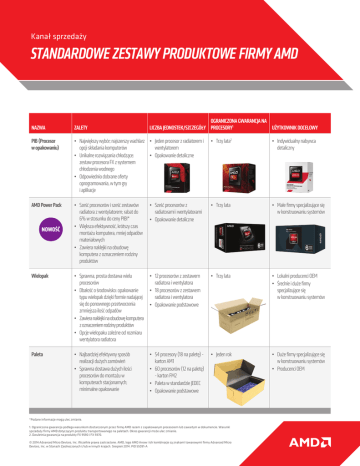 Kanał sprzedaży STANDARDOWE ZESTAWY PRODUKTOWE FIRMY AMD OGRANICZONA GWARANCJA NA LICZBA JEDNOSTEK/SZCZEGÓŁY PROCESORY1 UŻYTKOWNIK DOCELOWY NAZWA ZALETY PIB (Procesor w opakowaniu) • Największy wybór; najszerszy wachlarz • Jeden procesor z radiatorem i opcji składania komputerów wentylatorem • Unikalne rozwiązania chłodzące: • Opakowanie detaliczne zestaw procesora FX z systemem chłodzenia wodnego • Odpowiednio dobrane oferty oprogramowania, w tym gry i aplikacje • Trzy lata2 • Indywidualny nabywca detaliczny AMD Power Pack • Sześć procesorów i sześć zestawów radiatora z wentylatorem; rabat do 6% w stosunku do ceny PIB!* • Większa efektywność, krótszy czas montażu komputera, mniej odpadów materiałowych • Zawiera naklejki na obudowę komputera z oznaczeniem rodziny produktów • Sześć procesorów z radiatorami i wentylatorami • Opakowanie detaliczne • Trzy lata • Małe firmy specjalizujące się w konstruowaniu systemów Wielopak • Sprawna, prosta dostawa wielu • 12 procesorów z zestawem procesorów radiatora i wentylatora • Dbałość o środowisko: opakowanie • 18 procesorów z zestawem typu wielopak dzięki formie nadającej radiatora i wentylatora się do ponownego przetworzenia • Opakowanie podstawowe zmniejsza ilość odpadów • Zawiera naklejki na obudowę komputera z oznaczeniem rodziny produktów • Opcje wielopaku zależne od rozmiaru wentylatora radiatora • Trzy lata • Lokalni producenci OEM • Średnie i duże firmy specjalizujące się w konstruowaniu systemów Paleta • Najbardziej efektywny sposób realizacji dużych zamówień • Sprawna dostawa dużych ilości procesorów do montażu w komputerach stacjonarnych; minimalne opakowanie • Jeden rok • Duże firmy specjalizujące się w konstruowaniu systemów • Producenci OEM NOWOŚĆ • 54 procesory (18 na paletę) karton AM1 • 60 procesorów (12 na paletę) - karton FM2 • Paleta w standardzie JEDEC • Opakowanie podstawowe *Podane informacje mogą ulec zmianie. 1. Ograniczona gwarancja podlega warunkom dostarczonym przez firmę AMD razem z zapakowanym procesorem lub zawartym w dokumencie. Warunki sprzedaży firmy AMD dotyczącym produktu transportowanego na paletach. Okres gwarancji może ulec zmianie. 2. Dwuletnia gwarancja na produkty FX 9590 i FX 9370. © 2014 Advanced Micro Devices, Inc. Wszelkie prawa zastrzeżone. AMD, logo AMD Arrow i ich kombinacje są znakami towarowymi firmy Advanced Micro Devices, Inc. w Stanach Zjednoczonych i/lub w innych krajach. Sierpień 2014. PID 55091-A