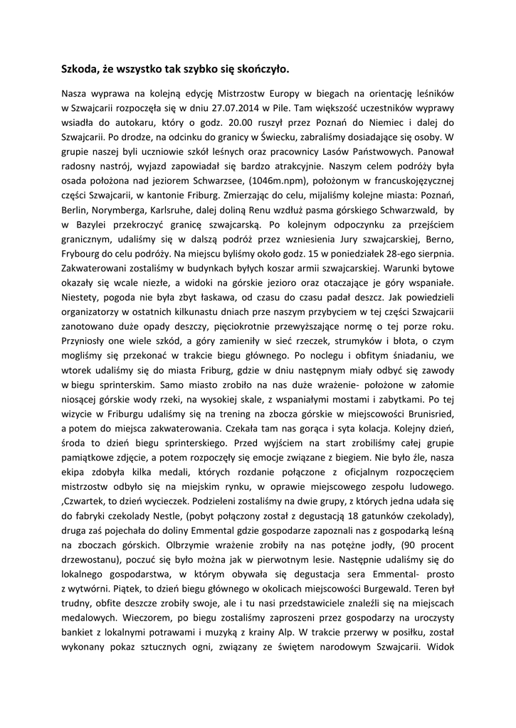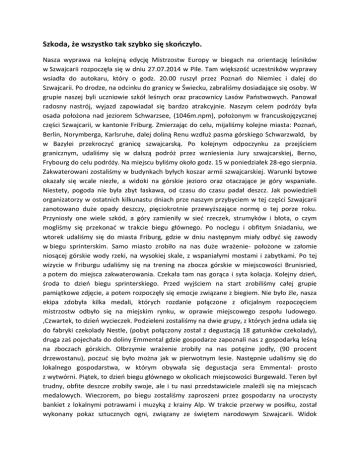 Szkoda, że wszystko tak szybko się skończyło. Nasza wyprawa na kolejną edycję Mistrzostw Europy w biegach na orientację leśników w Szwajcarii rozpoczęła się w dniu 27.07.2014 w Pile. Tam większość uczestników wyprawy wsiadła do autokaru, który o godz. 20.00 ruszył przez Poznań do Niemiec i dalej do Szwajcarii. Po drodze, na odcinku do granicy w Świecku, zabraliśmy dosiadające się osoby. W grupie naszej byli uczniowie szkół leśnych oraz pracownicy Lasów Państwowych. Panował radosny nastrój, wyjazd zapowiadał się bardzo atrakcyjnie. Naszym celem podróży była osada położona nad jeziorem Schwarzsee, (1046m.npm), położonym w francuskojęzycznej części Szwajcarii, w kantonie Friburg. Zmierzając do celu, mijaliśmy kolejne miasta: Poznań, Berlin, Norymberga, Karlsruhe, dalej doliną Renu wzdłuż pasma górskiego Schwarzwald, by w Bazylei przekroczyć granicę szwajcarską. Po kolejnym odpoczynku za przejściem granicznym, udaliśmy się w dalszą podróż przez wzniesienia Jury szwajcarskiej, Berno, Frybourg do celu podróży. Na miejscu byliśmy około godz. 15 w poniedziałek 28-ego sierpnia. Zakwaterowani zostaliśmy w budynkach byłych koszar armii szwajcarskiej. Warunki bytowe okazały się wcale niezłe, a widoki na górskie jezioro oraz otaczające je góry wspaniałe. Niestety, pogoda nie była zbyt łaskawa, od czasu do czasu padał deszcz. Jak powiedzieli organizatorzy w ostatnich kilkunastu dniach prze naszym przybyciem w tej części Szwajcarii zanotowano duże opady deszczy, pięciokrotnie przewyższające normę o tej porze roku. Przyniosły one wiele szkód, a góry zamieniły w sieć rzeczek, strumyków i błota, o czym mogliśmy się przekonać w trakcie biegu głównego. Po noclegu i obfitym śniadaniu, we wtorek udaliśmy się do miasta Friburg, gdzie w dniu następnym miały odbyć się zawody w biegu sprinterskim. Samo miasto zrobiło na nas duże wrażenie- położone w załomie niosącej górskie wody rzeki, na wysokiej skale, z wspaniałymi mostami i zabytkami. Po tej wizycie w Friburgu udaliśmy się na trening na zbocza górskie w miejscowości Brunisried, a potem do miejsca zakwaterowania. Czekała tam nas gorąca i syta kolacja. Kolejny dzień, środa to dzień biegu sprinterskiego. Przed wyjściem na start zrobiliśmy całej grupie pamiątkowe zdjęcie, a potem rozpoczęły się emocje związane z biegiem. Nie było źle, nasza ekipa zdobyła kilka medali, których rozdanie połączone z oficjalnym rozpoczęciem mistrzostw odbyło się na miejskim rynku, w oprawie miejscowego zespołu ludowego. ,Czwartek, to dzień wycieczek. Podzieleni zostaliśmy na dwie grupy, z których jedna udała się do fabryki czekolady Nestle, (pobyt połączony został z degustacją 18 gatunków czekolady), druga zaś pojechała do doliny Emmental gdzie gospodarze zapoznali nas z gospodarką leśną na zboczach górskich. Olbrzymie wrażenie zrobiły na nas potężne jodły, (90 procent drzewostanu), poczuć się było można jak w pierwotnym lesie. Następnie udaliśmy się do lokalnego gospodarstwa, w którym obywała się degustacja sera Emmental- prosto z wytwórni. Piątek, to dzień biegu głównego w okolicach miejscowości Burgewald. Teren był trudny, obfite deszcze zrobiły swoje, ale i tu nasi przedstawiciele znaleźli się na miejscach medalowych. Wieczorem, po biegu zostaliśmy zaproszeni przez gospodarzy na uroczysty bankiet z lokalnymi potrawami i muzyką z krainy Alp. W trakcie przerwy w posiłku, został wykonany pokaz sztucznych ogni, związany ze świętem narodowym Szwajcarii. Widok kolorowych ogni odbijających się w wodach jeziora i echo odbijające się od gór robiły niesamowite wrażenie. Po uroczystości udaliśmy się na zasłużony odpoczynek. Następny dzień, sobota, był ostatnim dniem w Szwajcarii. Wczesna pobudka, śniadanie i opuszczamy gościnne koszary i udajemy się do miejscowości Plasselb na biegi sztafetowe, a potem po odpoczynku wsiadamy do autokaru i rozpoczyna się podróż powrotna do kraju. Jedziemy do Bazylei, potem doliną Renu, tym razem po stronie francuskiej wzdłuż Wogezów, Strasburg do Nieniec i dalej do Polski, do Piły. Wyjazd na tę imprezę był fantastycznym wydarzeniem, pełnym wrażeń, emocji, widoków. Szkoda, że wszystko tak szybko się skończyło. Leszek Andrzejewski (M55)