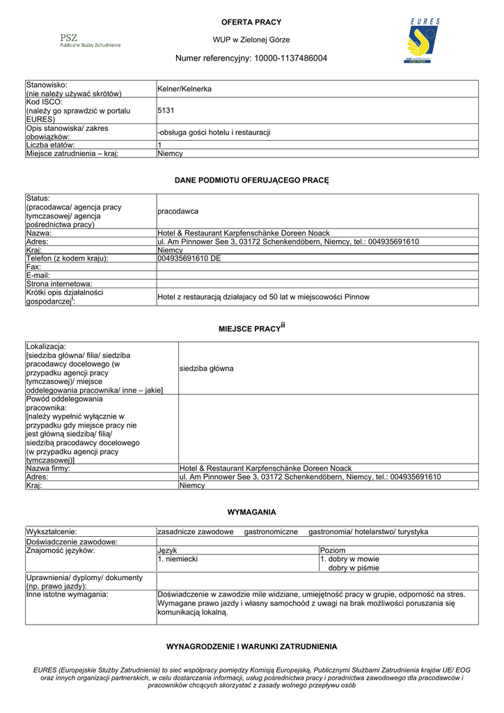 OFERTA PRACY WUP w Zielonej Górze Numer referencyjny: 10000-1137486004 Stanowisko: (nie należy używać skrótów) Kod ISCO: (należy go sprawdzić w portalu EURES) Opis stanowiska/ zakres obowiązków: Liczba etatów: Miejsce zatrudnienia – kraj: Kelner/Kelnerka 5131 -obsługa gości hotelu i restauracji 1 Niemcy DANE PODMIOTU OFERUJĄCEGO PRACĘ Status: (pracodawca/ agencja pracy tymczasowej/ agencja pośrednictwa pracy) Nazwa: Adres: Kraj: Telefon (z kodem kraju): Fax: E-mail: Strona internetowa: Krótki opis działalności gospodarczeji: pracodawca Hotel & Restaurant Karpfenschänke Doreen Noack ul. Am Pinnower See 3, 03172 Schenkendöbern, Niemcy, tel.: 004935691610 Niemcy 004935691610 DE Hotel z restauracją działajacy od 50 lat w miejscowości Pinnow MIEJSCE PRACYii Lokalizacja: [siedziba główna/ filia/ siedziba pracodawcy docelowego (w przypadku agencji pracy tymczasowej)/ miejsce oddelegowania pracownika/ inne – jakie] Powód oddelegowania pracownika: [należy wypełnić wyłącznie w przypadku gdy miejsce pracy nie jest główną siedzibą/ filią/ siedzibą pracodawcy docelowego (w przypadku agencji pracy tymczasowej)] Nazwa firmy: Adres: Kraj: siedziba główna Hotel & Restaurant Karpfenschänke Doreen Noack ul. Am Pinnower See 3, 03172 Schenkendöbern, Niemcy, tel.: 004935691610 Niemcy WYMAGANIA Wykształcenie: Doświadczenie zawodowe: Znajomość języków: Uprawnienia/ dyplomy/ dokumenty (np. prawo jazdy): Inne istotne wymagania: zasadnicze zawodowe Język 1. niemiecki gastronomiczne gastronomia/ hotelarstwo/ turystyka Poziom 1. dobry w mowie dobry w piśmie Doświadczenie w zawodzie mile widziane, umiejętność pracy w grupie, odporność na stres. Wymagane prawo jazdy i własny samochoód z uwagi na brak możliwości poruszania się komunikacją lokalną. WYNAGRODZENIE I WARUNKI ZATRUDNIENIA EURES (Europejskie Służby Zatrudnienia) to sieć współpracy pomiędzy Komisją Europejską, Publicznymi Służbami Zatrudnienia krajów UE/ EOG oraz innych organizacji partnerskich, w celu dostarczania informacji, usług pośrednictwa pracy i poradnictwa zawodowego dla pracodawców i pracowników chcących skorzystać z zasady wolnego przepływu osób Wysokość pensji brutto: Wysokość pensji netto: Waluta, w jakiej wypłacana jest pensja: Rodzaj stawki wynagrodzenia: (godzinowa/ tygodniowa/ miesięczna/ roczna/ inna) Premie: Dodatkowe świadczenia (zakwaterowanie, wyżywienie, koszty związane ze zmianą miejsca zamieszkania, koszty podróży itp.): Nazwa firmy, z którą zostanie podpisana umowa: Rodzaj umowy: (umowa o pracę, umowa zlecenia, wolontariat, praktyka zawodowa/ staż, praca zdalna, agencja pracy tymczasowej, inne): Wymiar czasu pracy (praca na pełen etat/ część etatu): Czas trwania umowy: (nieokreślony/ określony) 8,50 Liczba godzin tygodniowo: Zmiany i praca w dni wolne: Data rozpoczęcia: Inne informacje: 30,00 praca na 24 miesiąc z możliwością uzyskania umowy bezterminowej. Euro Czasowy ze stawką godzinową WYnagrodzenie od 8,50 brutto na godzinę Hotel & Restaurant Karpfenschänke Doreen Noack umowa o pracę niepełny etat Data wygaśnięcia umowy (w przypadku umowy na czas określony): określony Praca od poniedziałku do niedzieli w godzinach 11.00-23.00 (zmiany ustalene z pracownikami) SPOSÓB SKŁADANIA WNIOSKU Wymagane dokumenty (list motywacyjny, CV itp.): Język, w którym muszą być sporządzone przedkładane dokumenty: Do kogo należy wysłać dokumenty: (do pracodawcy/ doradcy EURES) Gdzie należy wysłać dokumenty: (adres, adres e-mail, nr faksu z kodem kraju itp.) Dane teleadresowe doradcy EURES lub przedstawiciela pracodawcy: (nazwisko, adres, telefon, fax, e-mail itp.) CV i świadectwa niemiecki do pracodawcy Dokumenty w języku niemieckim należy przesłać bezpośrednio do pracodawcy na adres: [email protected] Hotel & Restaurant Karpfenschänke Doreen Noack Frau Doreen Noack Am Pinnower See 3 03172 Schenkendöbern Pinnow Brandenburg Deutschland DODATKOWE INFORMACJE WAŻNOŚĆ 2016-02-23 Data publikacji: Termin przedkładania podań o pracę / zakończenia ważności oferty: Uprzejmie informujemy, że skontaktujemy się wyłącznie z wybranymi kandydatami. UWAGA: 1. Umowa z zagranicznym pracodawcą jest zawierana, co do zasady, zgodnie z prawem kraju zatrudnienia. Oznacza to, że wszystkie roszczenia odnośnie warunków, które obejmuje umowa, można kierować wyłącznie do odpowiedniego sądu w kraju zatrudnienia. Publiczne służby zatrudnienia (EURES) nie mogą pośredniczyć ani reprezentować pracownika w sądzie kraju zatrudnienia w przypadku sporu z pracodawcą. 2. Publiczne służby zatrudnienia (EURES) dokładają wszelkich starań, aby zapewnić rzetelność i wiarygodność ofert pracy zgłoszonych w lokalnym urzędzie pracy. Należy wyjaśnić, że oferta pracy została zgłoszona przez stronę trzecią i EURES nie odpowiada za ewentualne rozbieżności między warunkami pracy określonymi w ofercie pracy i warunkami oferowanymi przez potencjalnego pracodawcę. EURES (Europejskie Służby Zatrudnienia) to sieć współpracy pomiędzy Komisją Europejską, Publicznymi Służbami Zatrudnienia krajów UE/ EOG oraz innych organizacji partnerskich, w celu dostarczania informacji, usług pośrednictwa pracy i poradnictwa zawodowego dla pracodawców i pracowników chcących skorzystać z zasady wolnego przepływu osób 3. Publiczne służby zatrudnienia (EURES) informują, że będą zbierać, przetwarzać i przekazywać potencjalnym pracodawcom zgodnie z przepisami dotyczącymi ochrony danych osobowych wszystkie dane osobowe dostarczone przez osoby poszukujące pracy. iInformacje o firmie, takie jak: status prawny, sektor, typ działalności, rodzaj produktów lub świadczonych usług, data rozpoczęcia działalności gospodarczej, liczba pracowników itp. iiMiejsce, w którym będzie wykonywana praca. Należy wypełnić w przypadku gdy: 1) miejsce wykonywania pracy jest inne niż siedziba podmiotu oferującego pr