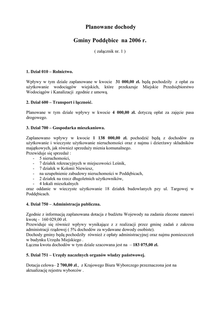 Planowane dochody Gminy Poddębice na 2006 r. ( załącznik nr. 1 ) 1. Dział 010 – Rolnictwo. Wpływy w tym dziale zaplanowane w kwocie 31 000,00 zł. będą pochodziły z opłat za uŜytkowanie wodociągów wiejskich, które przekazuje Miejskie Przedsiębiorstwo Wodociągów i Kanalizacji zgodnie z umową. 2. Dział 600 – Transport i łączność. Planowane w tym dziale wpływy w kwocie 4 000,00 zł. dotyczą opłat za zajęcie pasa drogowego. 3. Dział 700 – Gospodarka mieszkaniowa. Zaplanowano wpływy w kwocie 1 138 000,00 zł. pochodzić będą z dochodów za uŜytkowanie i wieczyste uŜytkowanie nieruchomości oraz z najmu i dzierŜawy składników majątkowych, jak równieŜ sprzedaŜy mienia komunalnego. Przewiduje się sprzedaŜ : - 5 nieruchomości, - 7 działek rekreacyjnych w miejscowości Leśnik, - 7 działek w Kolonii Niewiesz, - na uzupełnienie zabudowy nieruchomości w Poddębicach, - 2 działek na rzecz długoletnich uŜytkowników, - 4 lokali mieszkalnych oraz oddanie w wieczyste uŜytkowanie 18 działek budowlanych pzy ul. Targowej w Poddębicach. 4. Dział 750 – Administracja publiczna. Zgodnie z informacją zaplanowana dotacja z budŜetu Wojewody na zadania zlecone stanowi kwotę - 160 029,00 zł. Przewiduje się równieŜ wpływy wynikające z z realizacji przez gminę zadań z zakresu administracji rządowej ( 5% dochodów za wydawane dowody osobiste). Dochody gminy będą pochodziły równieŜ z opłaty administracyjnej oraz najmu pomieszczeń w budynku Urzędu Miejskiego . Łączna kwota dochodów w tym dziale szacowana jest na – 183 075,00 zł. 5. Dział 751 – Urzędy naczelnych organów władzy państwowej. Dotacja celowa– 2 700,00 zł., z Krajowego Biura Wyborczego przeznaczona jest na aktualizację rejestru wyborców . 6. Dział 754 – Bezpieczeństwo publiczne. Dotację celową przeznaczoną na realizację zadań z zakresu obrony cywilnej zgodnie z informacją Urzędu Wojewódzkiego oszacowano na kwotę – 1 600,00 zł. 7. Dział 756 – Dochody od osób prawnych, fizycznych i innych jednostek nieposiadających osobowości prawnej. Łączna kwota planowanych dochody stanowi kwotę – 8 366 247,00 zł. Zaplanowane wpływy uwzględniają zmiany przyjętych stawek podatkowych. Wprowadzono równieŜ dane wynikające z informacji Ministerstwa Finansów w zakresie planowanych subwencji i udziału gminy w podatku dochodowym od osób fizycznych . Dochody w tym dziale obejmują teŜ przewidywane wpływy z podatków pobieranych przez urzędy skarbowe i przekazywanych na rachunek gminy w wielkościach wynikających z informacji Urzędu Skarbowego . Rozdział 75601 – Podatek od działalności gospodarczej opłacanej w formie karty podatkowej został oszacowany na kwotę 43 000,00 zł. Rozdział 75615 – Wpływy z podatku rolnego leśnego, podatku od czynności cywilnoprawnych, podatku od opłat lokalnych od osób prawnych i innych jednostek organizacyjnych zaplanowano na kwotę – 2 171 100,00 zł. Rozdział 75616 – Wpływy z podatku rolnego , leśnego, podatku od spadków i darowizn, podatku od czynności cywilnoprawnych oraz podatków i opłat lokalnych od osób fizycznych przyjęto do planu w wysokości – 1 896 600,00 zł. Rozdział 75618 – Wpływy z innych opłat stanowiących dochody gminy obejmują planowane dochody z opłaty skarbowej w kwocie - 550 000,00 zł. Rozdział 75621 – Udziały gmin w podatkach stanowiących dochód budŜetu państwa obejmują : - oszacowany przez Ministerstwo Finansów podatek dochodowy od osób fizycznych – 3 525 547,00 zł. - podatek dochodowy od osób prawnych przyjęty na podstawie informacji Urzędu Skarbowego oraz wykonania za rok 2004 – 180 000,00zł. 8. Dział 758 – RóŜne rozliczenia. Przyjęto oszacowaną dla budŜetu przez Ministerstwo Finansów część : - oświatową subwencji ogólnej - 6 139 164,00 zł. - wyrównawczą subwencji ogólnej - 3 844 066,00 zł. - równowaŜącą subwencji ogólnej - 195 177,00 zł. Zaplanowano równieŜ wpływy z tytułu oprocentowania środków gromadzonych na rachunkach bankowych. Łączna kwota dochodów wynosi 10 183 407,00 zł. 9. Dział 801 – Oświata i wychowanie. Dochody w tym dziale w kwocie - 333 757,00 zł. wynikają z zaplanowanych: - wpływów z najmu hali sportowej i lokali w budynkach szkolnych zaplanowanych na kwotę 36 133,00 zł. - odpłatności za wyŜywienie dzieci w przedszkolu i opłaty stałej (czesne) wnoszonej jako partycypacja w kosztach utrzymania przedszkola – na kwotę 297 624,00 zł. 10. Dział 851 – Ochrona zdrowia. Wpływy z tytułu opłat w wysokości – 185 000,00 zł. za zezwolenie na sprzedaŜ alkoholu zaplanowano 11. Dział 852 – Pomoc społeczna. Dotacja z budŜetu Wojewody na: - zadania zlecone z zakresu pomocy społecznej została zaplanowana w kwocie – 3 926 968,00 zł. - własne zadania bieŜące 337 246,00 zł, Ogółem dochody tego działu szacuje się na - 4 264 214,00 zł. 12. Dział 854 – Edukacyjna opieka wychowawcza. Dochody w tym dziale szkolnych. 151 000,00 zł. dotyczą odpłatności za posiłki w stołówkach 13. Dział 900 – Gospodarka komunalna. Przewidywane dochody pochodzić będą z wpływów z tytułu korzystania z szaletu miejskiego – 6 000,00 zł. Dochody ogółem oszacowano na kwotę 24 850 000,00 zł. Wiceprzewodniczący Rady Miejskiej Ryszard Olejniczak