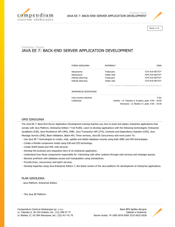 Szkolenie Oracle JAVA EE 7: BACK-END SERVER APPLICATION DEVELOPMENT Strona 1 z 8 Szkolenie: Oracle JAVA EE 7: BACK-END SERVER APPLICATION DEVELOPMENT FORMA SZKOLENIA MATERIAŁY CENA Stacjonarne Tradycyjne 7375 PLN NETTO* Stacjonarne Tablet ctab 7975 PLN NETTO* Metoda dlearning Tradycyjne 7375 PLN NETTO* Metoda dlearning Tablet ctab 7375 PLN NETTO* *(+VAT zgodnie z obowiązującą stawką w dniu wystawienia faktury) INFORMACJE DODATKOWE Czas trwania szkolenia 5 dni Lokalizacje Kraków - ul. Tatarska 5, II piętro, godz. 9:00 - 16:00 Warszawa - ul. Bielska 17, godz. 9:00 - 16:00 OPIS SZKOLENIA The Java EE 7: Back-End Server Application Development training teaches you how to build and deploy enterprise applications that comply with Java Platform, Enterprise Edition 7 Full Profile. Learn to develop applications with the following technologies: Enterprise JavaBeans (EJB), Java Persistence API (JPA), JDBC, Java Transaction API (JTA), Contexts and Dependency Injection (CDI), Java Message Service (JMS), Bean Validation, Batch API, Timer services, Java EE Concurrency and more.Learn To: - Use Java EE 7 technologies to create, read, update and delete database records using both JDBC and JPA technologies. - Create a flexible component model using EJB and CDI technology. - Create SOAP-based and XML web services. - Develop the business and integration tiers of an enterprise application. - Understand how those components responsible for: interacting with other systems through web services and message queues. - Become proficient with database access and manipulation using transactions. - Provide timer, concurrency and batch services. - Develop expertise using Java Enterprise Edition 7, the latest version of the Java platform for development of enterprise applications. PLAN SZKOLENIA - Java Platform, Enterprise Edition - The Java EE Platform Compendium Centrum Edukacyjne sp. z o.o. ul. Tatarska 5, 30-103 Kraków, tel.: (12) 298 47 77 ul. Bielska 17, 02-394 Warszawa, tel.: (22) 417 41 70 Bank BPH Spółka Akcyjna Oddział w Krakowie Numer konta: 74 1060 0076 0000 3210 0022 6028 Szkolenie Oracle JAVA EE 7: BACK-END SERVER APPLICATION DEVELOPMENT Strona 2 z 8 - The needs of enterprise application developers - Java EE specifications - A comparison of services and libraries - Java EE application tiers and architecture - Enterprise Development Tools and Applications - The purpose of an application server - Properties of Java EE components - The development process of Java EE applications - Configuring and deploying Java EE applications - Java Beans, Annotations and Logging - Java SE features in Java EE applications - Creating POJO JavaBeans components - Using logging - Using common Java annotations - Developing custom annotations - The role of annotations in Java EE applications Compendium Centrum Edukacyjne sp. z o.o. ul. Tatarska 5, 30-103 Kraków, tel.: (12) 298 47 77 ul. Bielska 17, 02-394 Warszawa, tel.: (22) 417 41 70 Bank BPH Spółka Akcyjna Oddział w Krakowie Numer konta: 74 1060 0076 0000 3210 0022 6028 Szkolenie Oracle JAVA EE 7: BACK-END SERVER APPLICATION DEVELOPMENT Strona 3 z 8 - XML Programming with JAXB - The benefits of XML - XML namespaces and schemas - Java XML APIs - The Java XML Binding API (JAXB) - Reading and writing XML documents with JAXB - xjc: the JAXB binding compiler - JAXB annotations - SOAP Web Services with JAX-WS - Overview of SOAP - Overview of WSDL files - Comparing WSDL-first and code-first design approaches - Writing a JAX-WS web service - Generating WSDL from a Java class - Creating JAX-WS web service clients - Java Naming and Directory (JNDI) Services - What is JNDI? - Naming service concepts Compendium Centrum Edukacyjne sp. z o.o. ul. Tatarska 5, 30-103 Kraków, tel.: (12) 298 47 77 ul. Bielska 17, 02-394 Warszawa, tel.: (22) 417 41 70 Bank BPH Spółka Akcyjna Oddział w Krakowie Numer konta: 74 1060 0076 0000 3210 0022 6028 Szkolenie Oracle JAVA EE 7: BACK-END SERVER APPLICATION DEVELOPMENT Strona 4 z 8 - Directory service concepts - JNDI packages - Using JNDI to look up JDBC and EJB components in Java EE - The EJB Component Model - The role EJB components play in Java EE appplications - The role of the EJB container - EJB changes in Java EE 7 - Local, distributed and no-client EJB client access views - EJB Session types - Stateless, Stateful and Singleton EJBs - Session bean packaging and deploying - Contexts and Dependency Injection - What is dependency injection? - Using Qualifiers - The beans.xml file and Alternatives - Using Producers and Disposers - Using Interceptors - Using Events and Stereotypes Compendium Centrum Edukacyjne sp. z o.o. ul. Tatarska 5, 30-103 Kraków, tel.: (12) 298 47 77 ul. Bielska 17, 02-394 Warszawa, tel.: (22) 417 41 70 Bank BPH Spółka Akcyjna Oddział w Krakowie Numer konta: 74 1060 0076 0000 3210 0022 6028 Szkolenie Oracle JAVA EE 7: BACK-END SERVER APPLICATION DEVELOPMENT Strona 5 z 8 - Java Message Service - What is the Java Message Service? - Why do we need JMS? - JMS Overview - Point-to-point messaging architecture - Publish/subscribe messaging architecture - Message producers and consumers - Queues and topics - Durable vs. non-durable subscriptions - Message-driven Beans - The life cycle of a message-driven bean - Creating a message-driven bean - Creating life cycle handlers for message-driven beans - Configuring a message-driven bean - Java EE Concurrency - Concurrency in Java EE Compendium Centrum Edukacyjne sp. z o.o. ul. Tatarska 5, 30-103 Kraków, tel.: (12) 298 47 77 ul. Bielska 17, 02-394 Warszawa, tel.: (22) 417 41 70 Bank BPH Spółka Akcyjna Oddział w Krakowie Numer konta: 74 1060 0076 0000 3210 0022 6028 Szkolenie Oracle JAVA EE 7: BACK-END SERVER APPLICATION DEVELOPMENT Strona 6 z 8 - Asynchronous EJBs - Managed Executors - JDBC in Java EE Environments - Overview of the JDBC API - Using CDI to inject a JDBC resource in a Java EE component - The Data Access Object pattern - Transactions in Java EE Environments - Wh